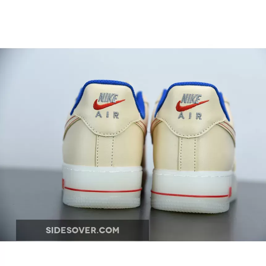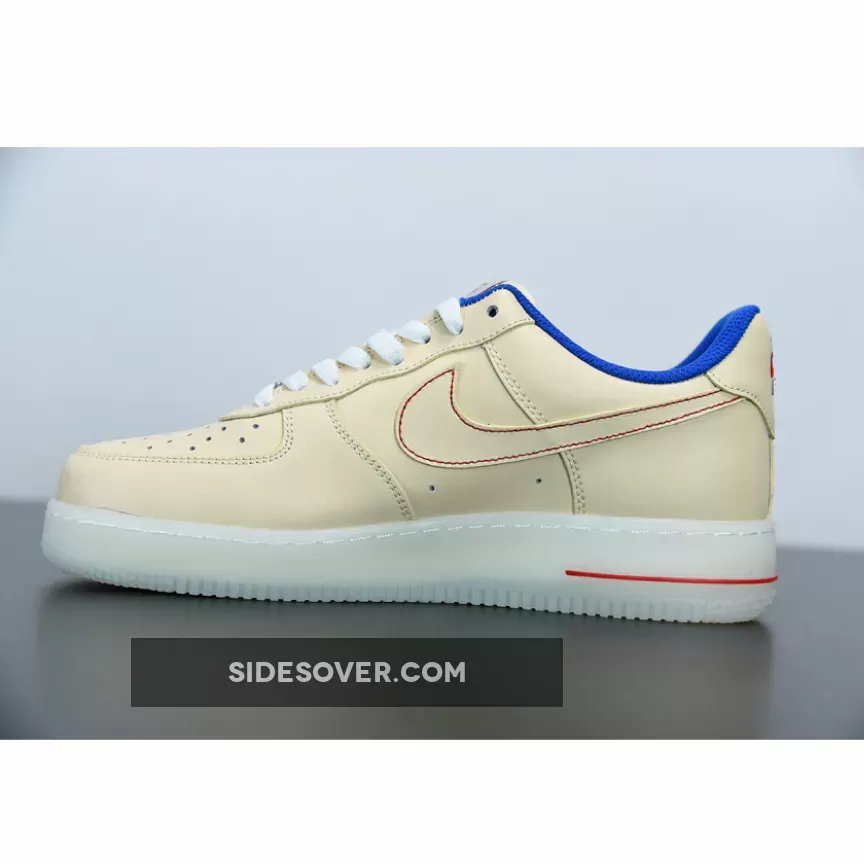 the pair quickly sets itself apart with a number of contrast threads. The swoosh, though cut from the same natural cream as the rest of the smooth leather construction, accents its edge with a bright red, a tone that also dresses the various branding seen at the barely see-through tooling below, the embroidery of the heel tab behind, and the tongue tab spaces above. Elsewhere, dark blues complement atop the lining while the lace and dubrae stick borrow from existing parts with white and silver metallic, respectively.