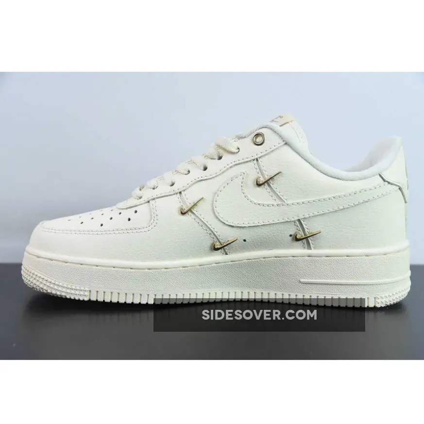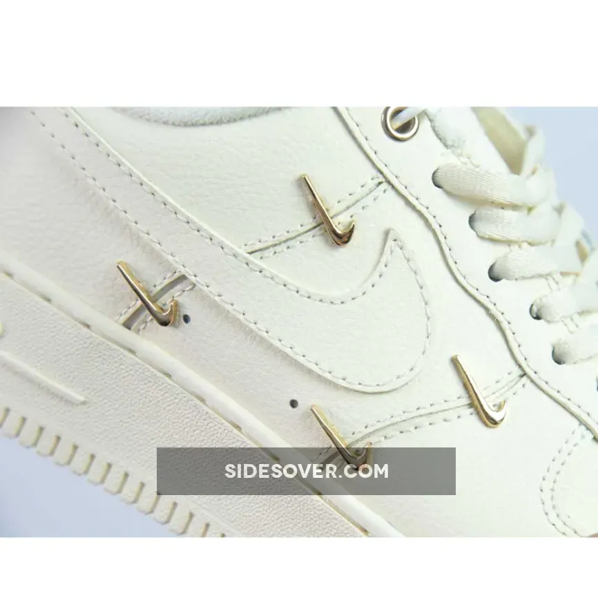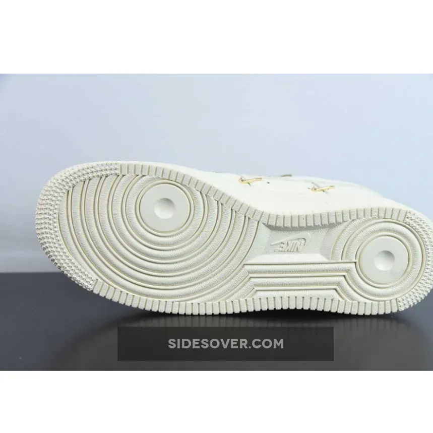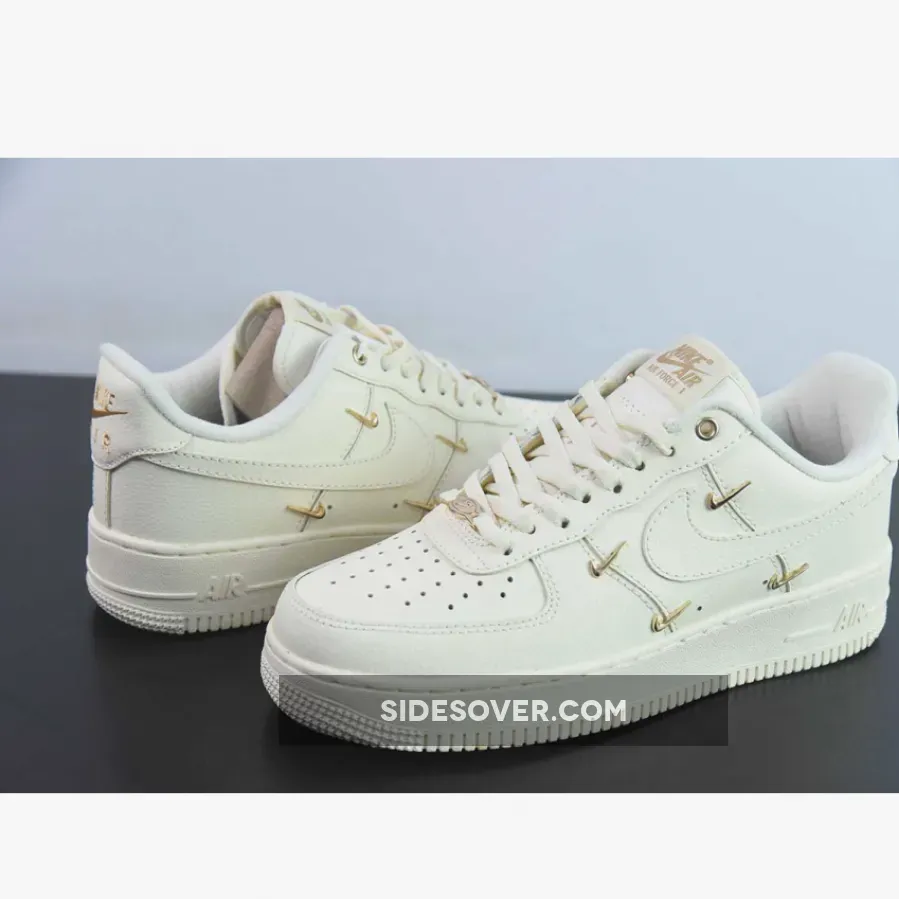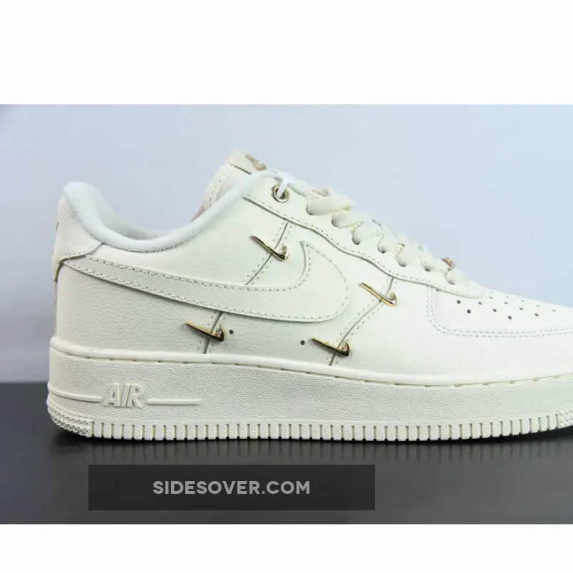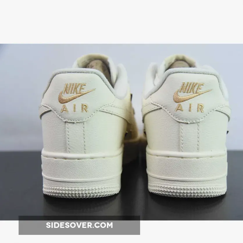 The Nike Air Force 1 Low Sail Metallic Gold represents a stylish and highly sought-after sneaker. Though largely reserved in its colorway, the pair does feature a number of bold, expensive looking details. For starters, It showcases a unique blend of colors and metallic accents. This particular colourway brings together an off-white sail upper with intricate metallic gold detailing . The topmost eyelet, dubraes, and branding are dressed to complement, adding dollar signs to what would otherwise be a simple, “Sail” dominant make-up.