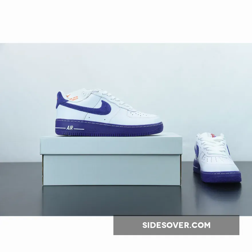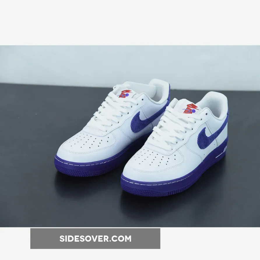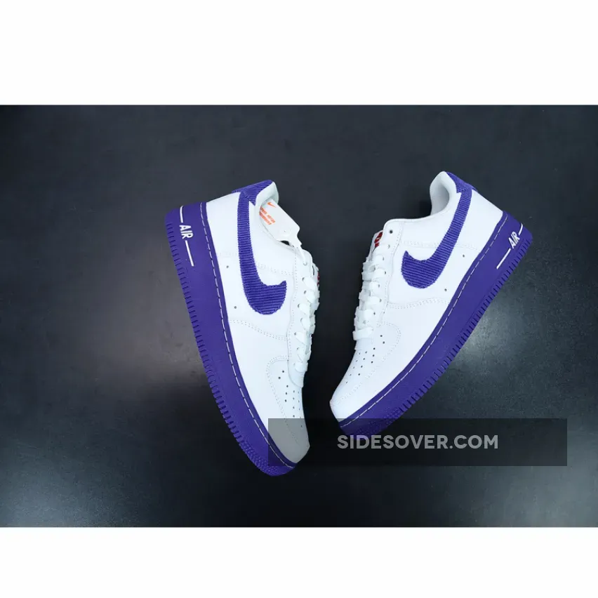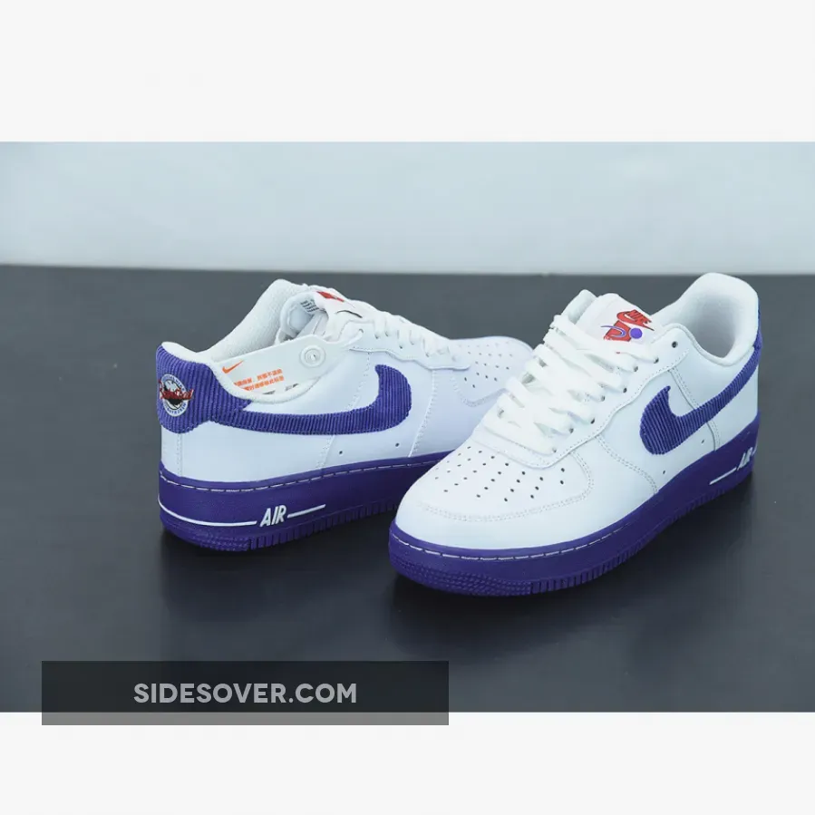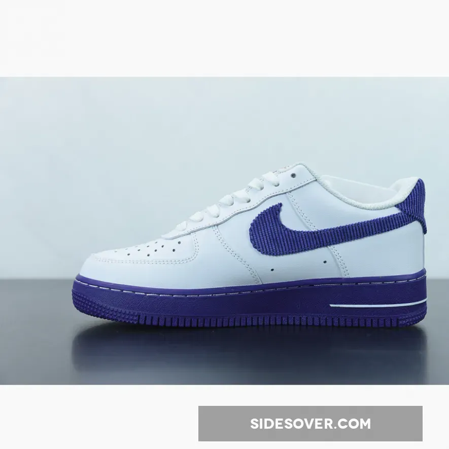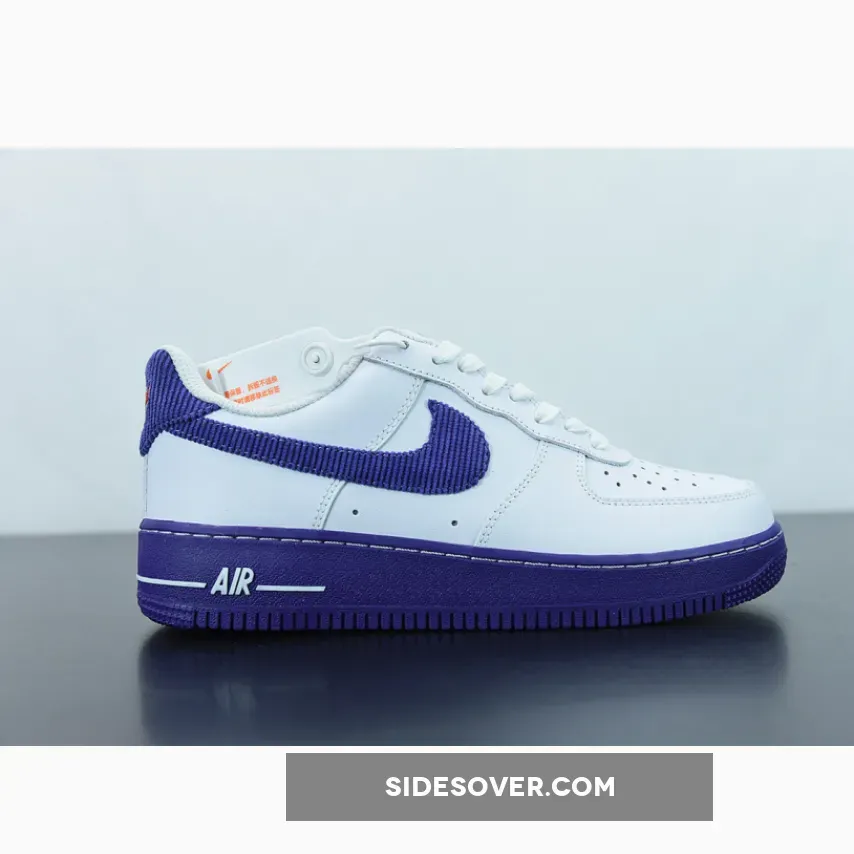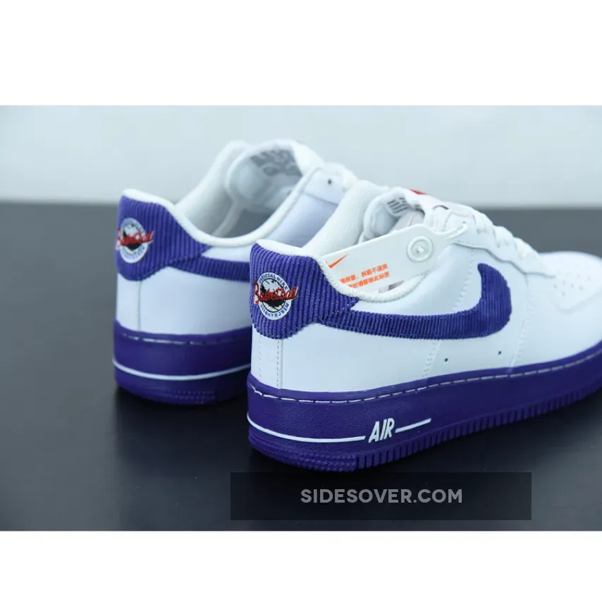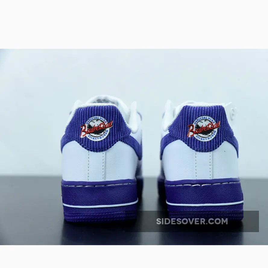 This offering of the Nike Air Force 1 features a White leather upper with Purple corduroy Swoosh and heel overlays and matching colored soles. Other details includes a patch on heels that read “Official Nike Basketball Merchandize”, while the tongue tag comes with the Sports Specialties logo and traditional Nike branding.