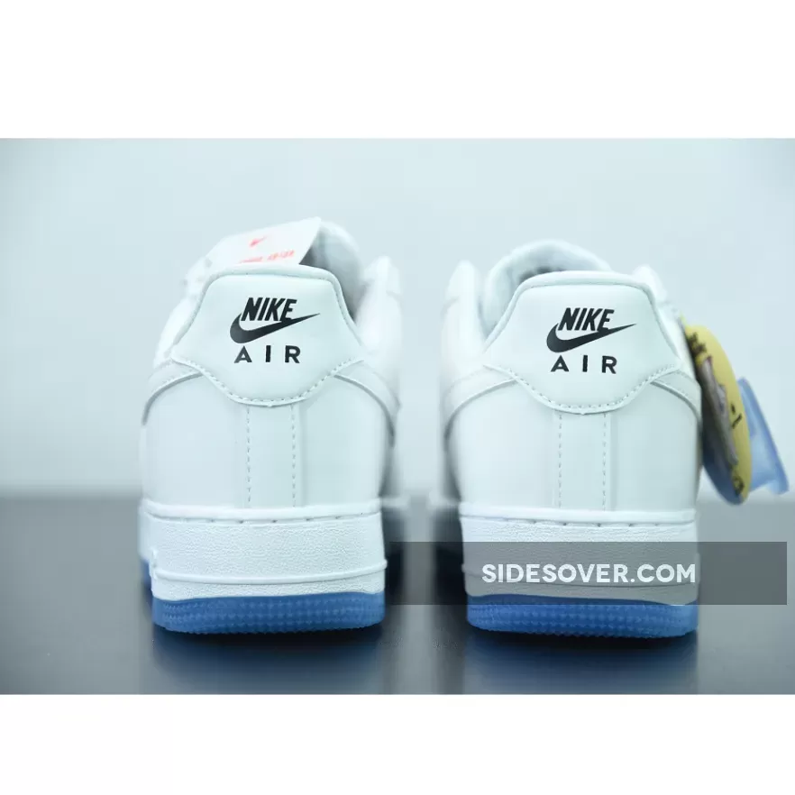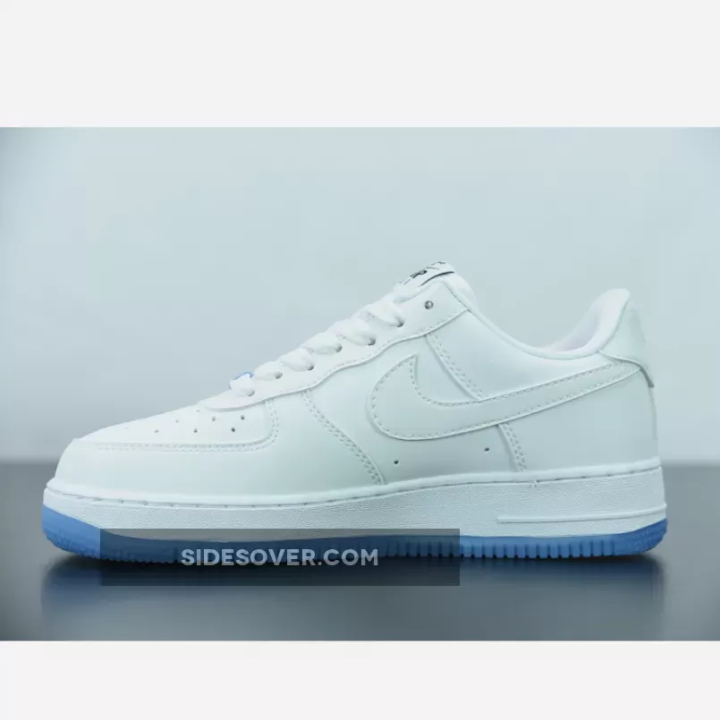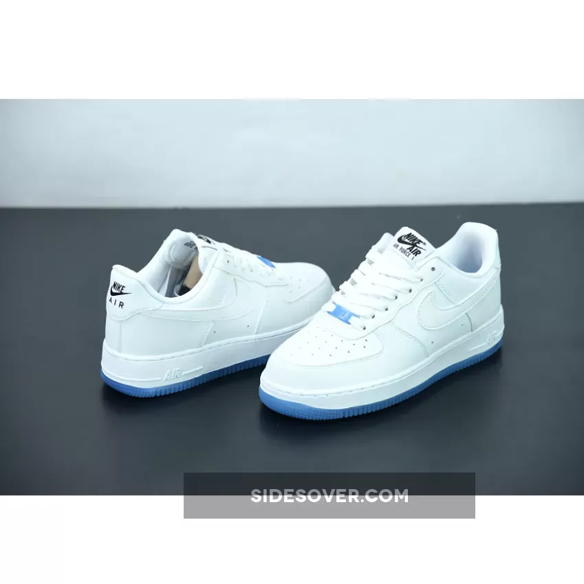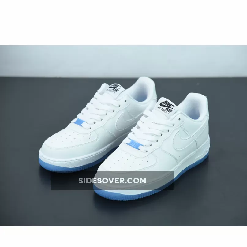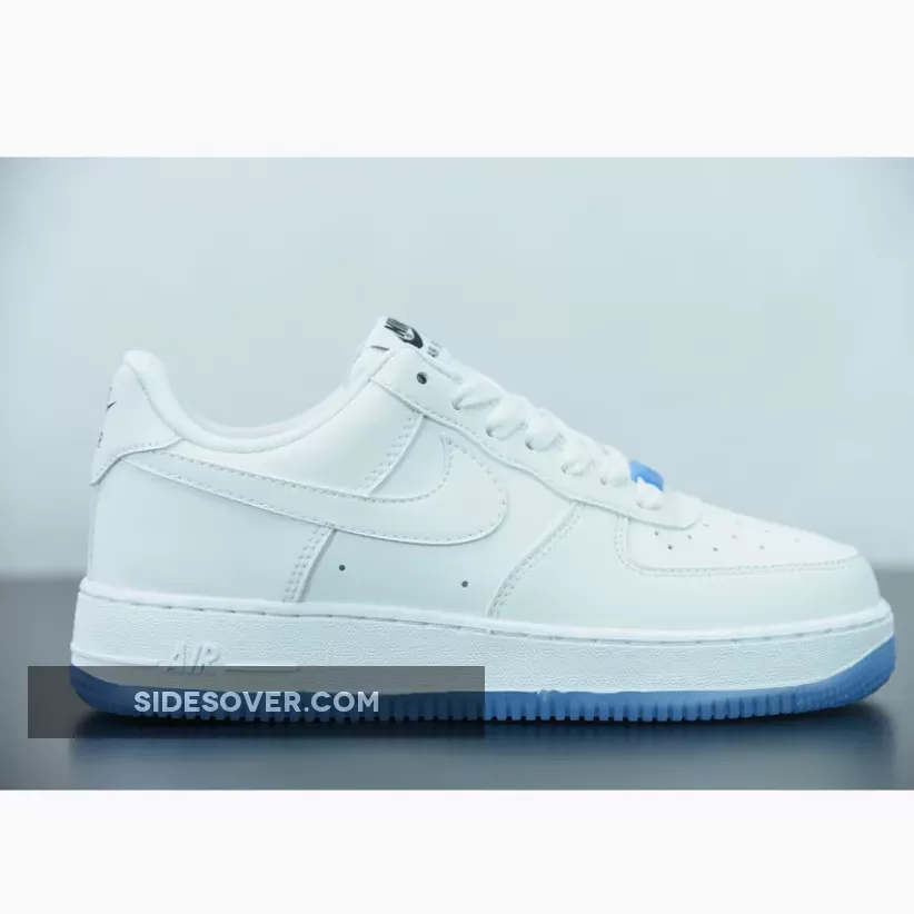 Dressed in a White, University Blue, and Black color scheme. This Nike Air Force 1 features an all-White leather UV-treated upper that changes colors when exposed to heat/sunlight. The only areas that remain the same are the liners, tongues, laces, midsole, and Blue translucent lace dubraes and outsole.