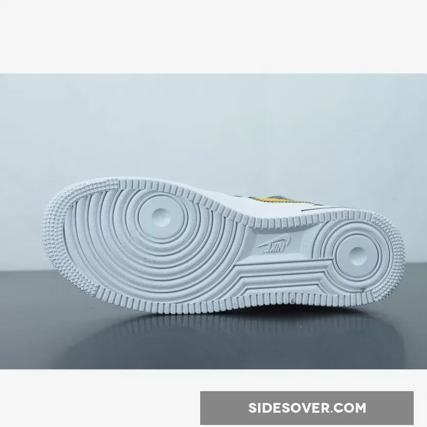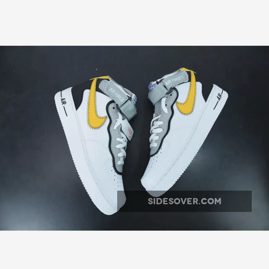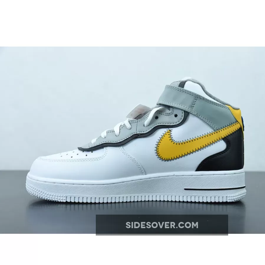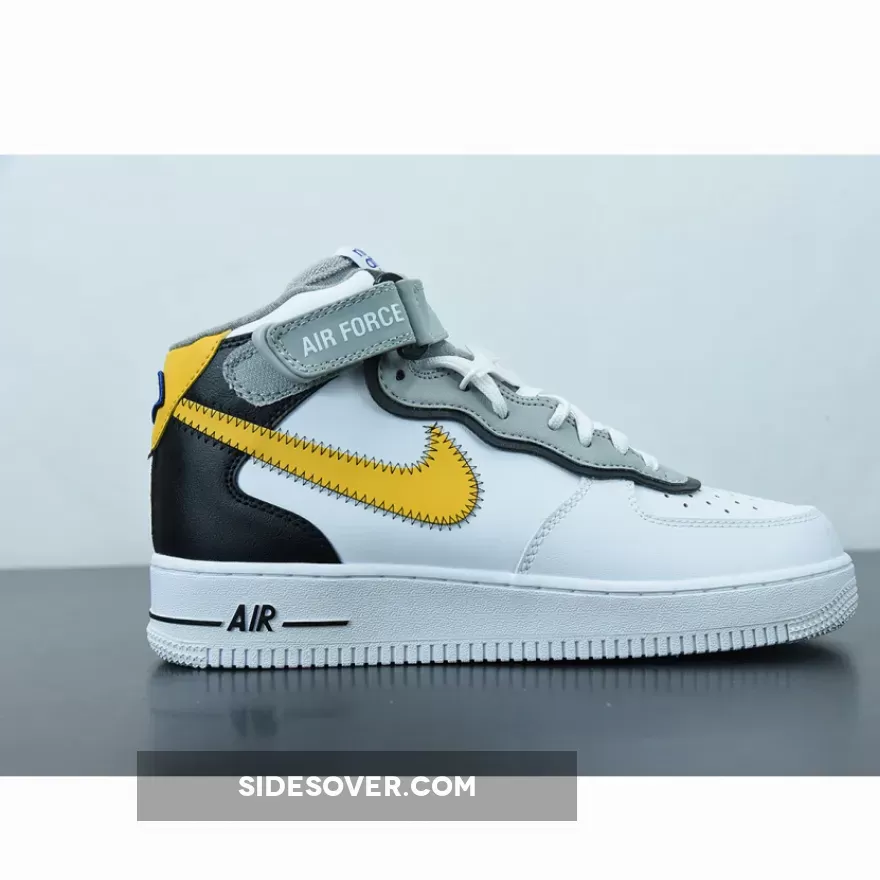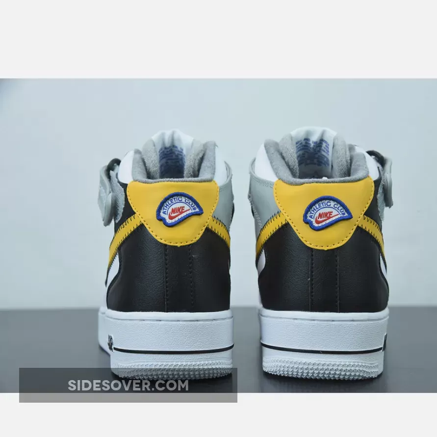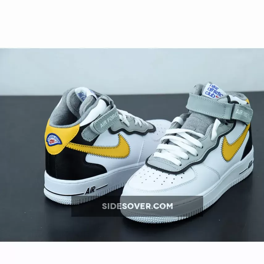 This Nike Air Force 1 Mid has a White leather base while Black lands on the overlays on the heel. Next, Yellow appears on the Swoosh logos and heel, and the eyestay is layered. You can also see exposed stitching on the Swoosh and ankle strap while the retro Nike Athletic Club logo hits the tongue, insole, and patch on the heel.