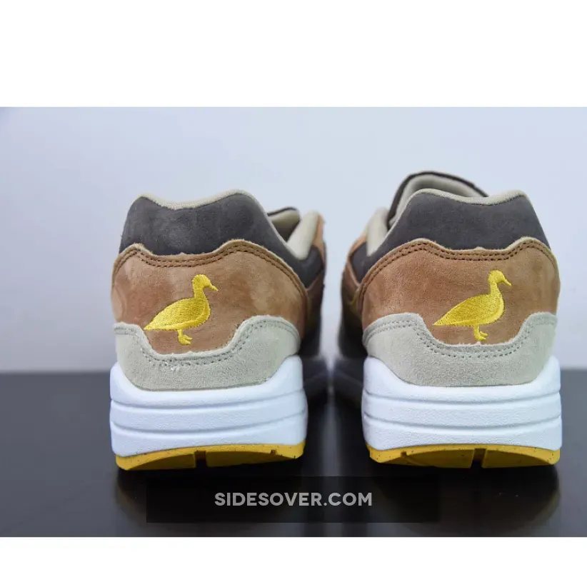 A closer look shows the pair with suede panelling, giving the lifestyle shoe a premium appearance. In terms of colour arrangement, this Air Max 1 sees Baroque Brown, Pecan, and Yellow Ochre. “Yellow Ochre” accents are then drizzled over the Swooshes, laces, tongue branding and duck silhouettes, the latter of which are embroidered into the heel to replace the usual Nike branding. White midsoles and yellow rubber outsoles finish off the look on this Nike Air Max 1