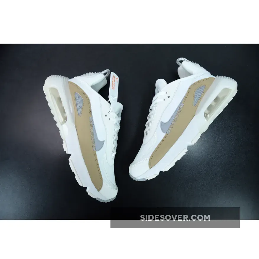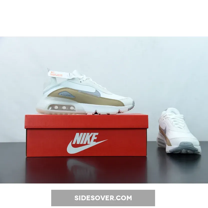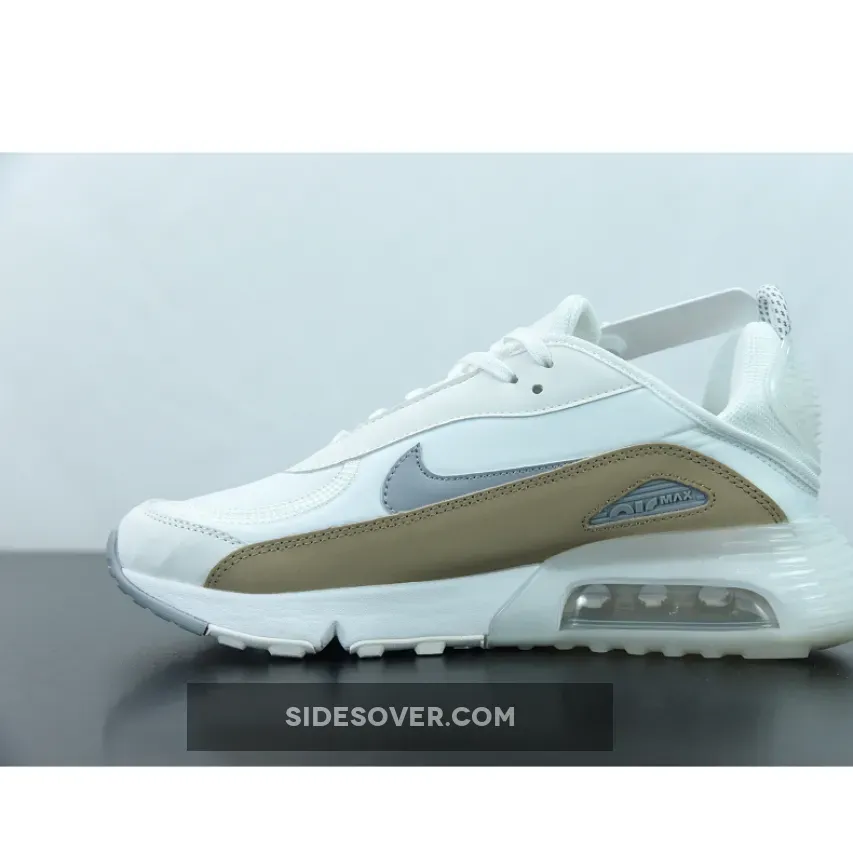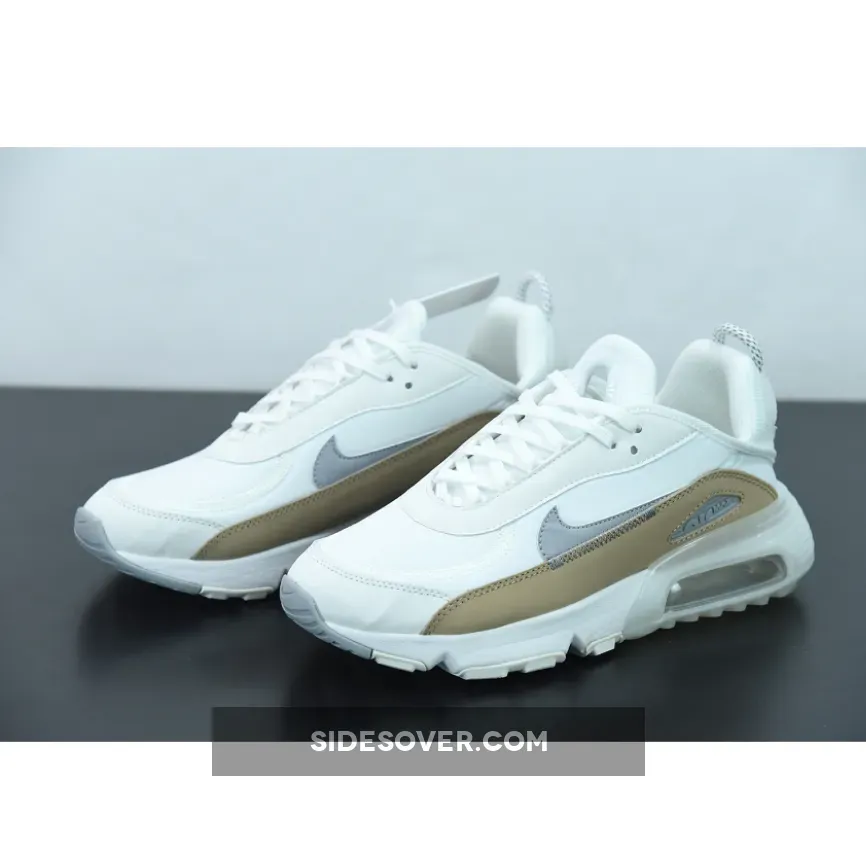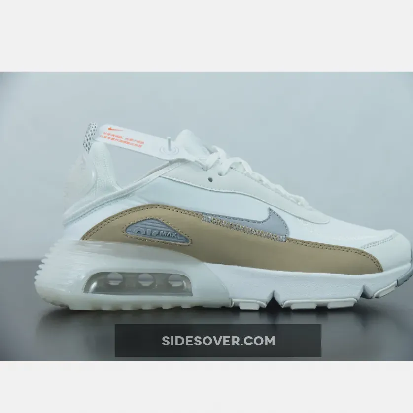 this Nike Air Max 2090 features a mixture of mesh and leather throughout while White appears on the base. Next, we have Grey o the Swoosh logos and Tan on the mudguard. Other highlights include a milky Air Max heel overlay as well as White and Grey on the rubber outsole to finish the look.