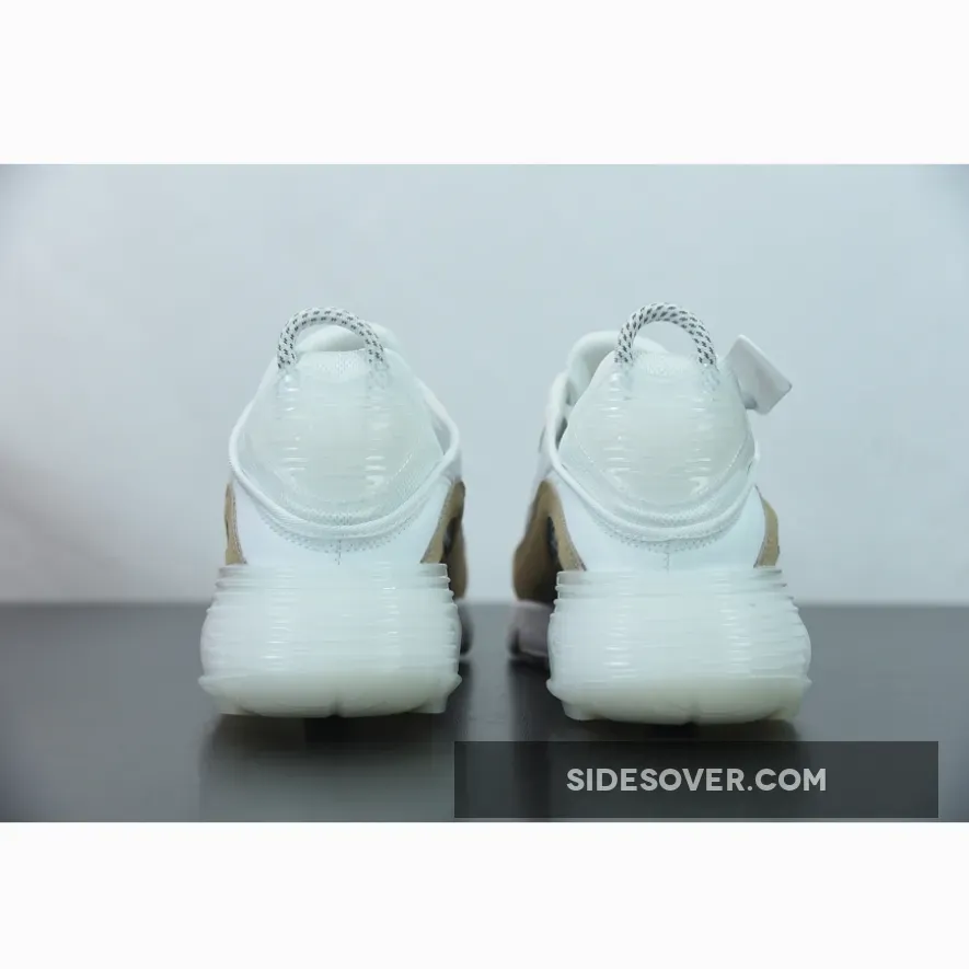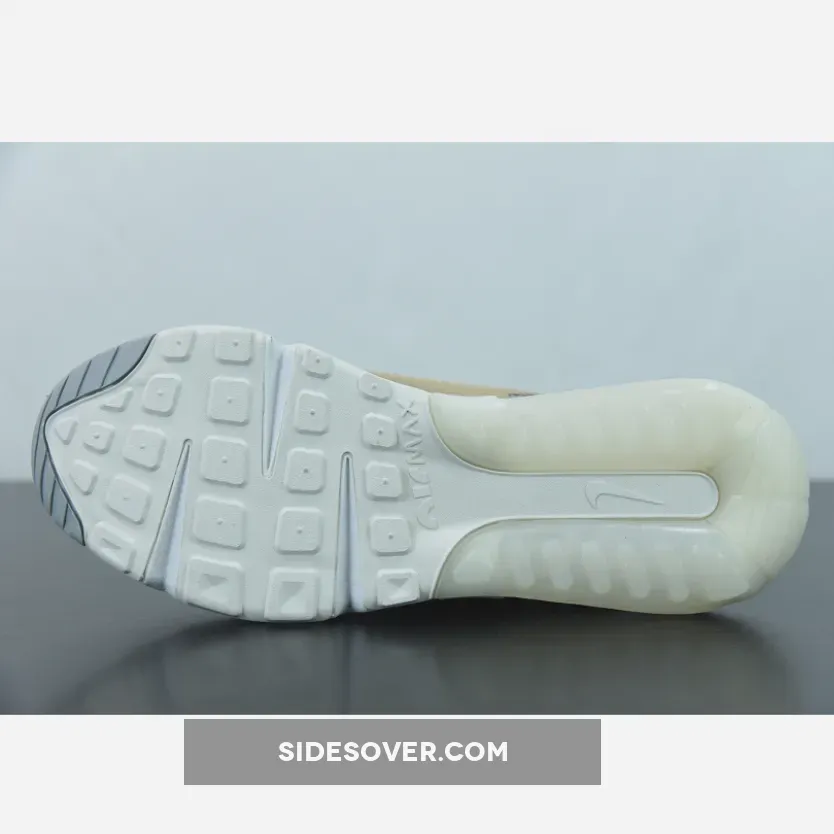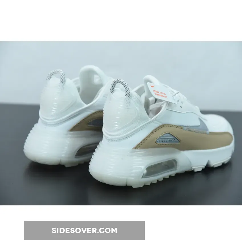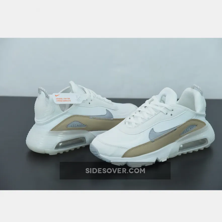 this Nike Air Max 2090 features a mixture of mesh and leather throughout while White appears on the base. Next, we have Grey o the Swoosh logos and Tan on the mudguard. Other highlights include a milky Air Max heel overlay as well as White and Grey on the rubber outsole to finish the look.