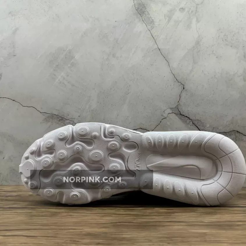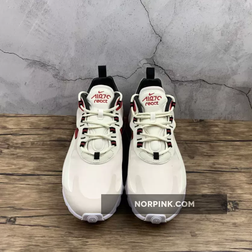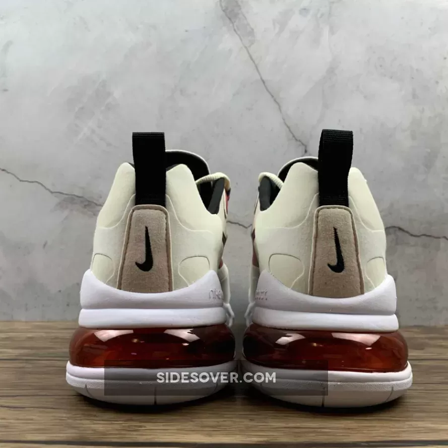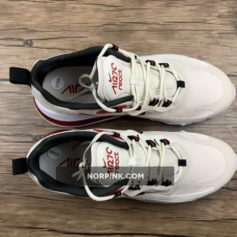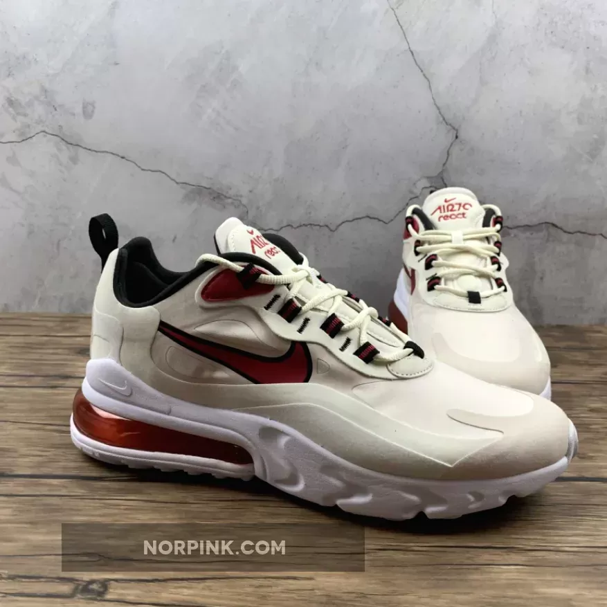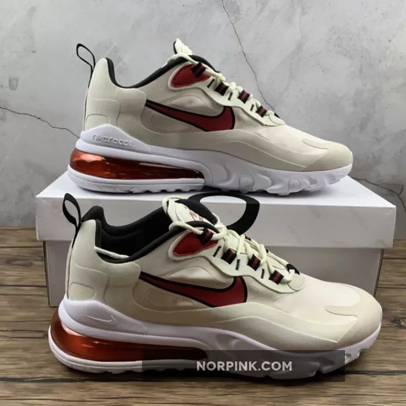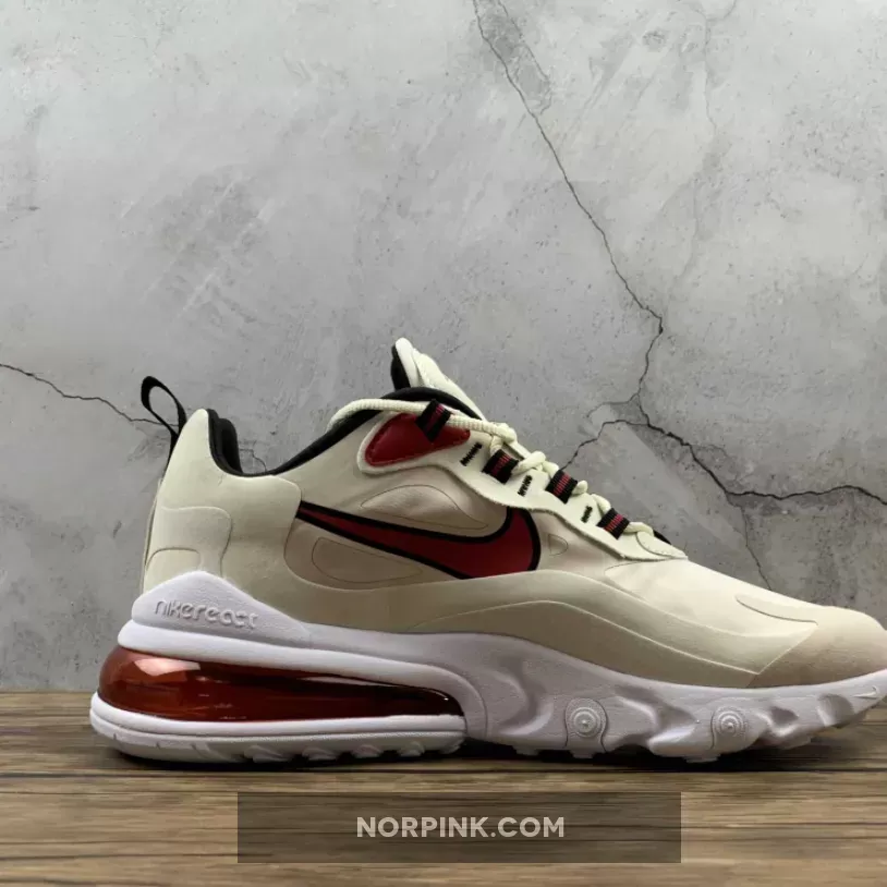 This offering of the Nike Air Max 270 React features a Light Orewood Brown and Sail upper with suede overlays. Highlighting the shoe are Cardinal Red accents paired with Black lining atop a White React sole.