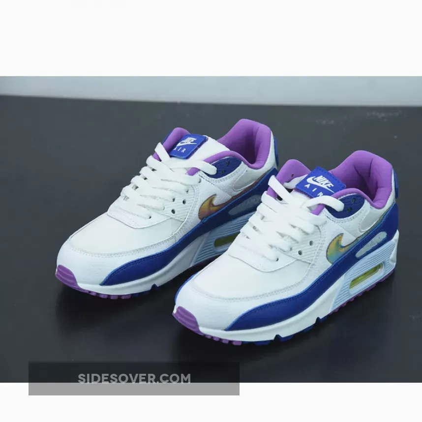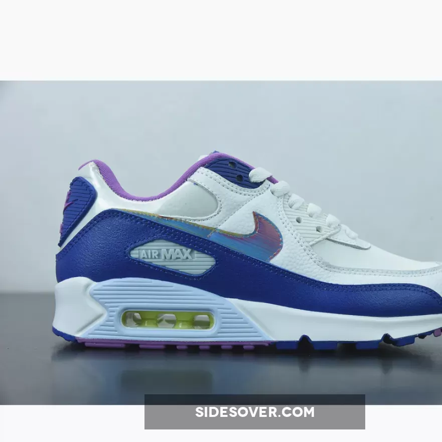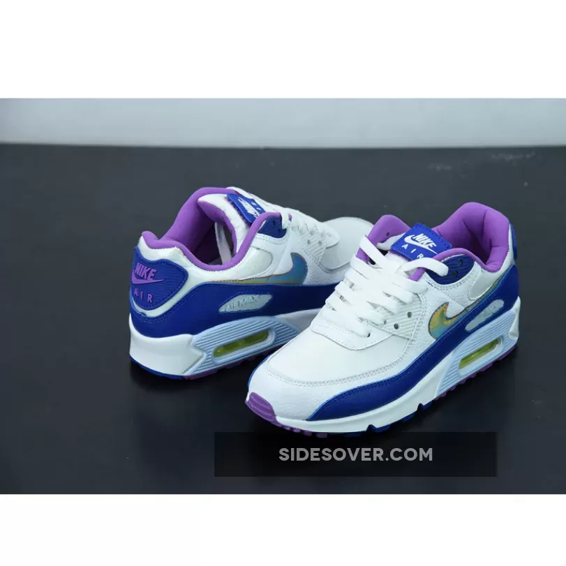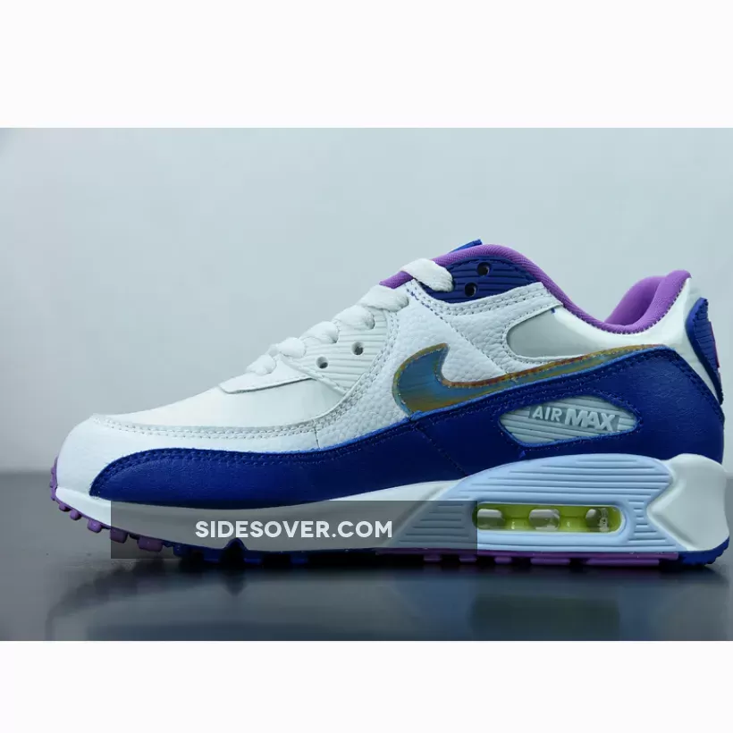 this Nike Air Max 90 comes highlighted with White across the upper while tumbled leather lands on the overlays and Blue leather is applied to the mudguard. Following we have Purple and a lighter shade of Blue detailing, iridescent on the Swoosh logos across the panels and Volt used on the Air unit. Finishing the look is a velcro patch on the tongue that unveils a cracked egg while the same branding is seen on the insoles.
