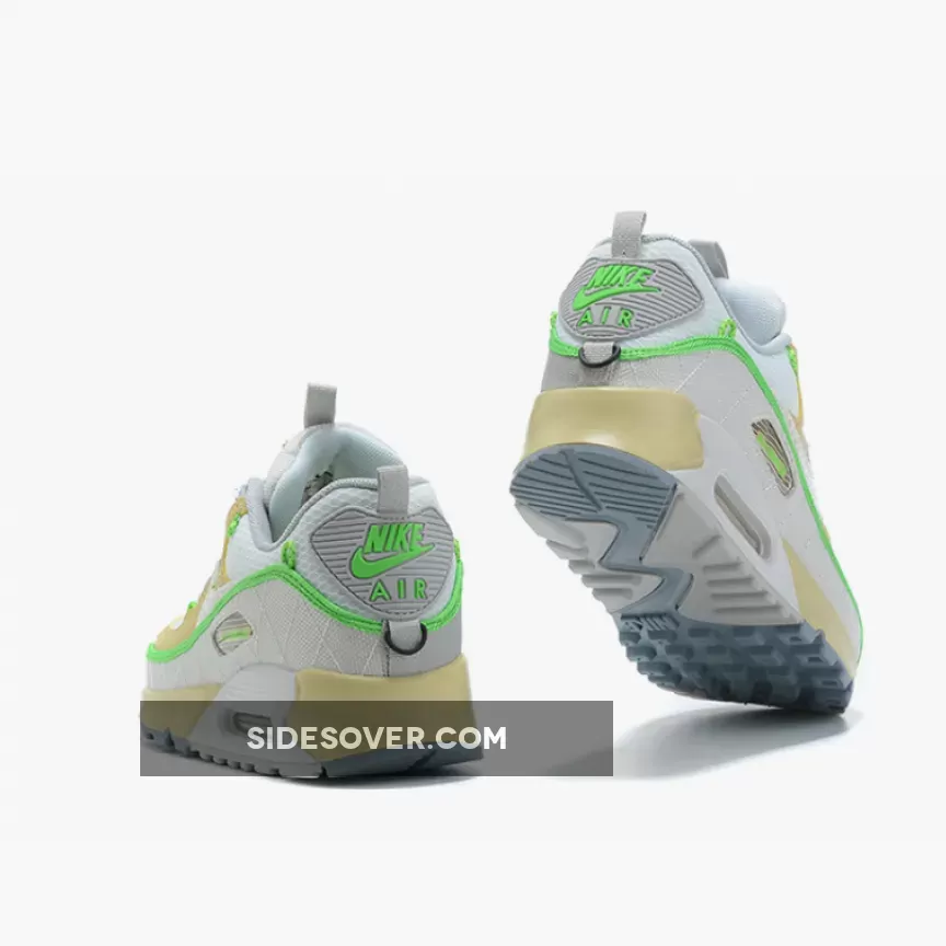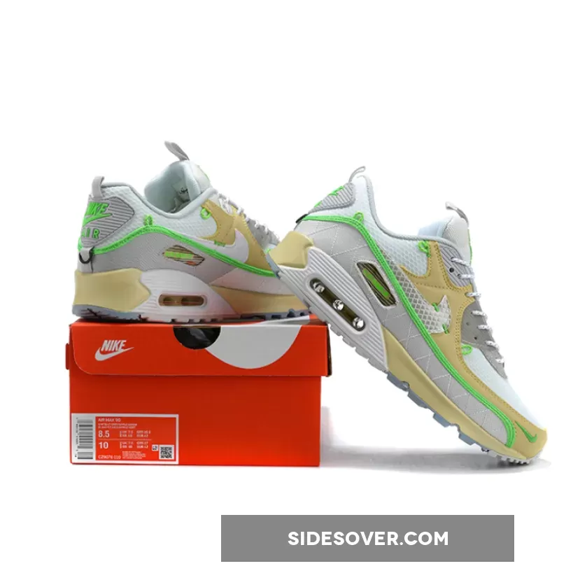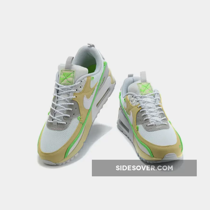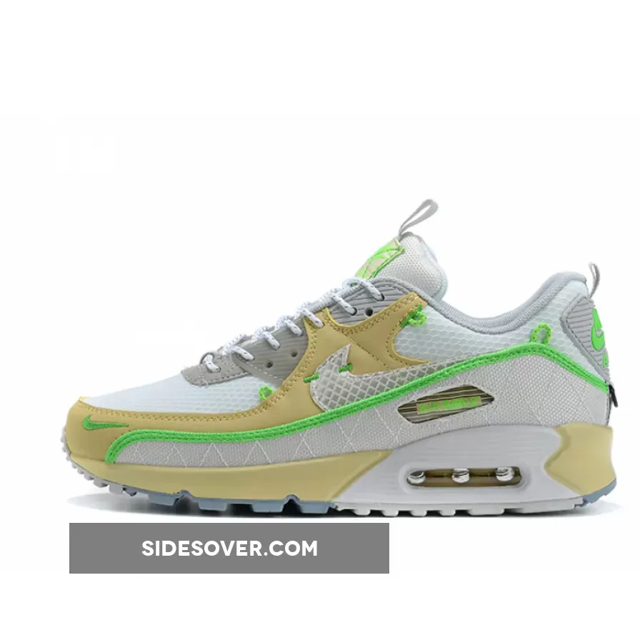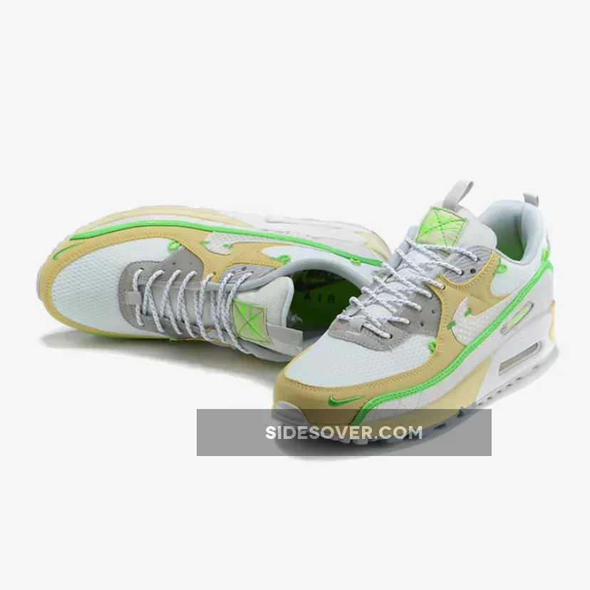 This offering of the Nike Air Max 90 sports a combination of Light Bone, White, and Platinum Tint highlighted with Neon Green contrasting accents. The shoe comes constructed in mesh, leather, ballistic mesh on the mudguards along with its toggle lacing system and dual pull tabs.