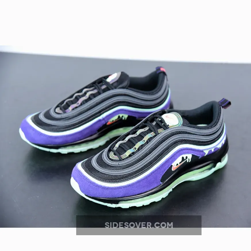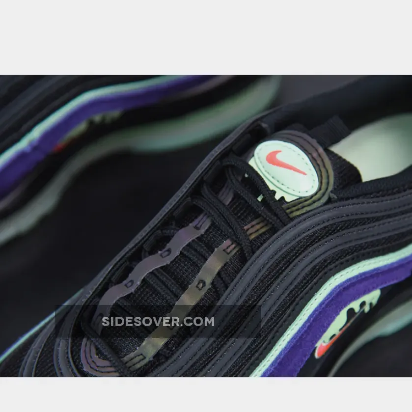 Looking closer, this Nike Air Max 97 utilizes Black mesh on the base while Purple suede lands on the mudguard. Following, we have Slime Green dripping on the side panels while the shade also wraps the entire shoes and within the Air Max unit. Lastly, other details include 3M reflective, iridescent on the tongue, and a glow in the dark rubber outsole.