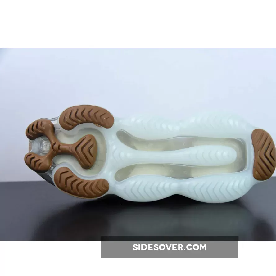 Underfoot, a darkened brush of marble outfits the midsole in tandem with its pillowed semi-translucent cushioning system and brown tread pucks below.