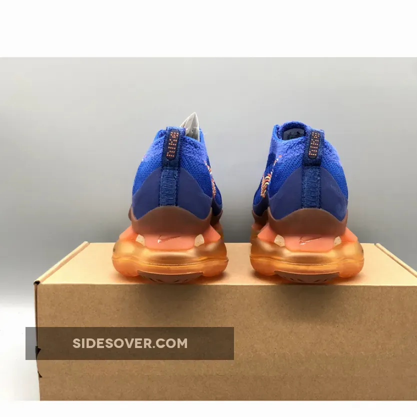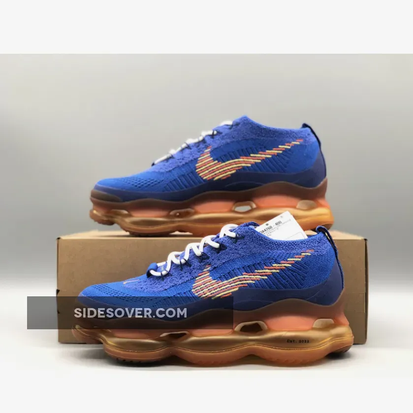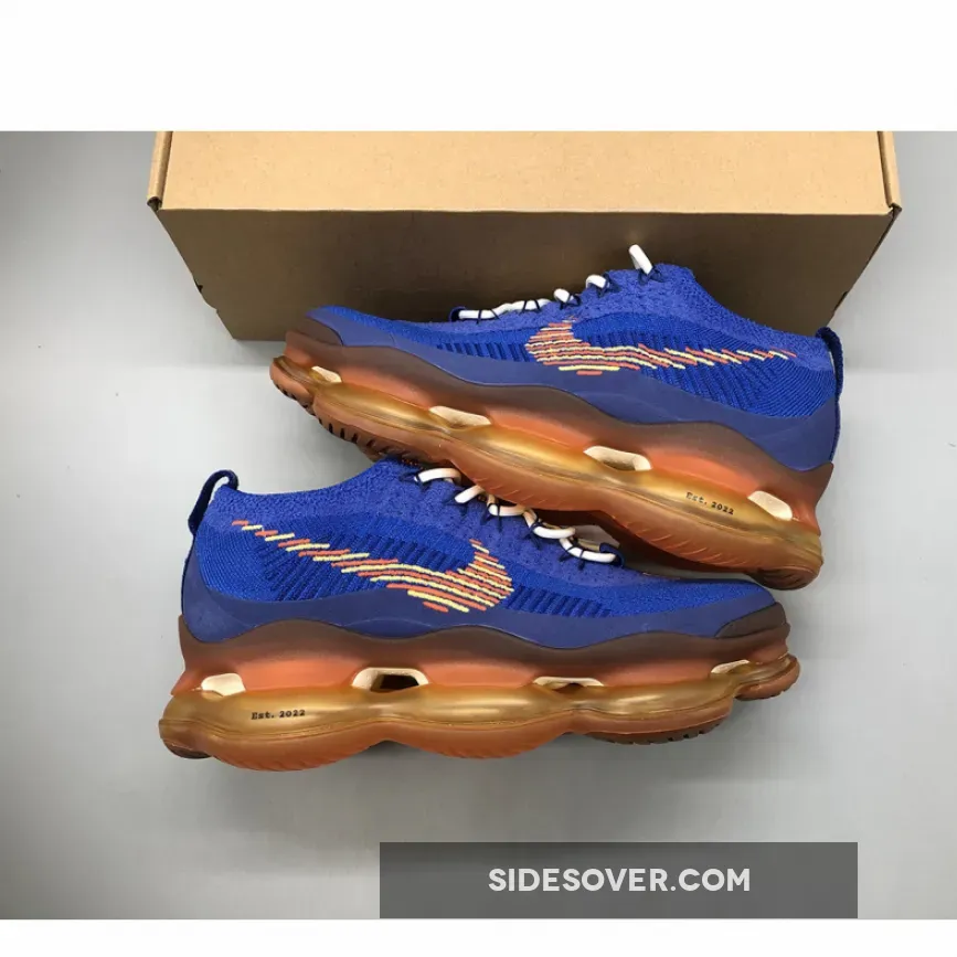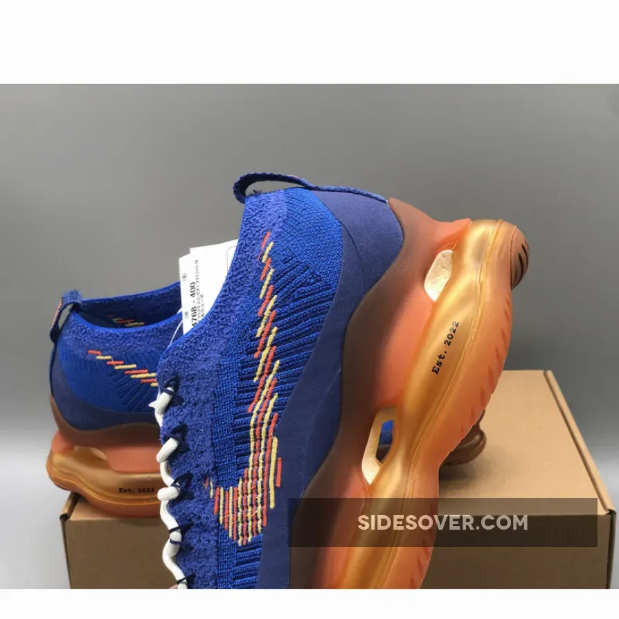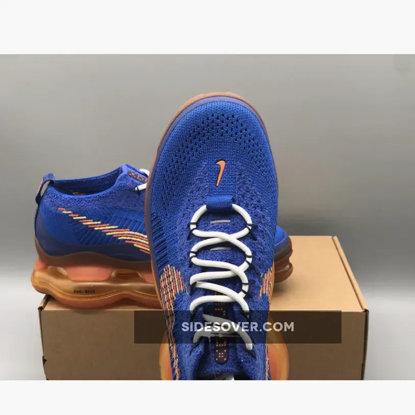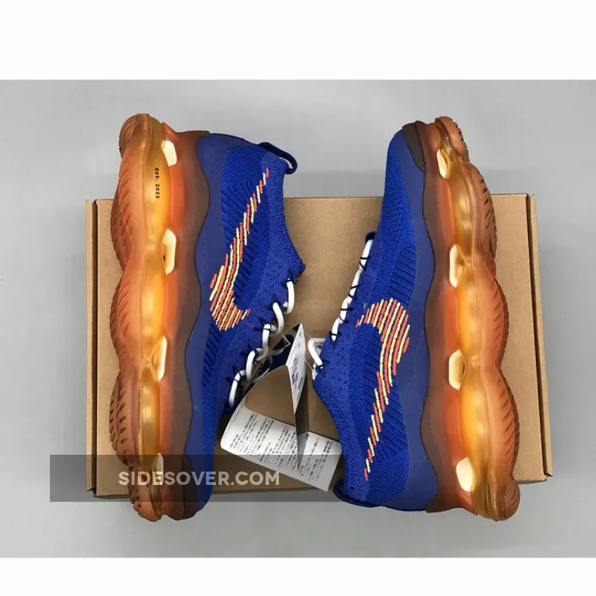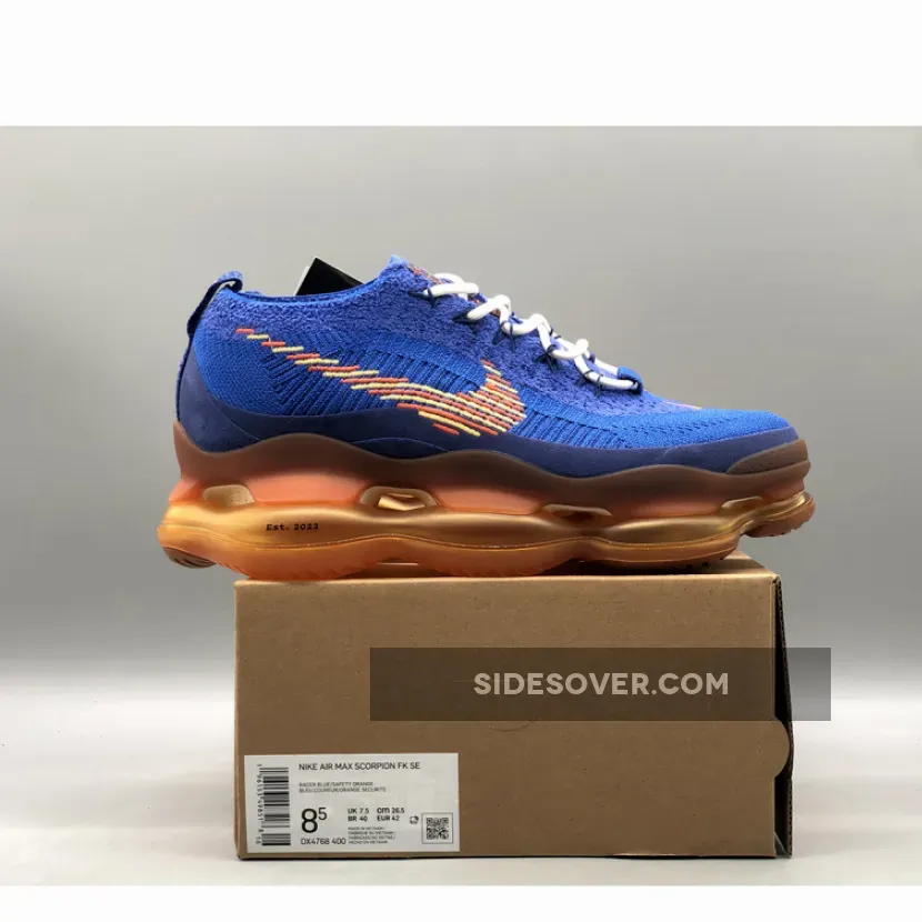 The Nike Air Max Scorpion “M. Frank Rudy” sports a predominately “Racer Blue” and “Game Royal” woven upper accented with contrasting “Safety Orange” and “Team Gold” on the profile Swooshes and tongue branding.