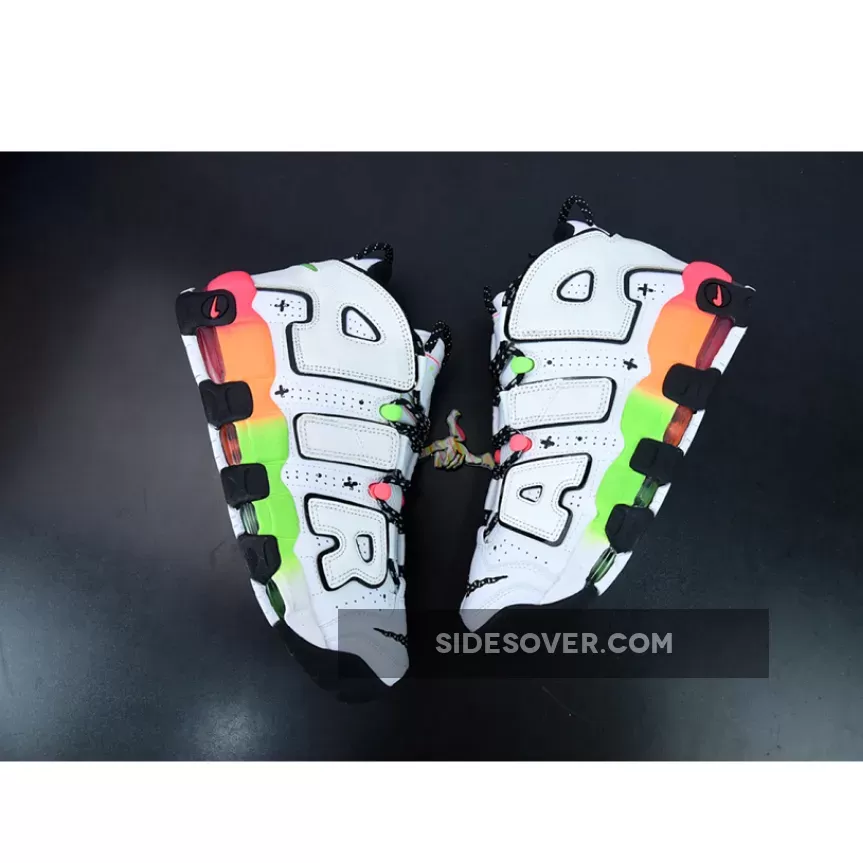 This Nike Air More Uptempo features White leather on the base while various materials land on the removable ‘AIR’ branding that also has a ‘Tear Here’ sign. Across the midsole is a gradient of Green, Orange, and Pink, while a Black mini Swoosh hits the toe with a smiley face and sprinkles. The same design adorns the tongue, and a unique graphic is placed on the insoles. Each pair also comes with a special hangtag.