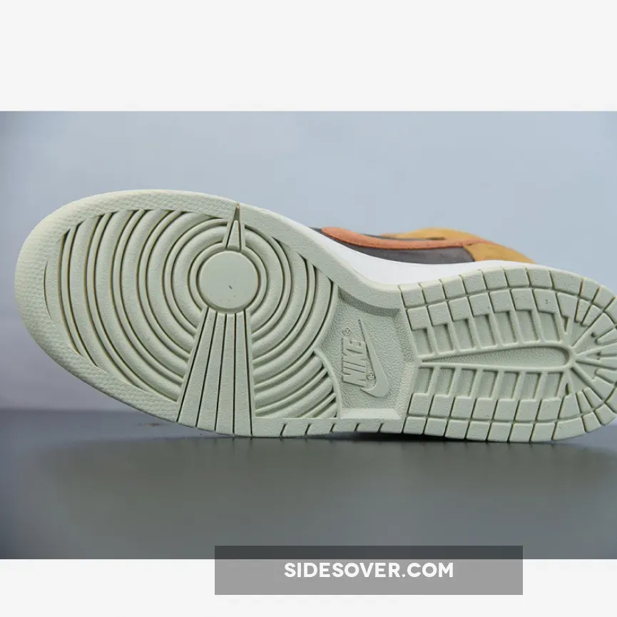 This Nike Dunk High comes dressed in a Velvet Brown, Dark Russet, Dark Curry, and Sail color combination. First, the pair features Brown suede on the panels, toe, and ankle. Furthermore, a long-hair suede in Curry adorns the eyestay, wraps the toe, heel, and covers the ankle. More suede appears on the Swoosh that almost looks Red and Curry hits the laces. Finally, a White midsole and a Sail rubber outsole finish the look.
