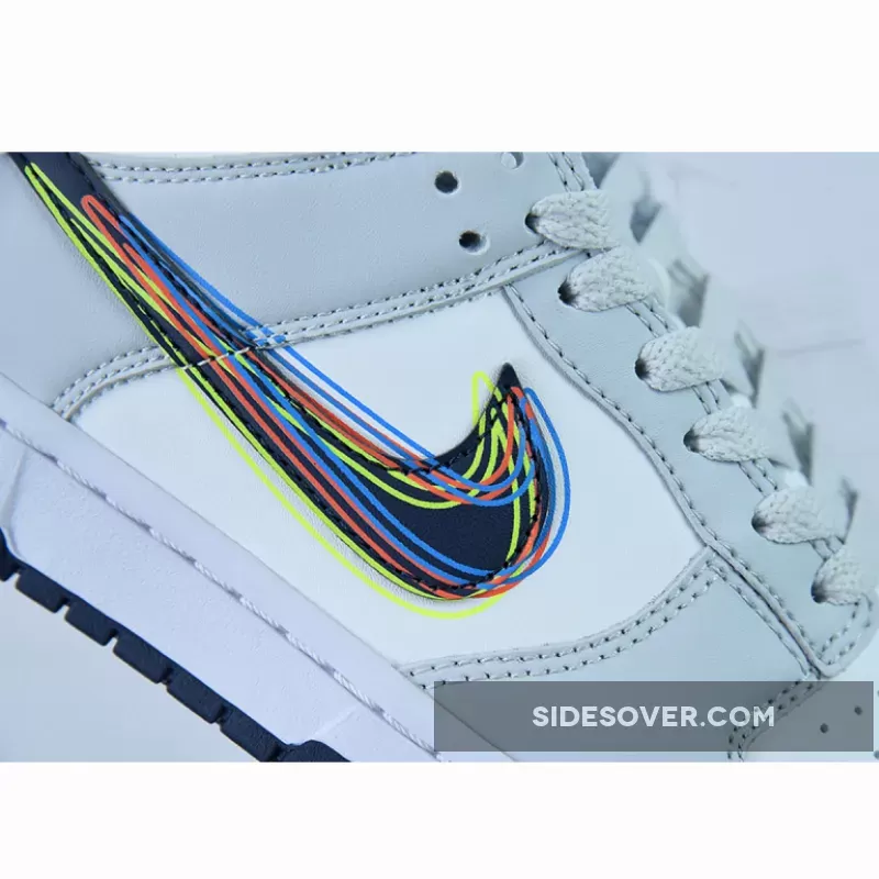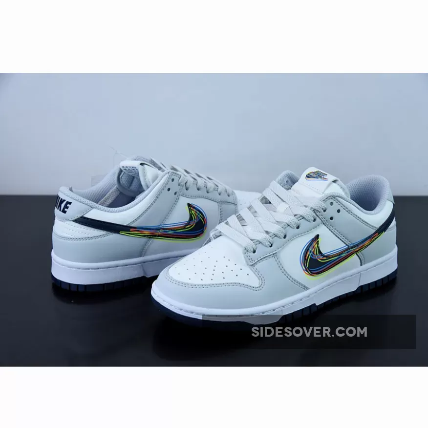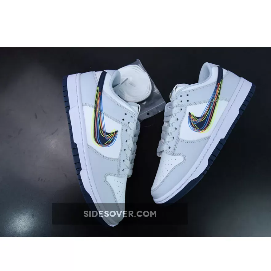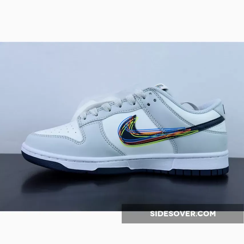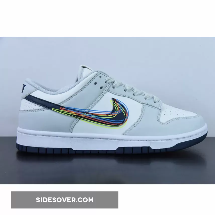 Boasting the right amount of elegance and edginess, the Nike Dunk Low 3D Swoosh White Grey is a versatile shoe that you can pair with multiple outfits. It starts off with a traditional Dunk Low design featuring a smooth white leather base that shows in the perforated toe box, side panels and heel. On top, are elegant grey overlays that cover the mudguard, eye stays and foxing. The main attraction is the spiced up Swoosh design that showcases multicoloured overlapping Nike Swooshes in shades of neon green, bold red and cobalt blue.