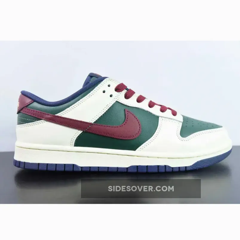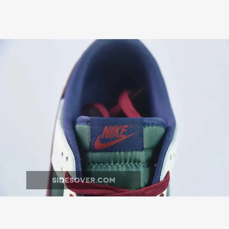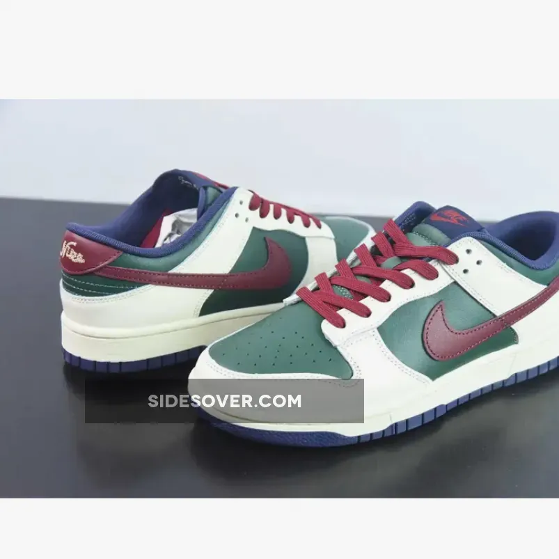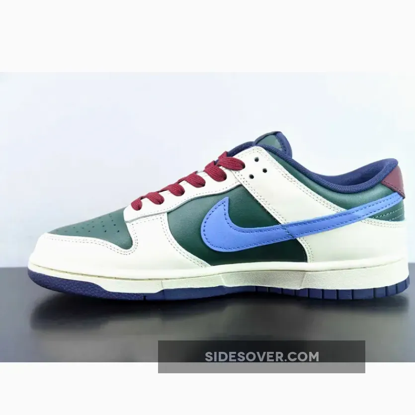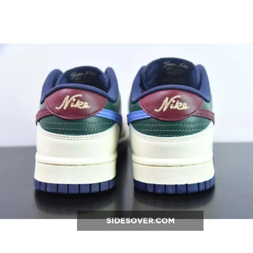 This Nike Dunk Low flaunts a lively blend of colors – Gorge Green, Team Red, Obsidian, Game Royal, and Coconut Milk. A dark green leather constructs the base with coconut milk leather overlays. Dark red accents include the Nike Swoosh and the laces, completing the Christmas color scheme. Noteworthy details like the “From Nike To You, Oregon USA” tongue tags, a Coconut Milk midsole, and an Obsidian rubber outsole round out the design.