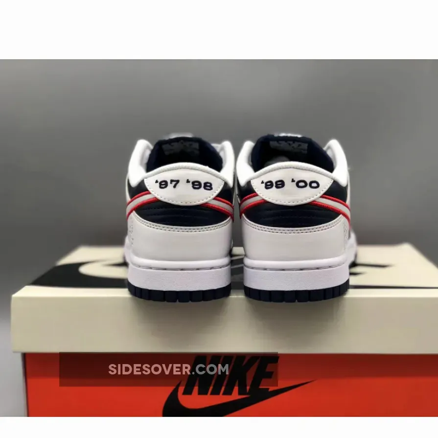 the Nike Dunk Low “Houston Comets Four-Peat” has an “Obsidian” leather base with “White” leather overlays and a “University Red” Swoosh that create a patriotic blend. The legendary four-peat is symbolized on the heel counter as it boasts a hand putting up the number four with a small times symbol (x) next to it. The sneaker is finished with consecutive championship years on the heel tab ranging from ’97 to ’00.