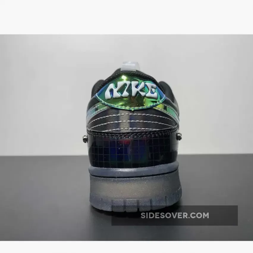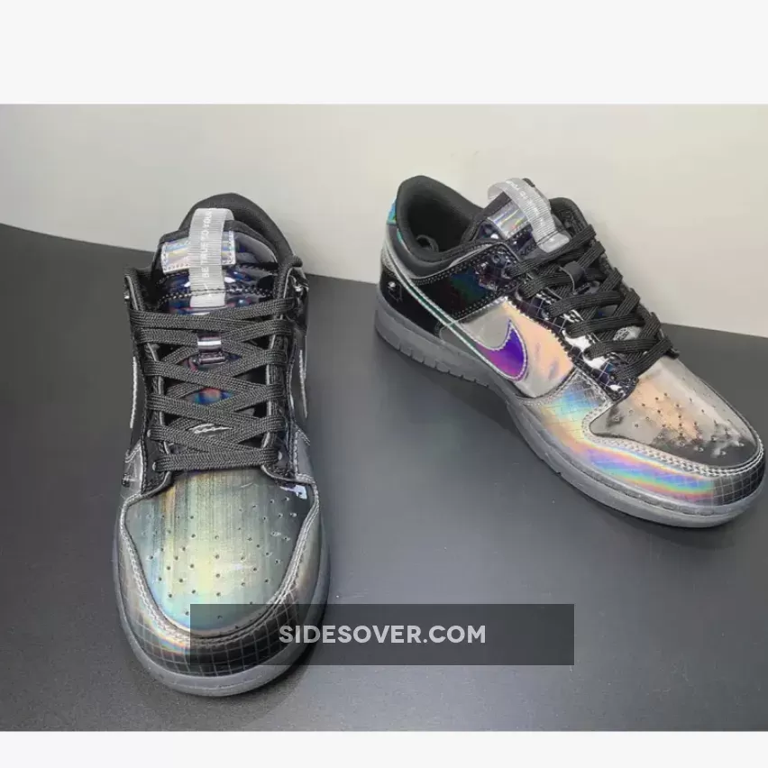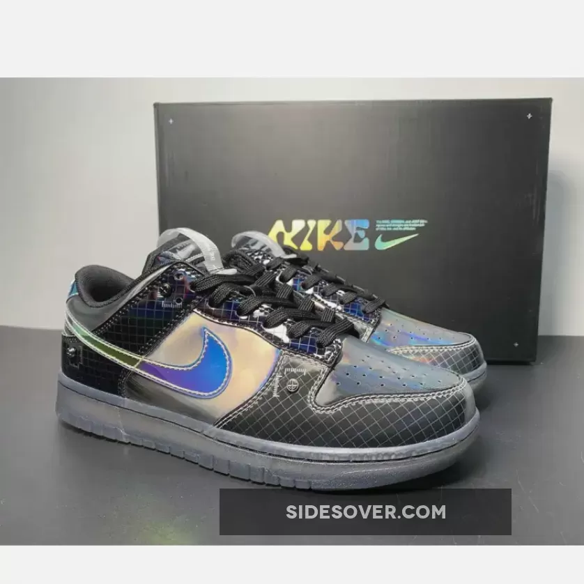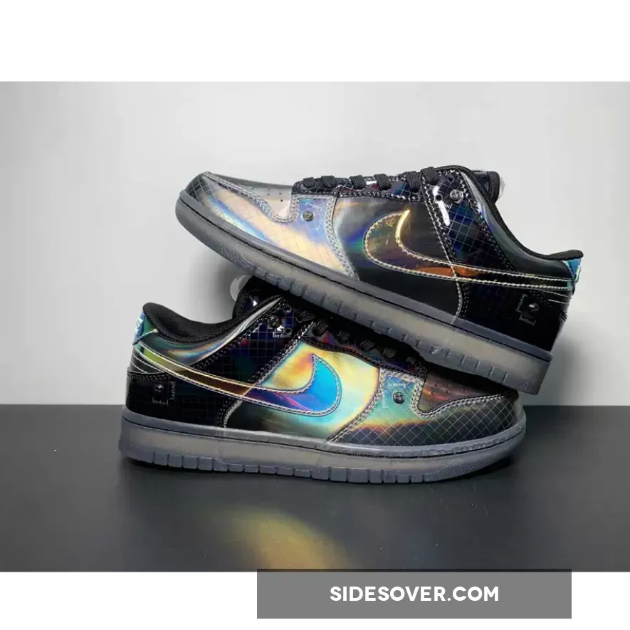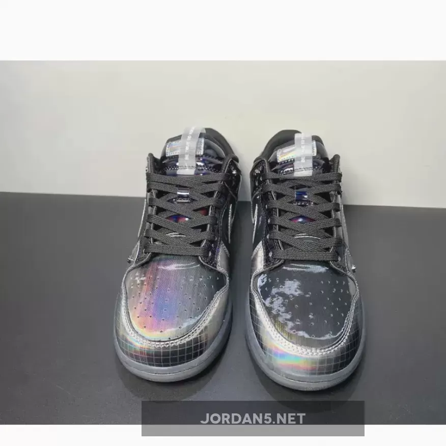 Nike is launching a second iteration of the Dunk Low “Hyperflat”, featuring darker, grey-scaled approach. The gridded pattern at the toe-guard captures that gun-metal hue, contrasted by the pitch black lace collar and heel — but off-set by a slightly oily finish. The Swoosh and heel tab, in particular, boast a reflective gloss that adds a touch of allure. The font choice blends nostalgia with a hint of retro-robotic aesthetics. Completing the overall look are the tongue pull-tabs, Phillips-head rivets, and a smoke-grey transparent outsole.