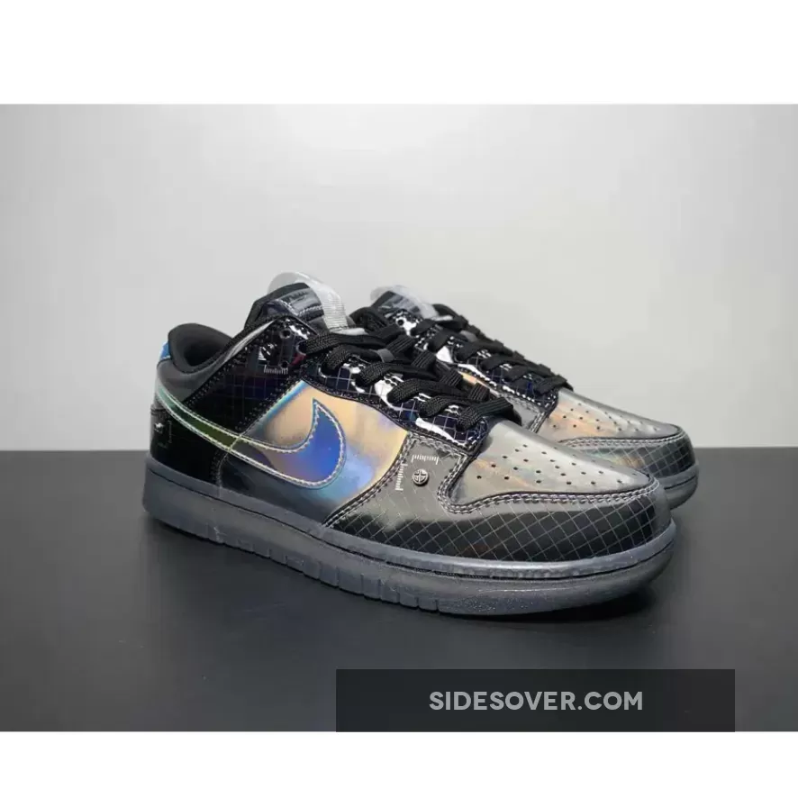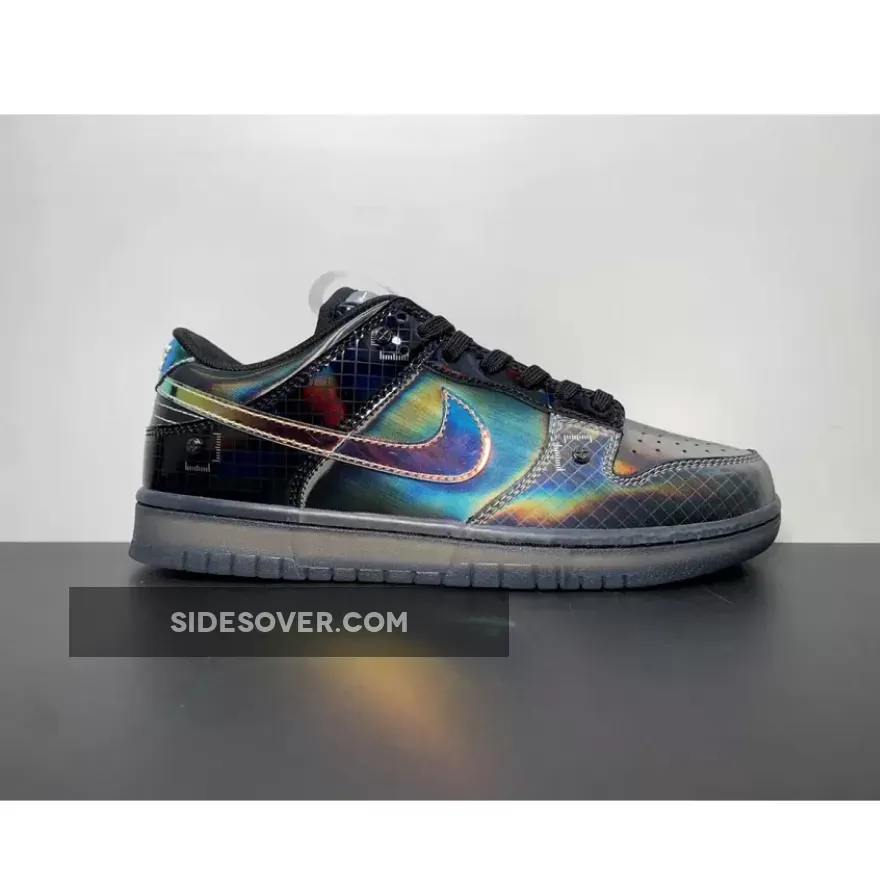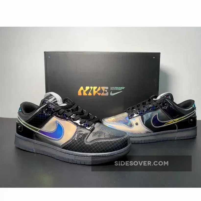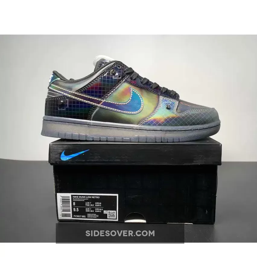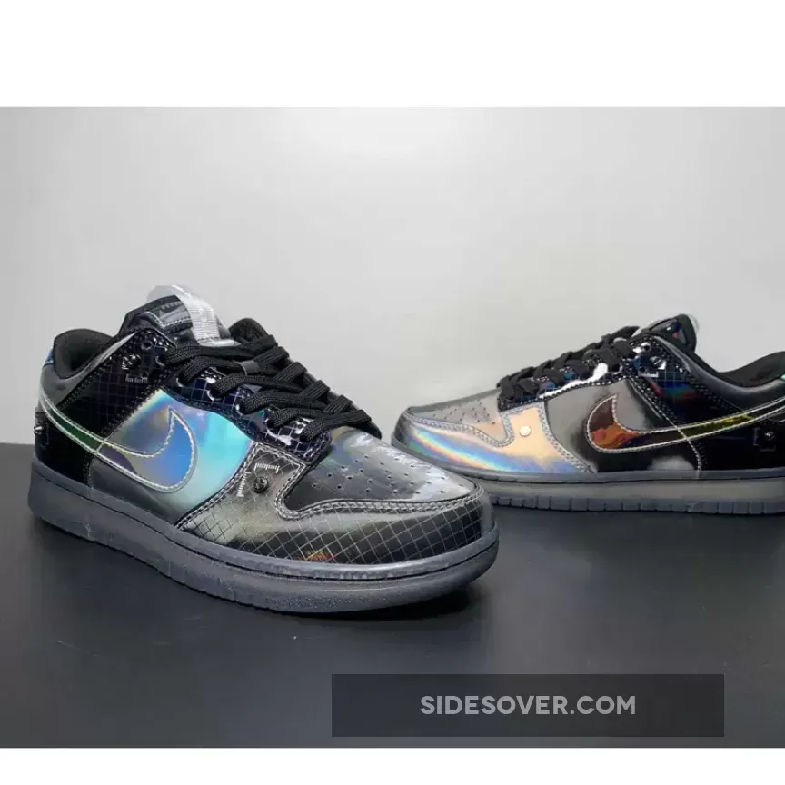 Nike is launching a second iteration of the Dunk Low “Hyperflat”, featuring darker, grey-scaled approach. The gridded pattern at the toe-guard captures that gun-metal hue, contrasted by the pitch black lace collar and heel — but off-set by a slightly oily finish. The Swoosh and heel tab, in particular, boast a reflective gloss that adds a touch of allure. The font choice blends nostalgia with a hint of retro-robotic aesthetics. Completing the overall look are the tongue pull-tabs, Phillips-head rivets, and a smoke-grey transparent outsole.