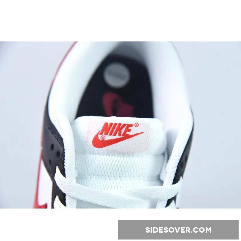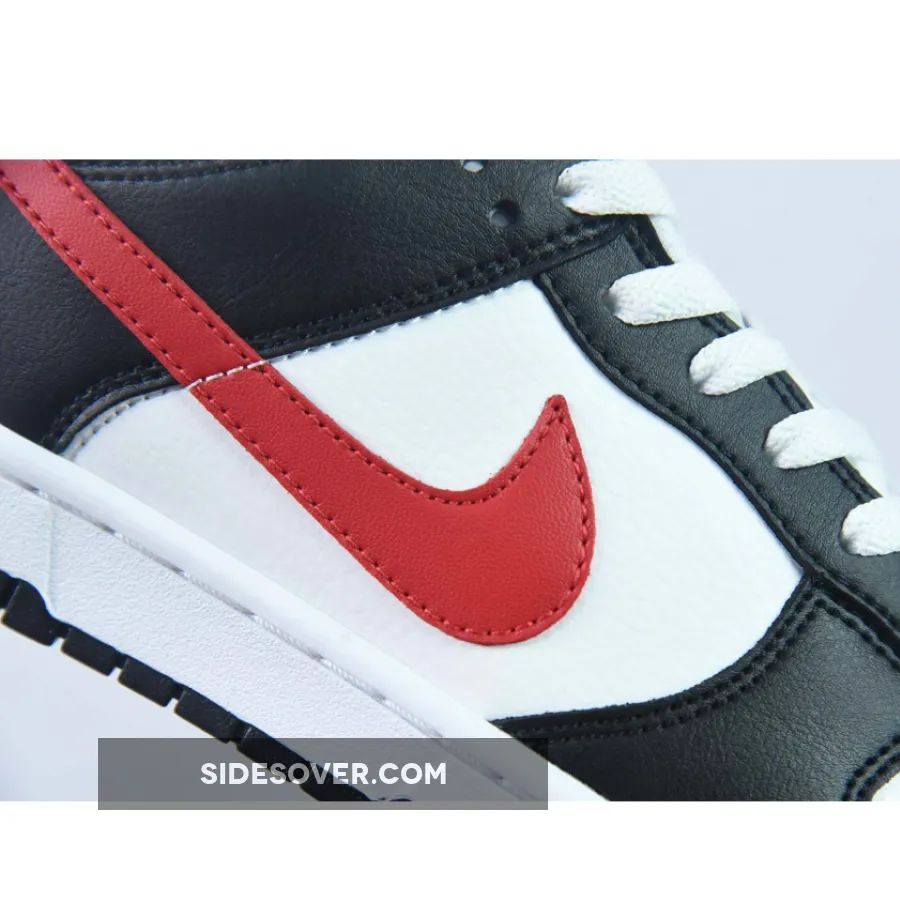 It’s here where the pair begins to deviate from the two-tone “Panda” scheme, with striking red flashes provided by Swoosh and heel overlays, as well as branding at the tongue. This same red repeats on the heel tabs with Nike text branding embroidered in black. Classic red Nike branding stands out on the white tongue tab and the black insole. Finally, a white midsole and black rubber outsole solidifies the profile nicely.
