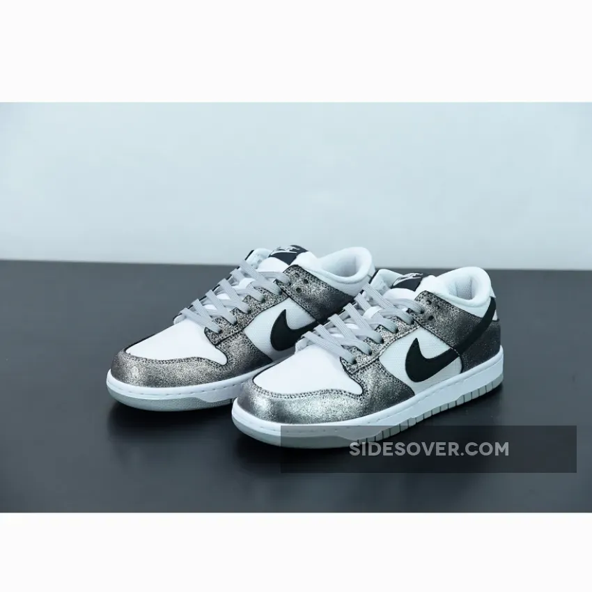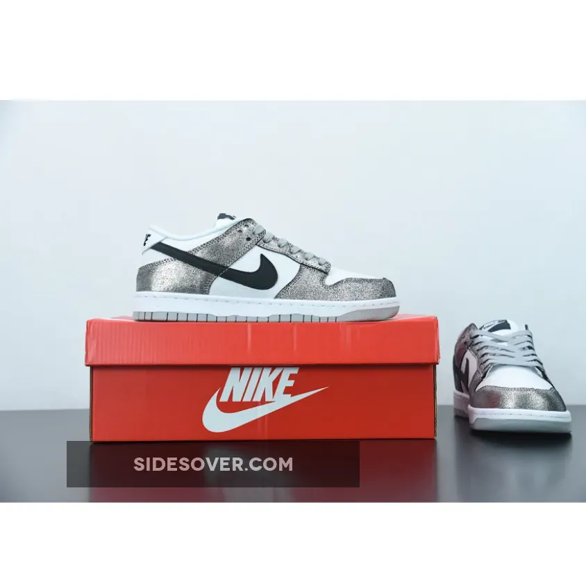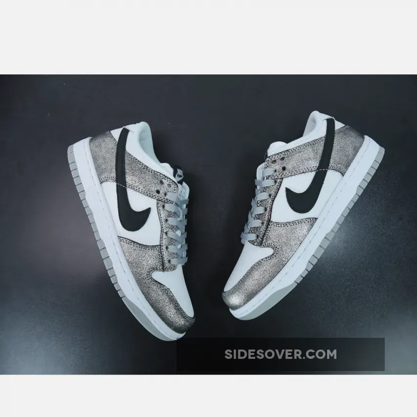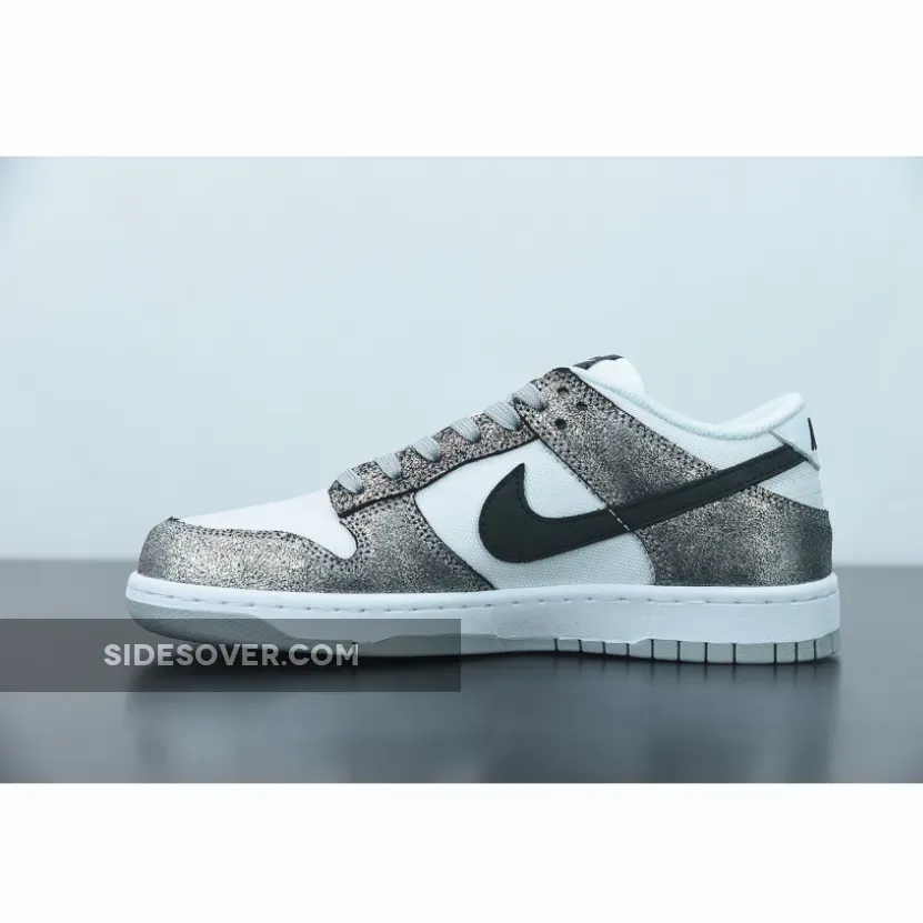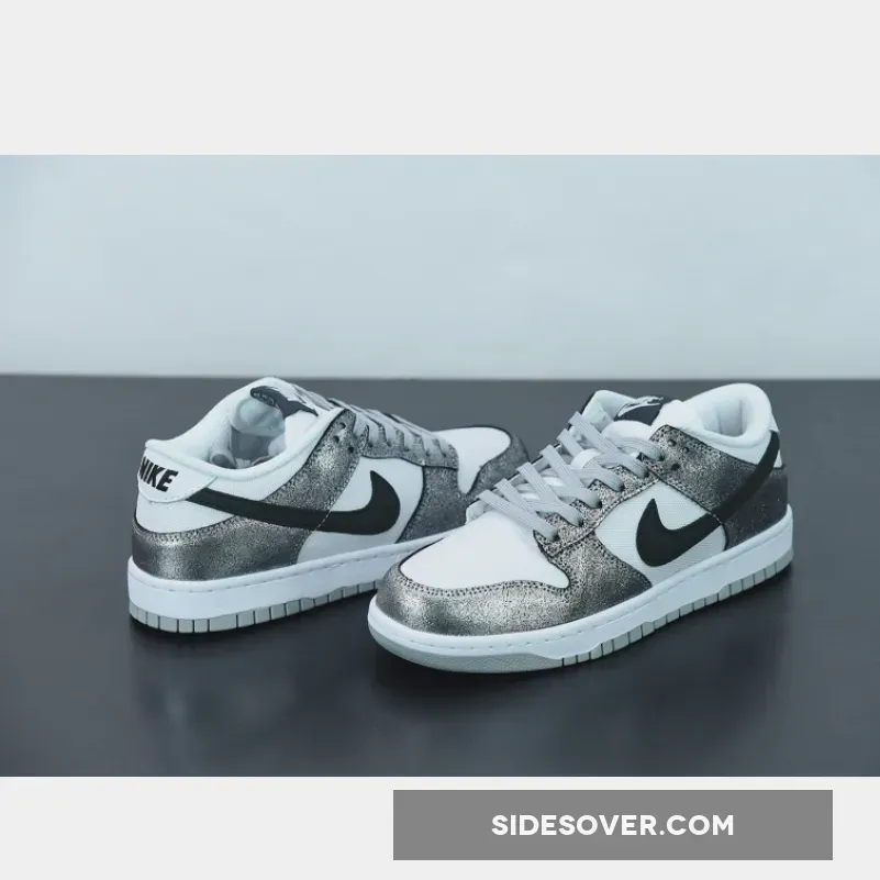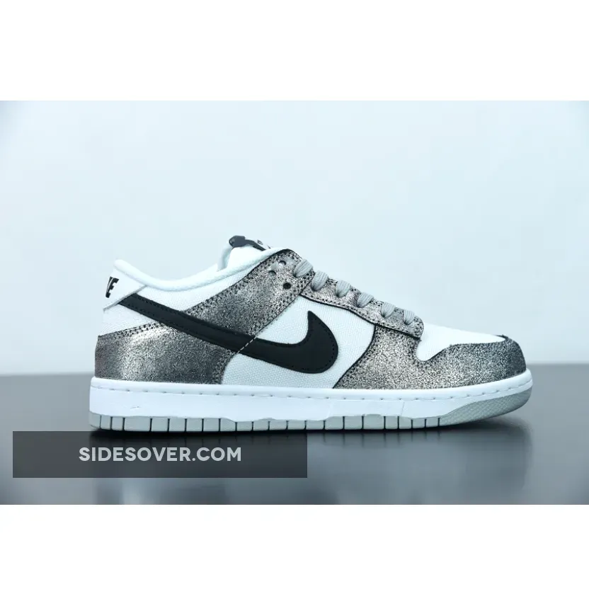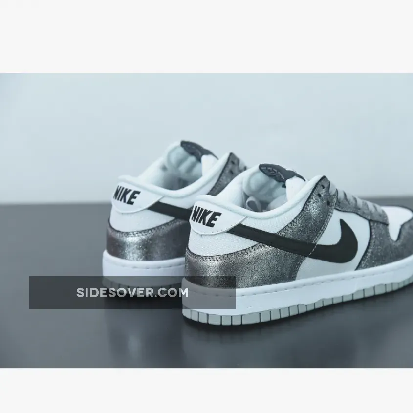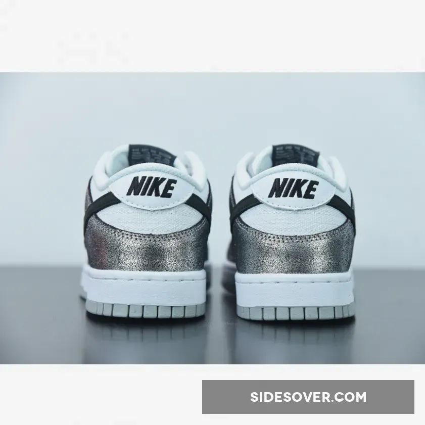 Go ahead and take the spotlight with the Nike Dunk Low Shimmer. These dynamic shoes start with an understated white canvas-like mesh base. Contrasting it are textured silver leather overlays covering the toe, mudguard, eye stays, heel and ankle areas. Hints of black in the Nike Swoosh, heel tab and tongue brandings round off the dazzling monochromatic palette. Slip these on and get ready to sparkle in style.