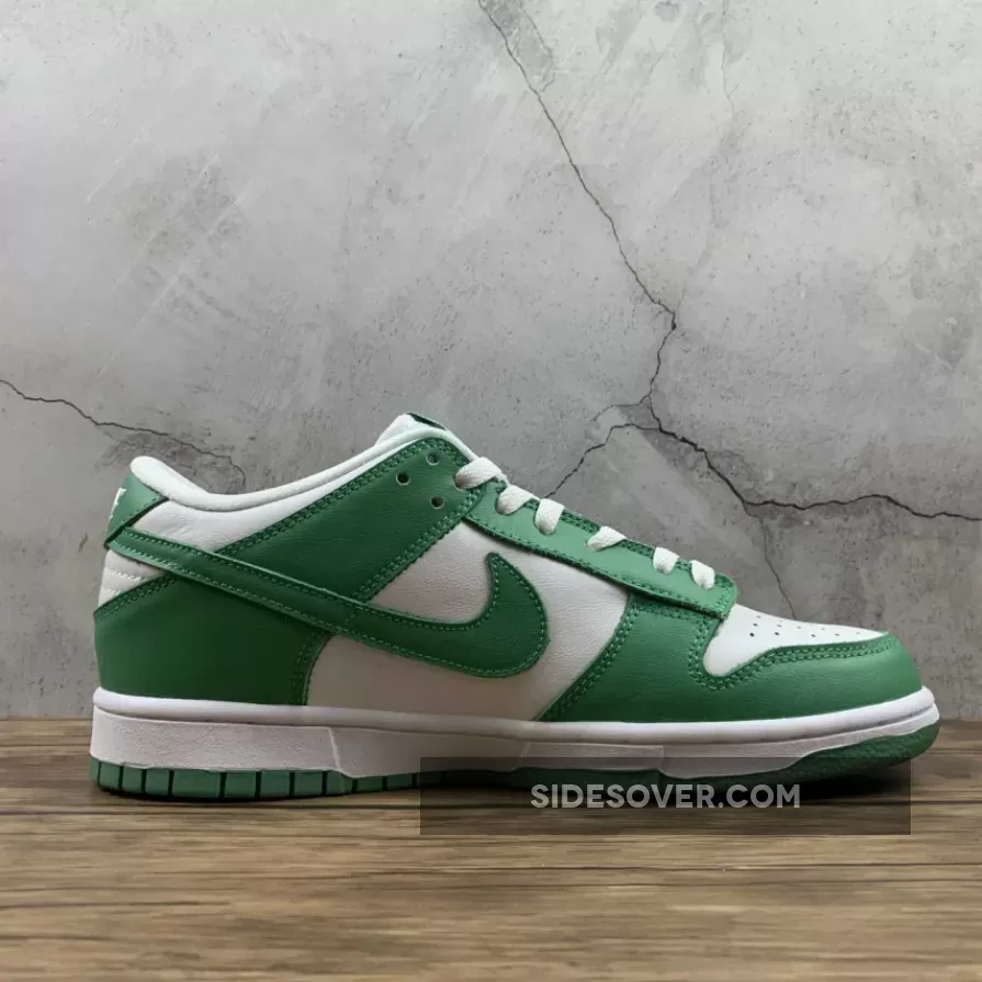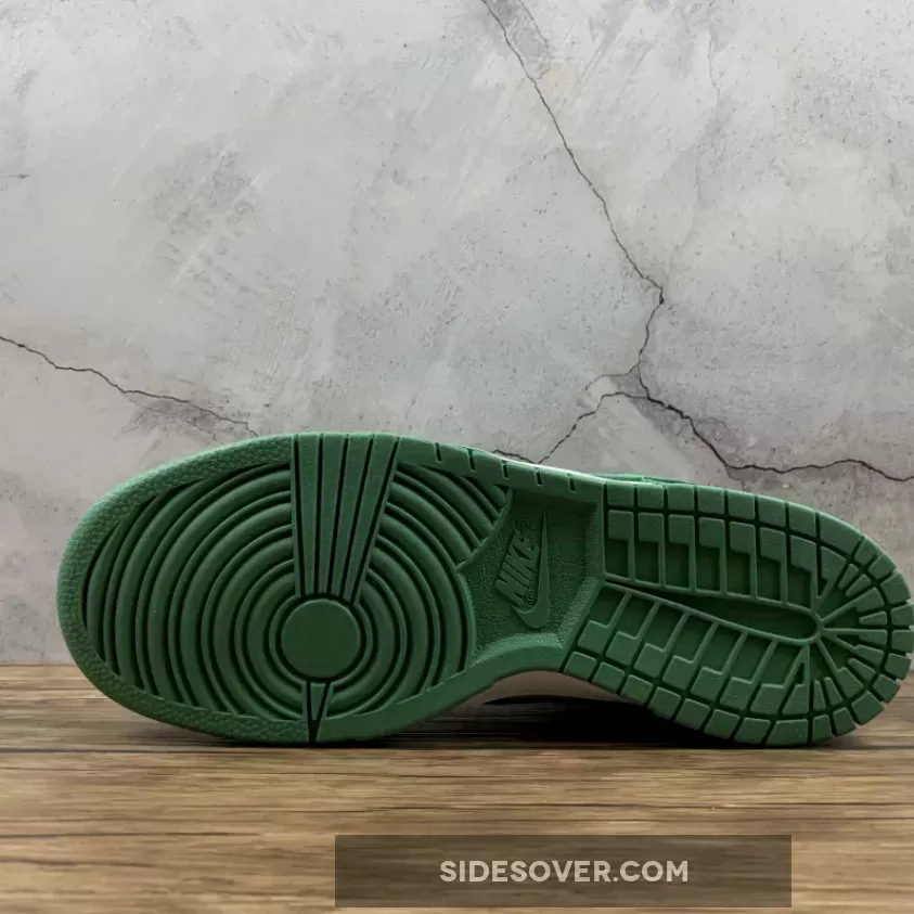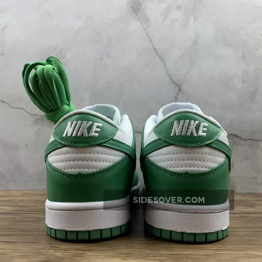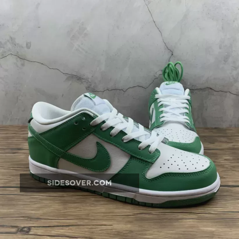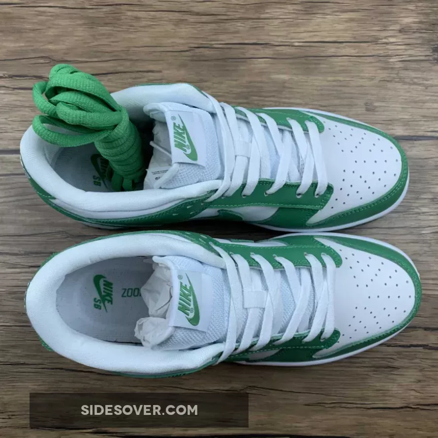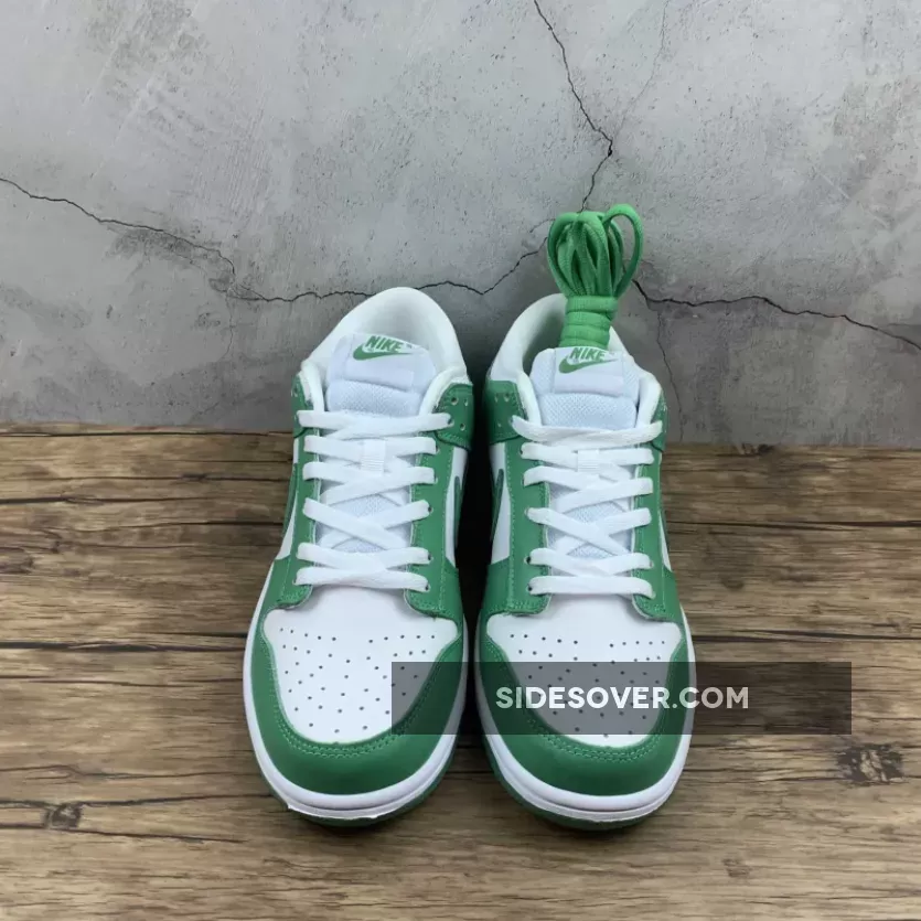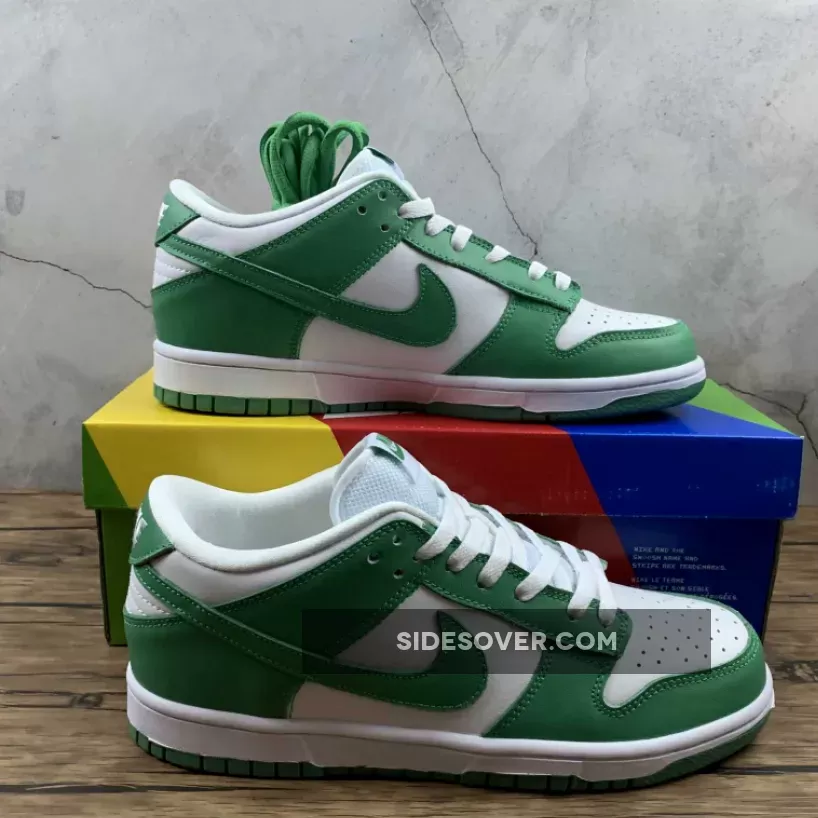 This offering of the Nike Dunk Low features a White leather base with Green Glow overlays, Swoosh logos and rubber outsole.