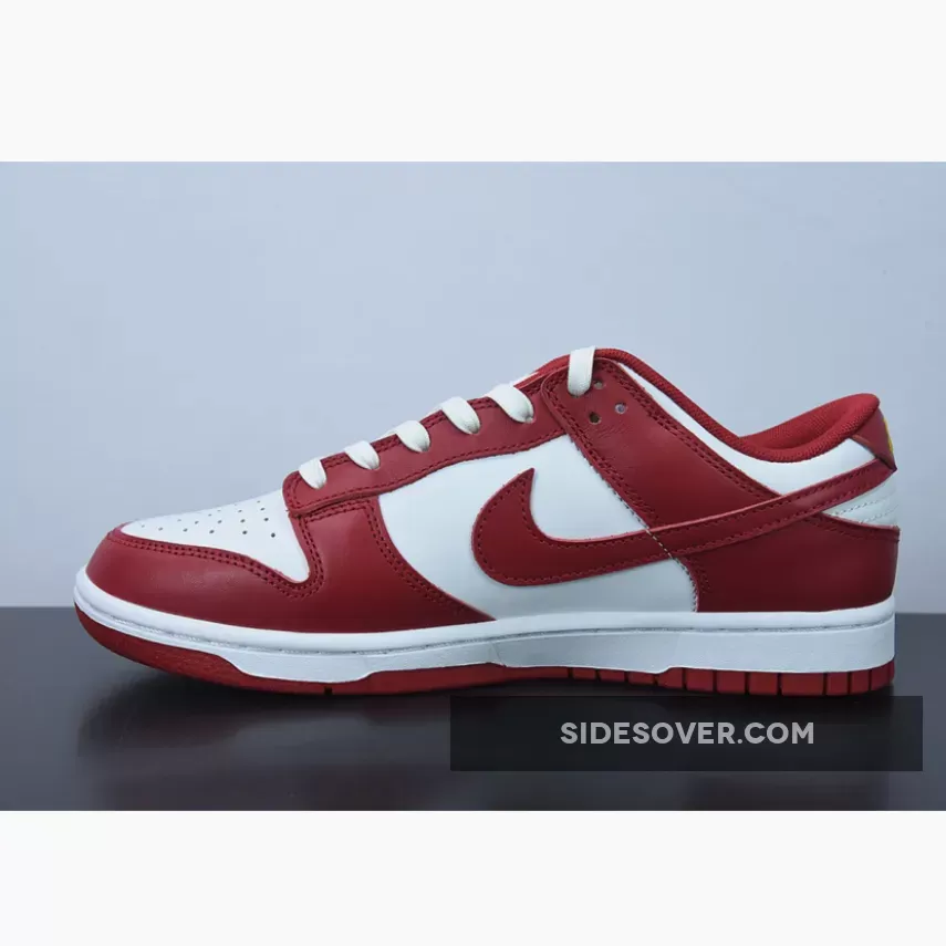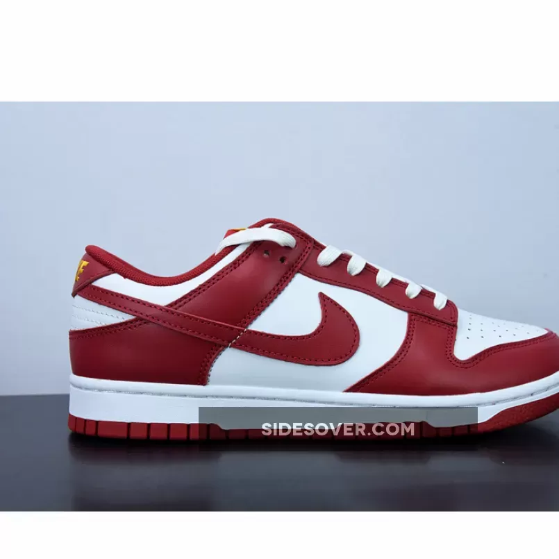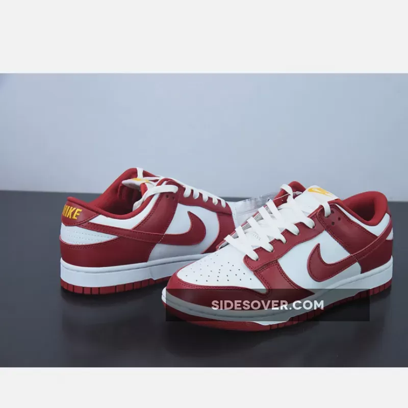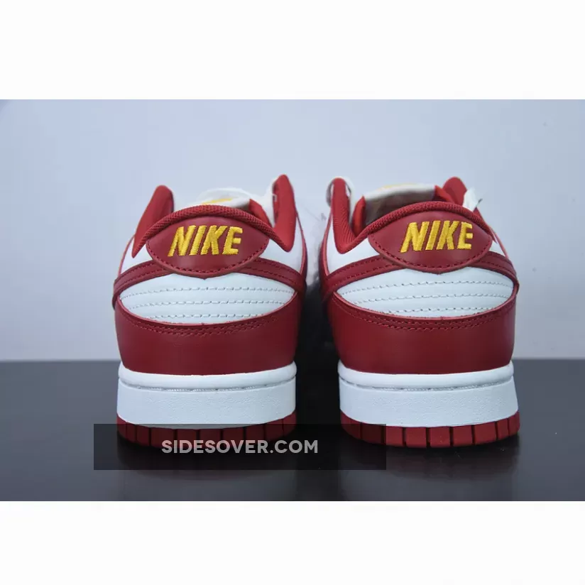 Nike Dunk Low USC is constructed of leather material on the upper and rubber on the outsole. Nike Dunk Low USC features a colorway composed of white, gym red, and yellow covering 90% of the upper, with yellow Nike branding at the heel and tongue. A white perforated vamp and a red suede Swoosh complete the design of this sneaker.