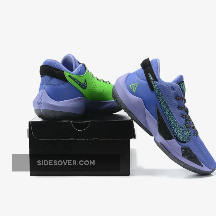 The latest model is dressed in a purple upper with hues of neon green on the medial and lateral sides. Other eye-catching details include speckled print on the laces, tongue logos, outsoles, and the two Swoosh logos.