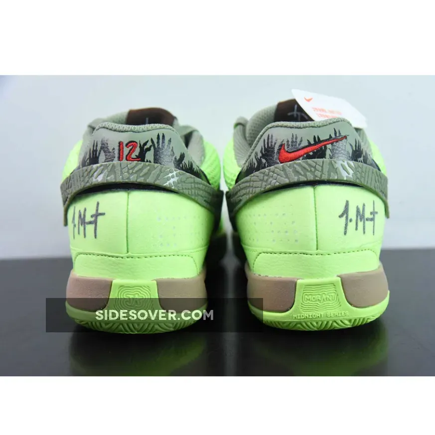 Its construction combines synthetic leather and mesh materials, resulting in a striking appearance. The Lime Blast upper is complemented by an Oil Green inner lining, tongue labels, and ankle collar. Morant’s signature logo on the tongue label takes on a mismatched arrangement that ostensibly references werewolves and vampire with their color scheme. Notably, the ankle collar and Swooshes feature zombie hands, adding to the eerie atmosphere. A subtle detail worth mentioning is the embroidered Red number “12” on the heels, reminiscent of blood.