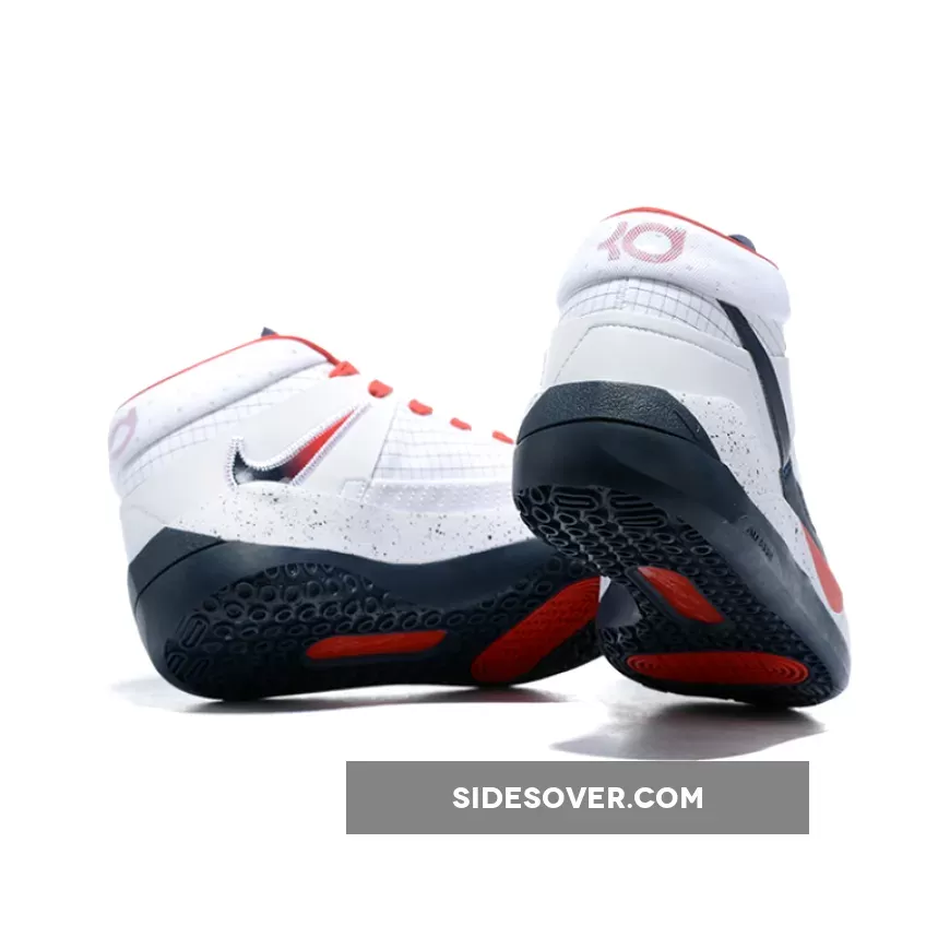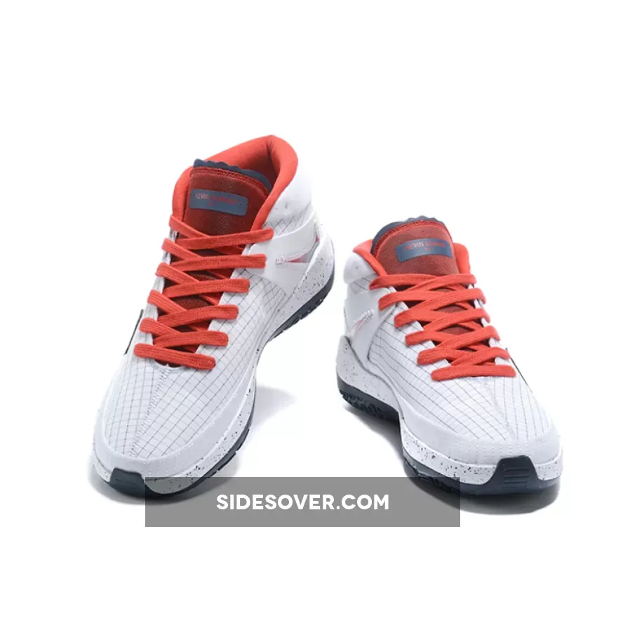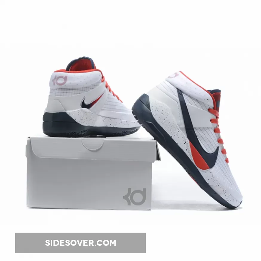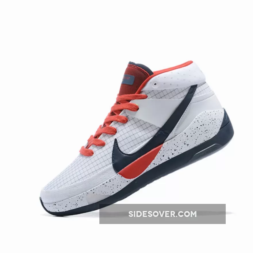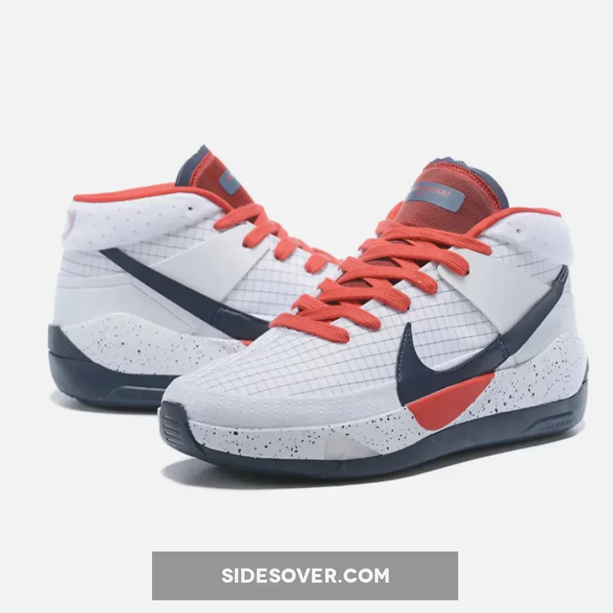 This offering of the Nike KD 13 features a White upper covered in a grid pattern with Red detailing on the tongues, laces, lining, “KD” heel logo and outsole. A Navy leather on the lateral with a gradient stitched Swoosh on the medial atop a speckled midsole and Navy rubber outsole completes the design.