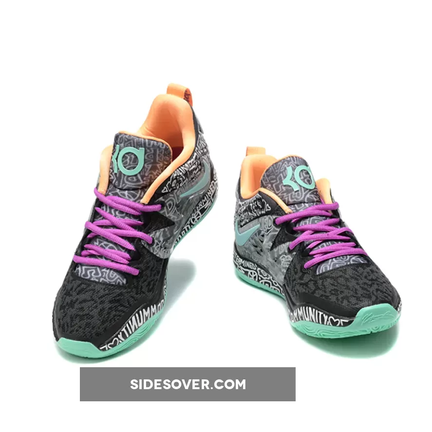 Inspired by NBA player Kevin Durant, this Nike shoe features a upper section made from black knit textile. The seafoam green Swoosh matches the branding on the tongue as well as the rubber outsole with topographical map patterning. Bright peach-yellow appears on the heel tab, “Easy”-branded pull tab, and sock liner. Violet laces, a visible Air Zoom unit in the midsole and a wave pattern sole complete the look.