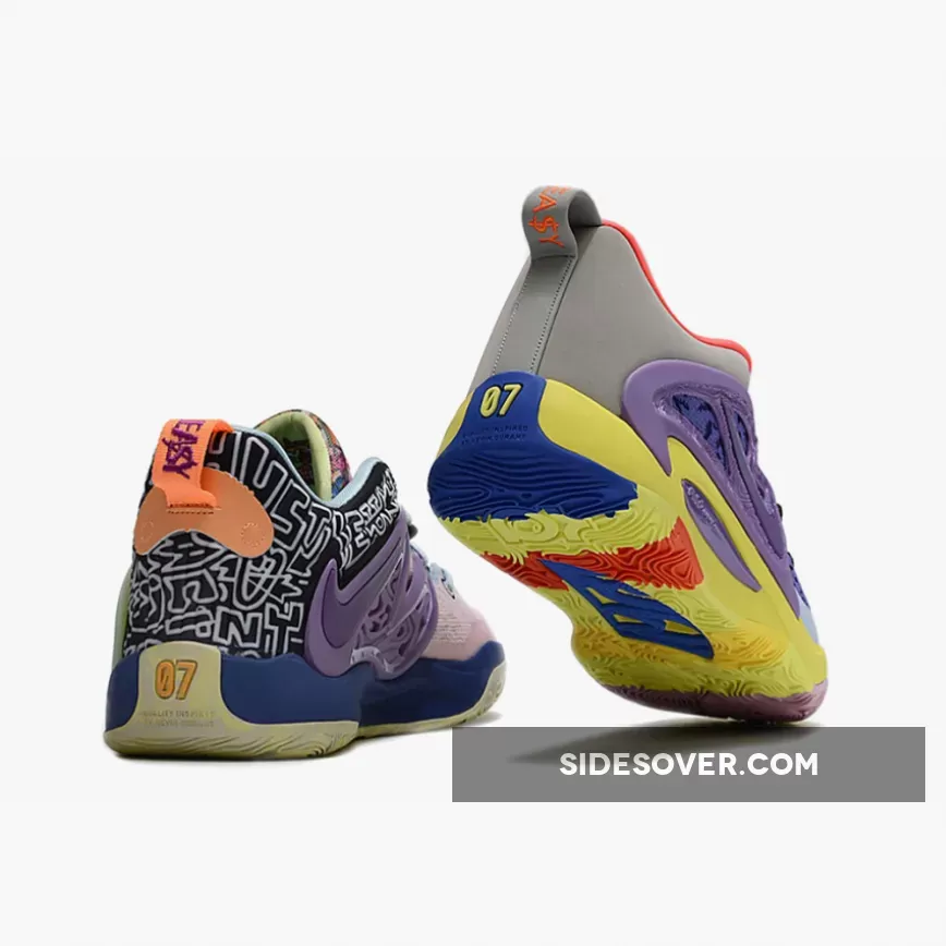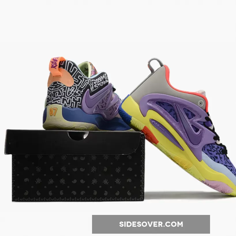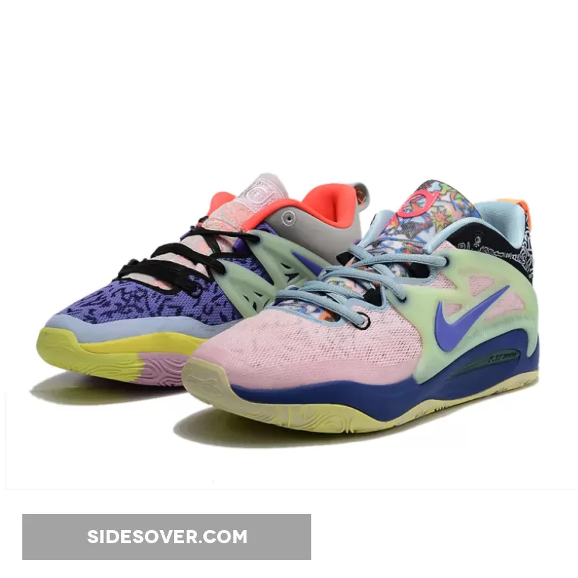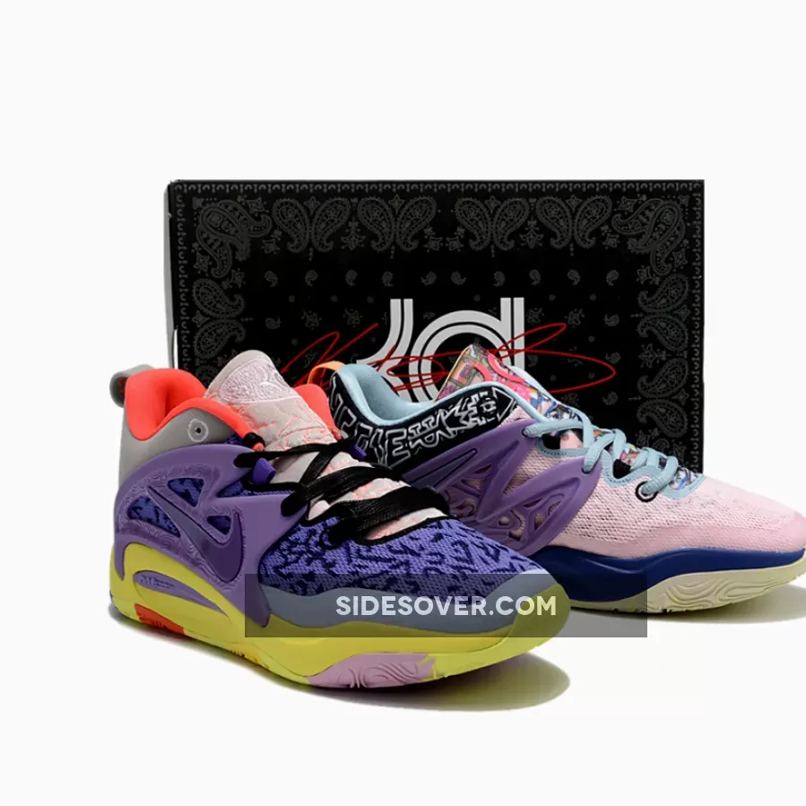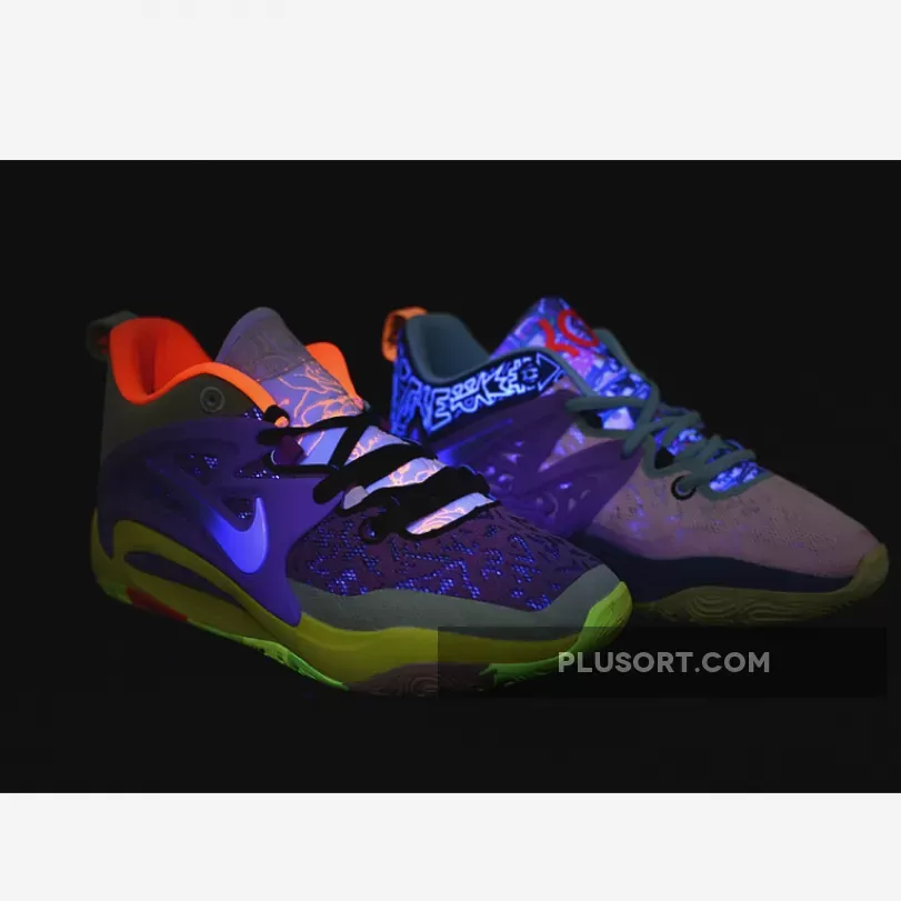 This offering of the Nike KD 15 mixes elements taken from a variety of past releases in different prints and materials. The mismatched shoes share two things in common — the left cage replicates the “Psychic Purple” glow-in-the-dark look while the right favors the “B.A.D.” look in lavender.