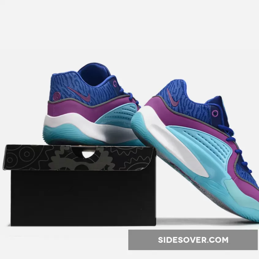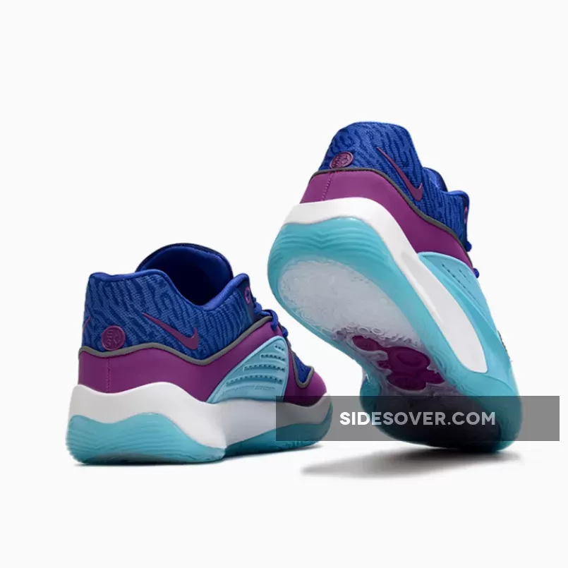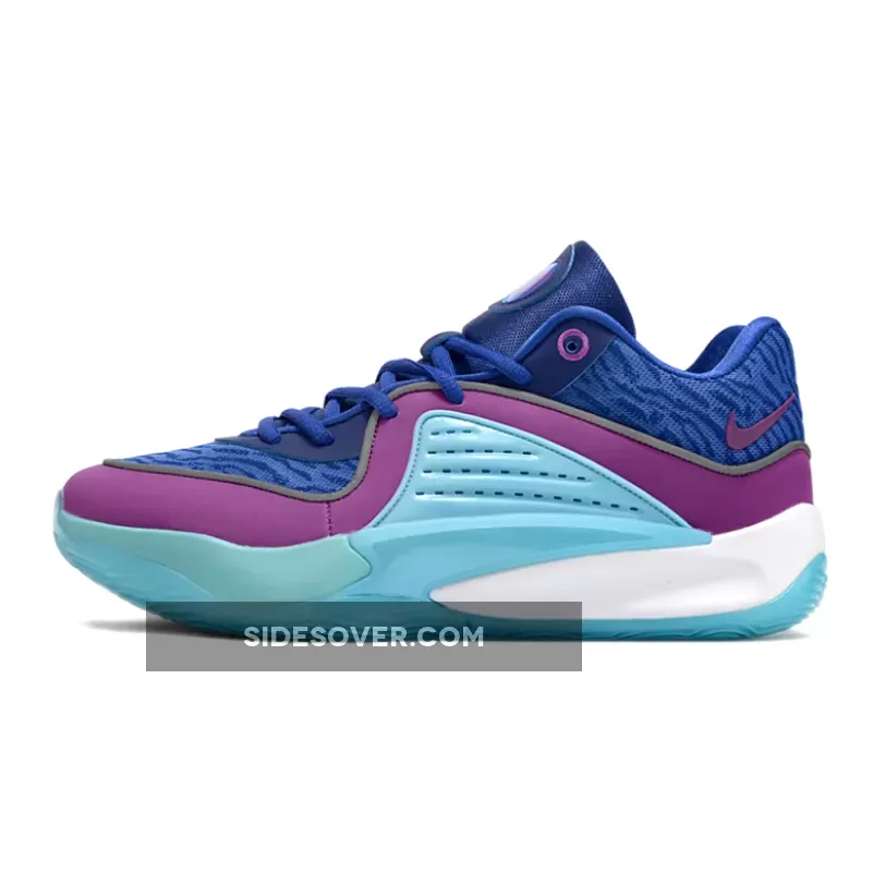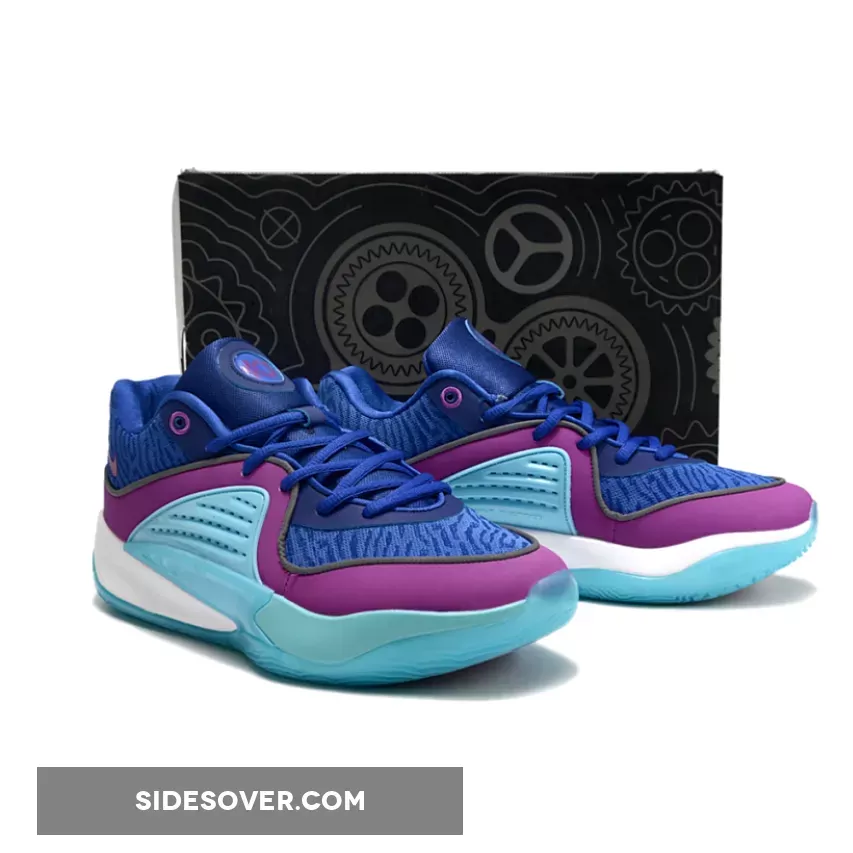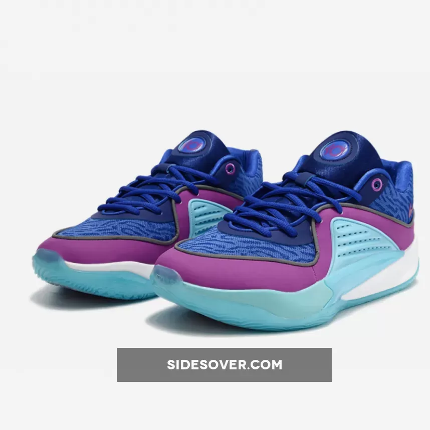 This KD 16 “Deep Royal Vivid Purple” iteration, sporting a blue-based upper with purple and Baltic Blue accents. This pair comes in three overlays ranging from sky blue to purple on its base and two shades of a darker blue on the top of the pair. The logos on the heel and on the tongue stand out in purple. The set rests on a sole in sky blue and white.