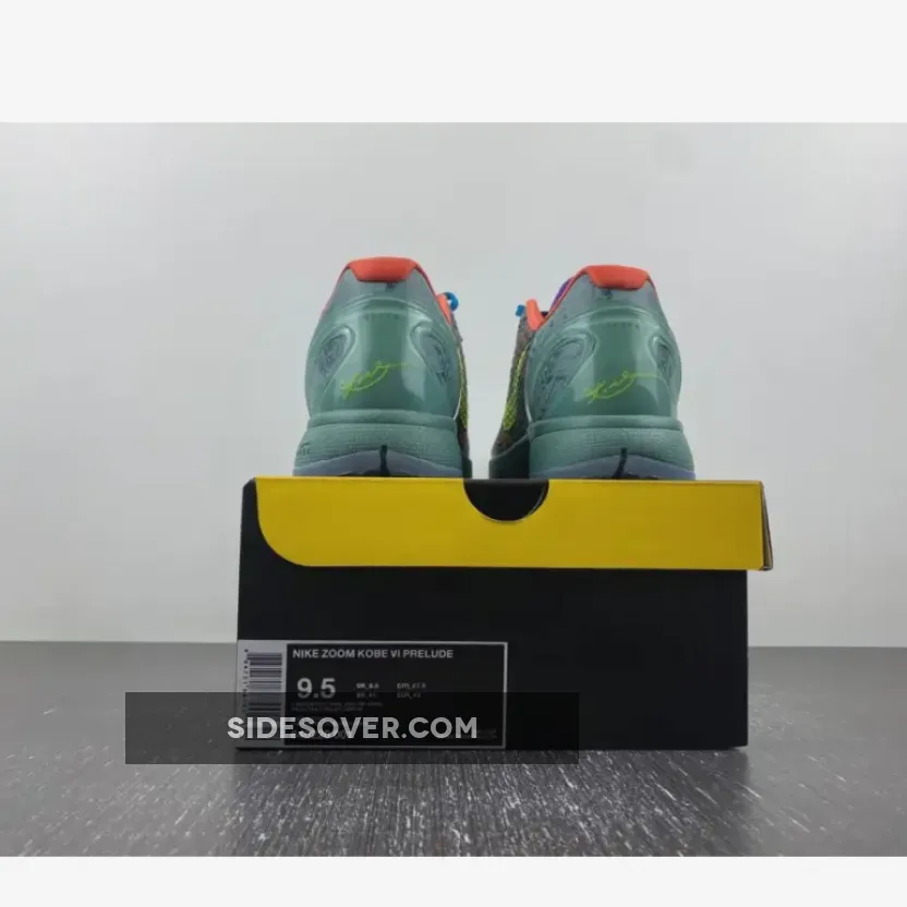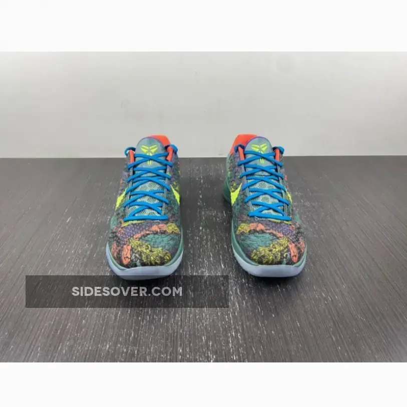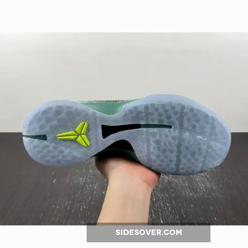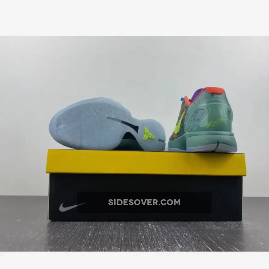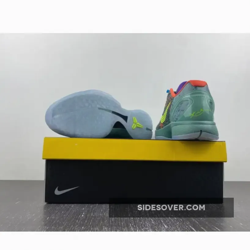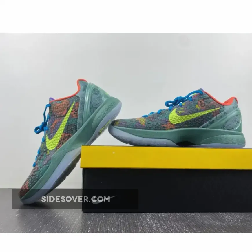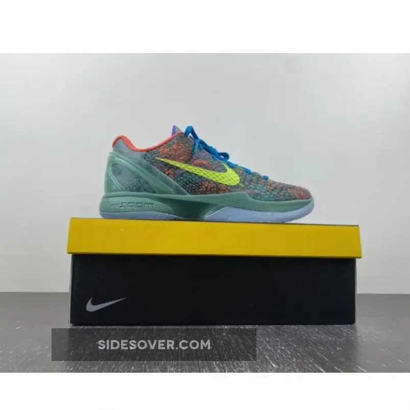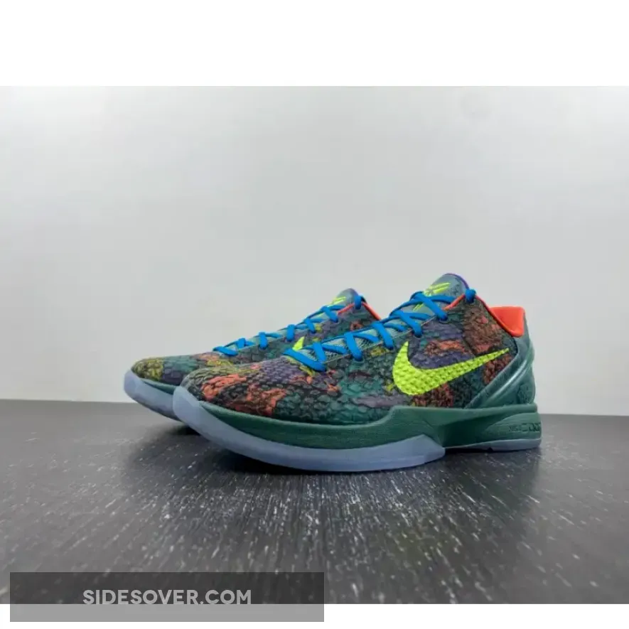 The Kobe 6’s signature snake-like upper is coated in a multicolor look with graphics and feature the ocean, fish, octopus, and sharks. Same animal, different beast and split by bold volt branded hits. Though its look is nearly identical to the 2012 release, it features updated Protro construction with an upgraded last, softer midsole foam, a larger Zoom Air cushioning unit in the forefoot and an outsole pattern with an increased surface area for better grip.