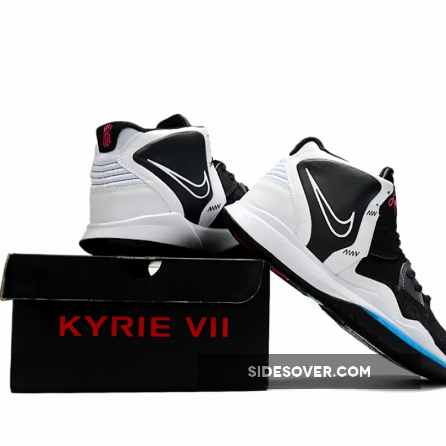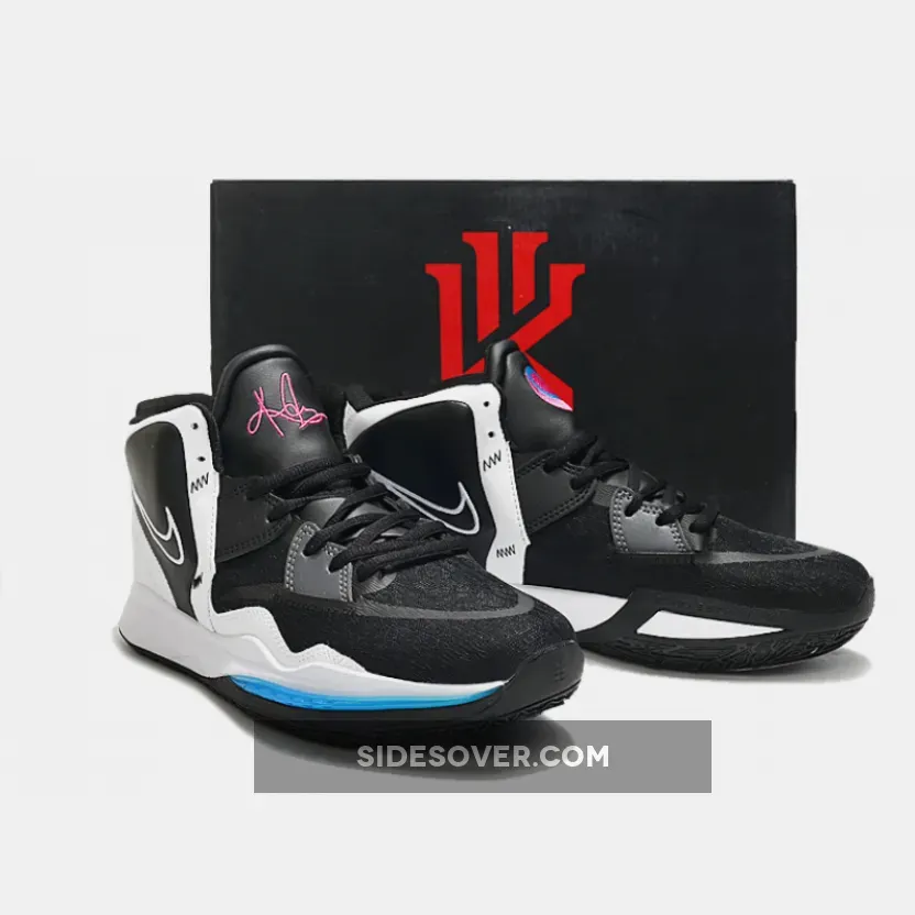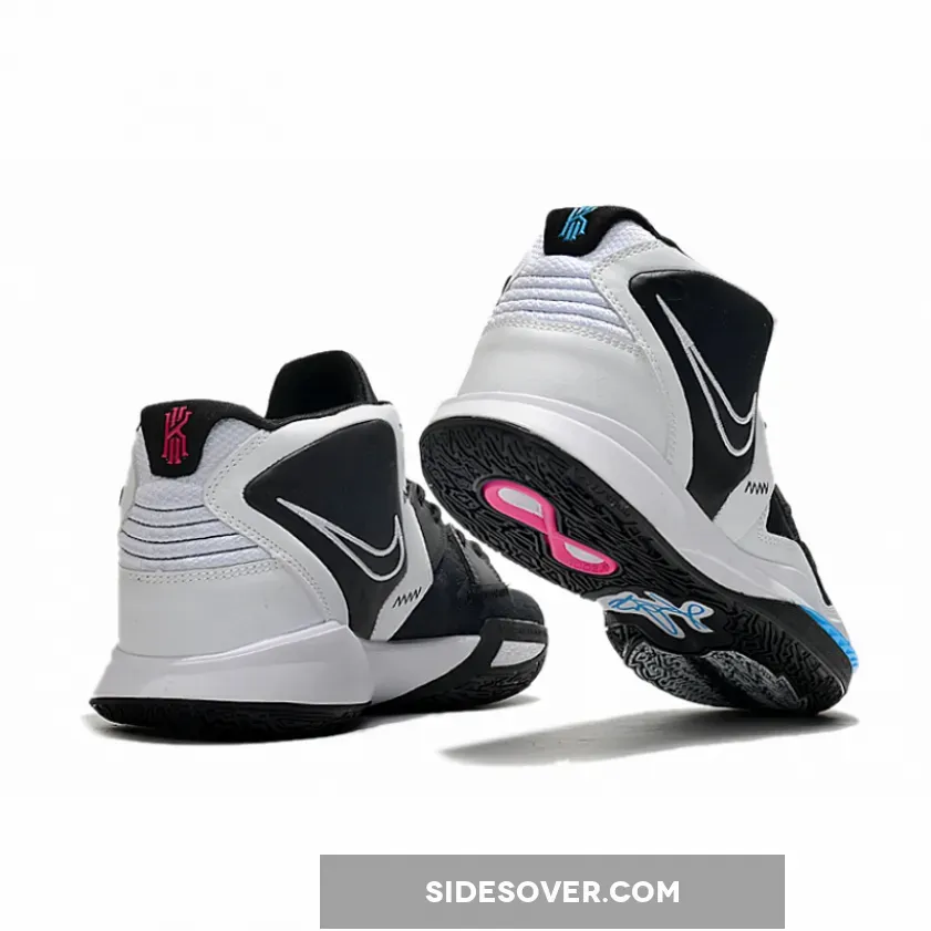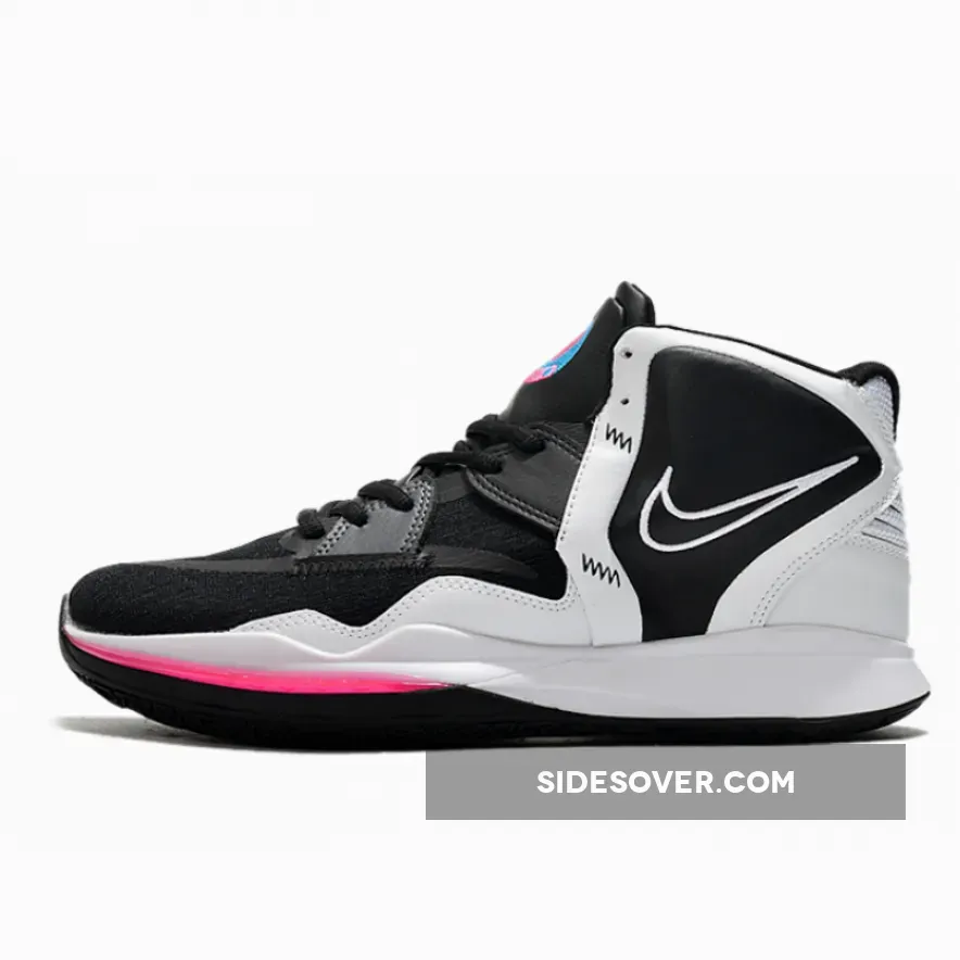 This offering of the Nike Kyrie 8 comes constructed in a mix of mesh and leather dressed in Black and White highlighted with Pink and Blue accents. Finishing off the design are Kyrie logos appearing on the tongue, heels, insoles and rubber outsole.