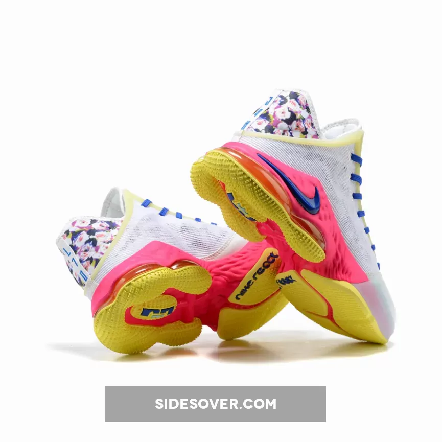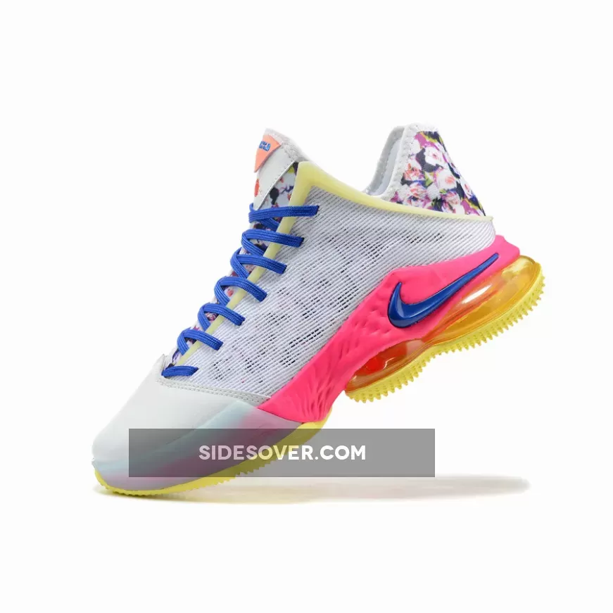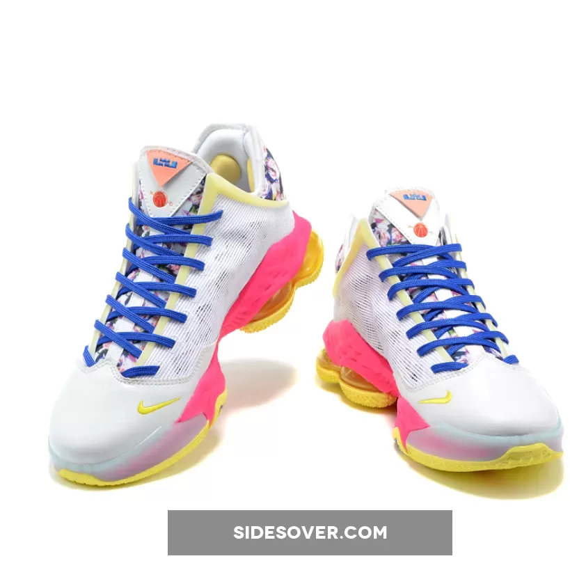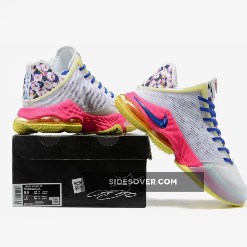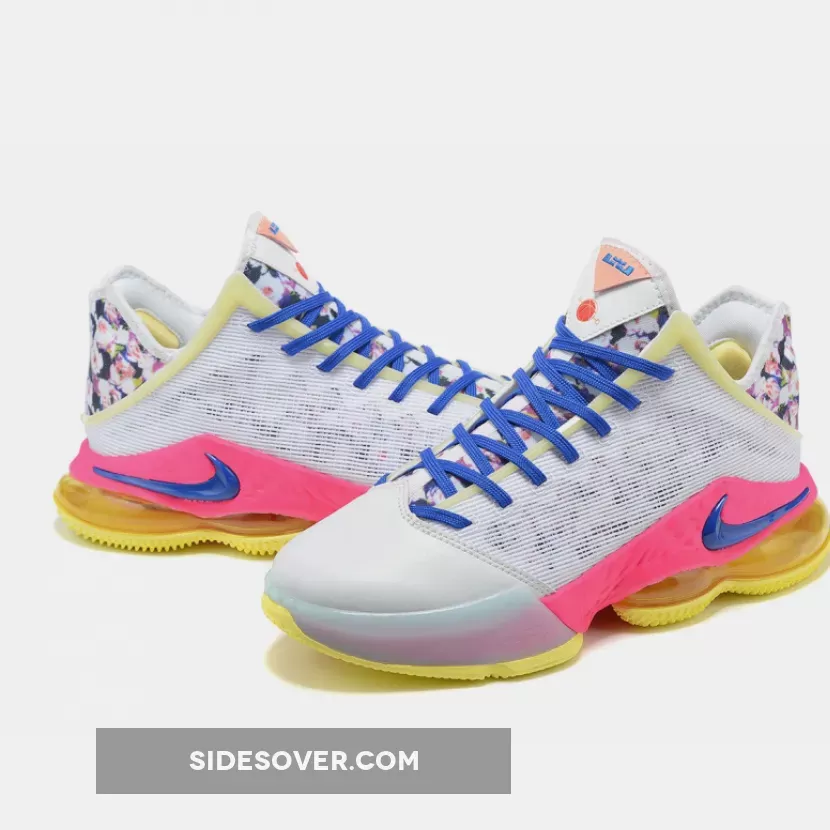 This offering of the Nike LeBron 19 Low features a White textile mesh upper and leather toe box paired with pastel accents perfect for spring. Highlighting the shoe are floral patterns on the tongues and heels.