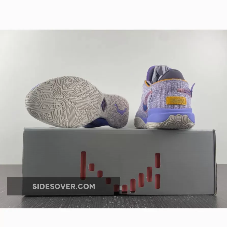 The Nike LeBron 20 ‘Purple And Gold’ delivers a pastel colorway of LeBron James’ 20th signature shoe. A subtle lavender hue is executed on a knit textile upper with stacked Swooshes in blue and metallic gold on the lateral side. ‘XX’ branding appears on the lace dubrae and tongue, the latter further embellished with LeBron’s debossed signature. The low-top is mounted on a lightweight Cushlon midsole, equipped with a paisley-print lateral guardrail for improved stability during side-to-side movements. The cushioning setup combines a Nike Air unit in the heel and springy Zoom Air in the forefoot.
