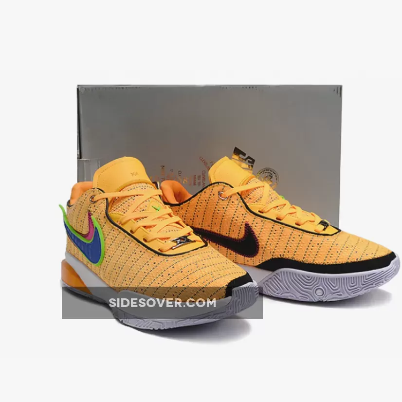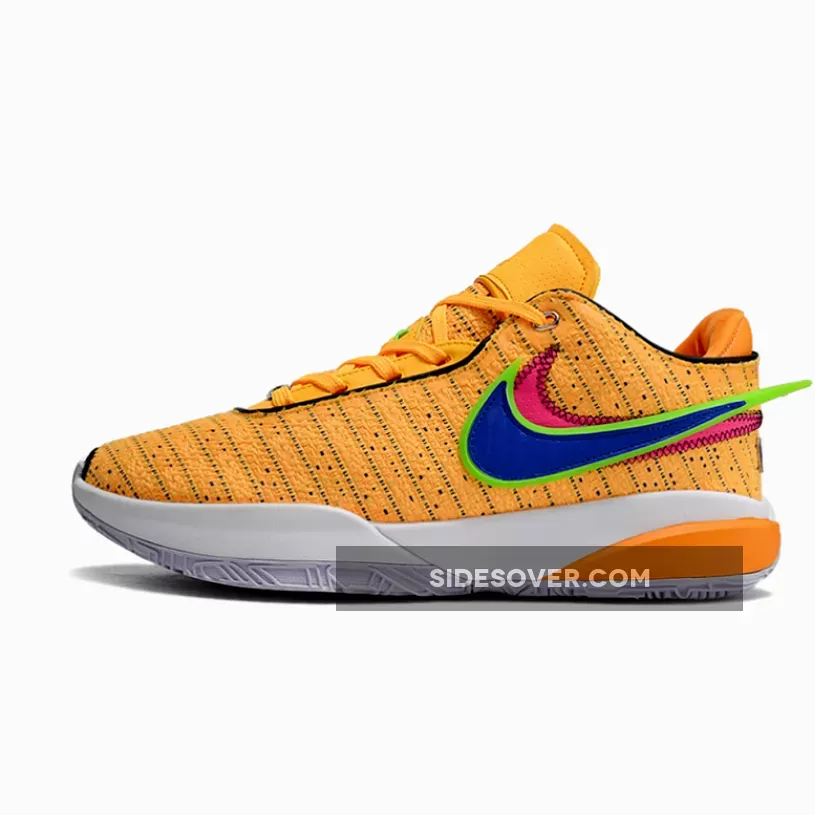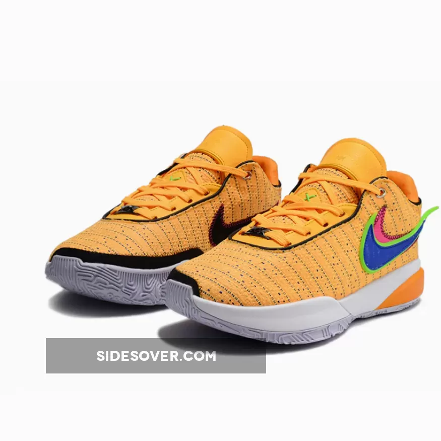 Utilizing a Laser Orange, Racer Blue, Hyper Pink, and White color combination. This offering of the Nike LeBron 20 features a Laser Orange knitted upper with double-stacked leather Swooshes on the lateral and special “XX” lace dubraes and insole branding. A White midsole atop a Soft Pink rubber outsole completes the design.