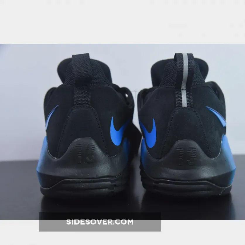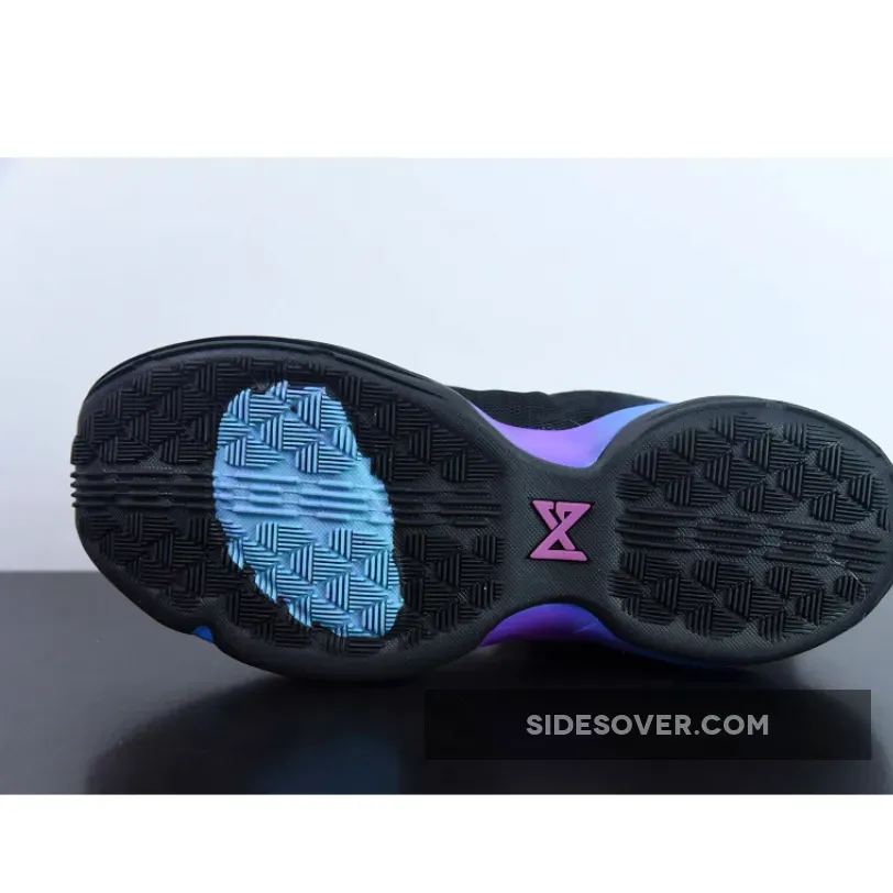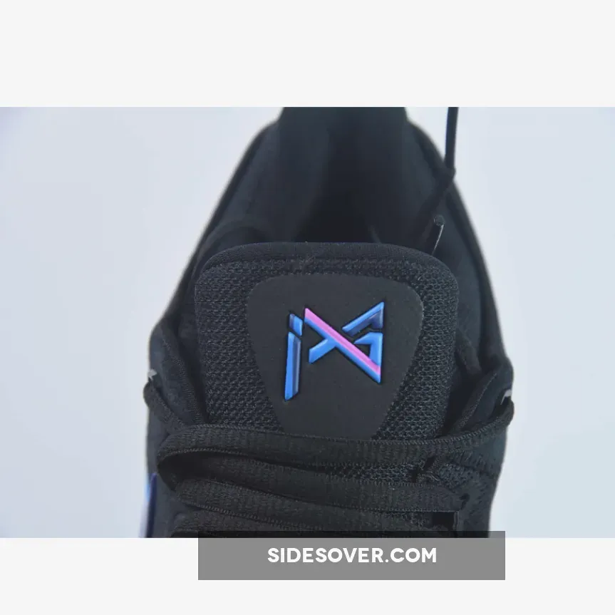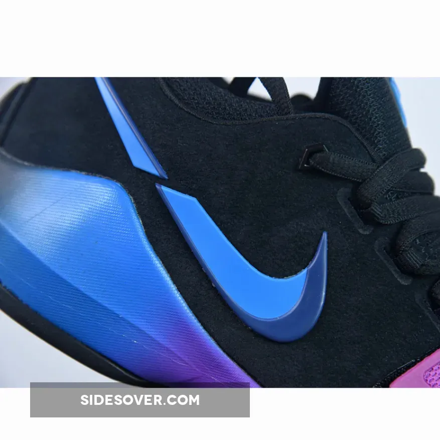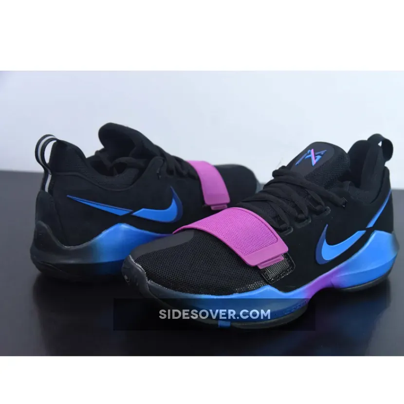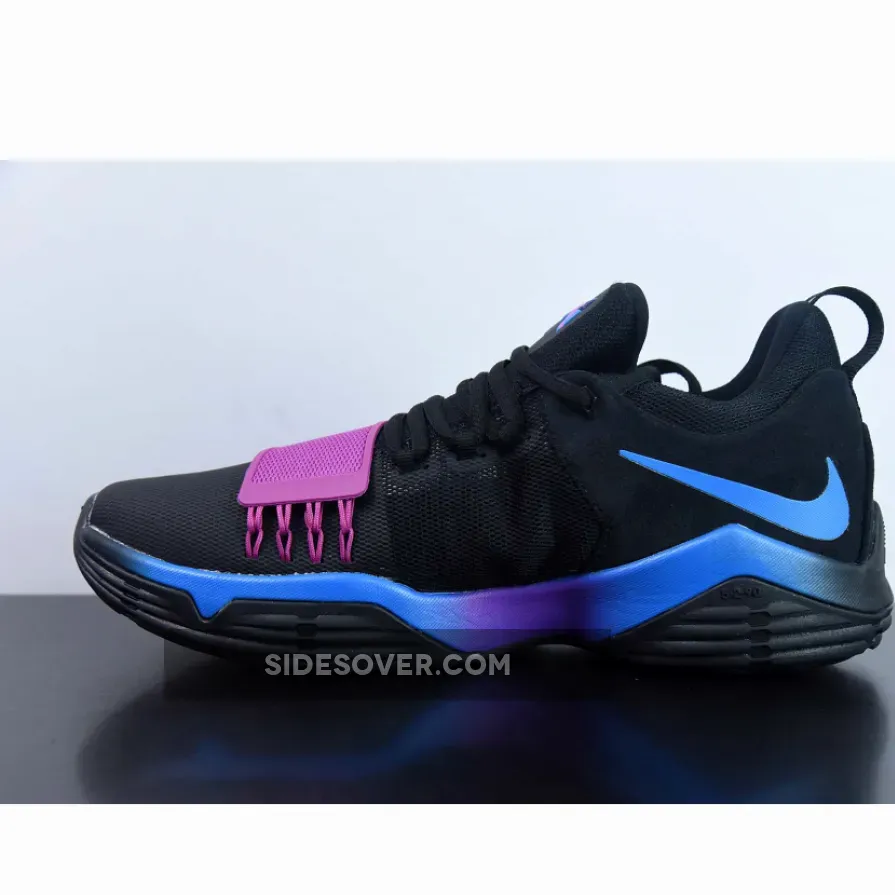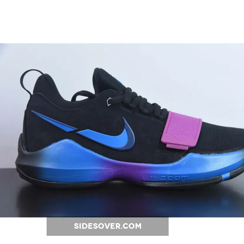 This PG 1 features a predominantly Black upper with shades of blue and purple on the gradient midsole, midfoot strap, tongue logo, and the broken Swoosh logo.