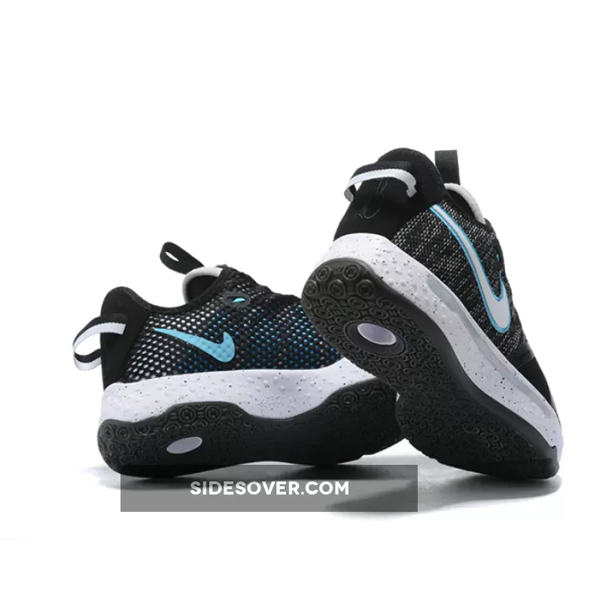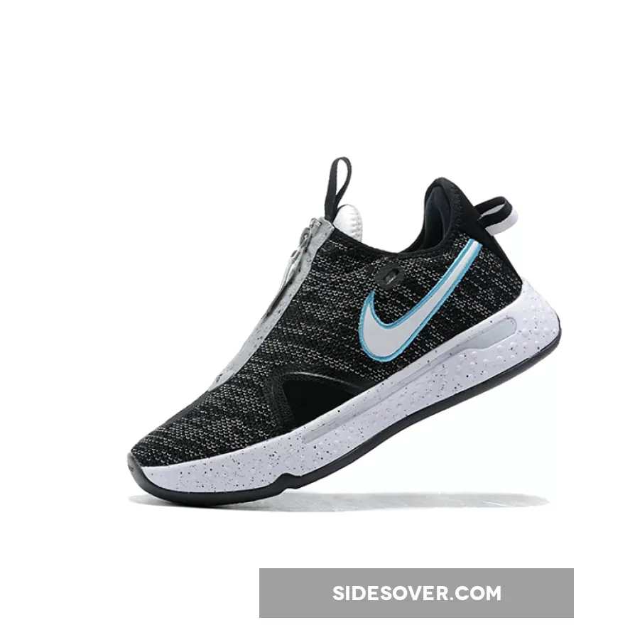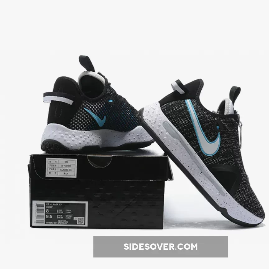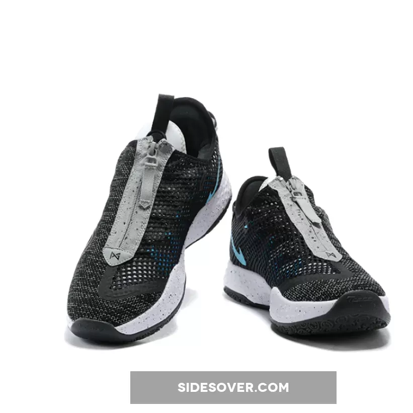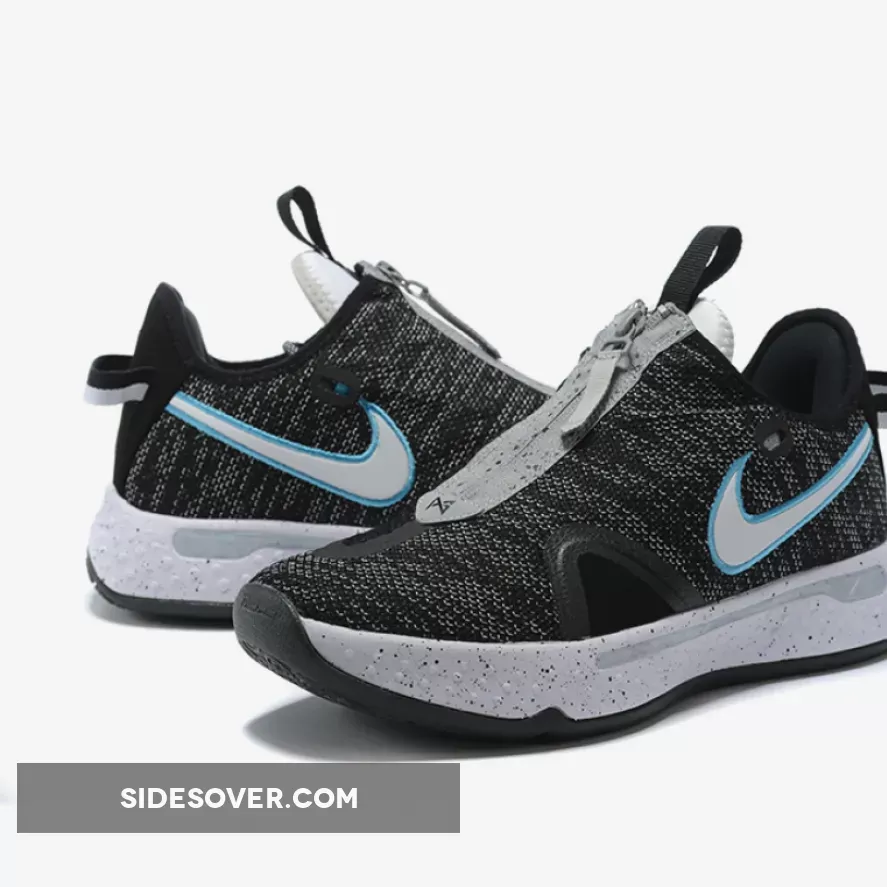 Dressed in a combination of Black, Grey, Blue, and White colors. This PG 4 features a knitted heathered upper with White Swooshes on the sides outlined in Blue. Speckled laces and midsole atop a Black rubber outsole completes the design.