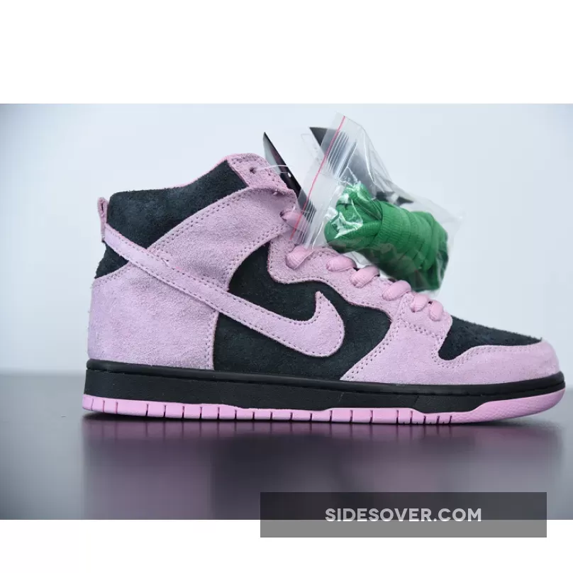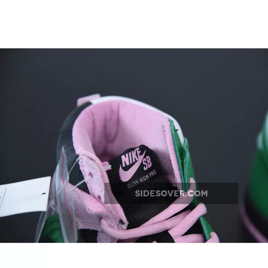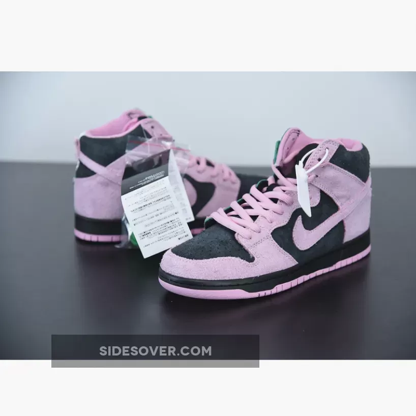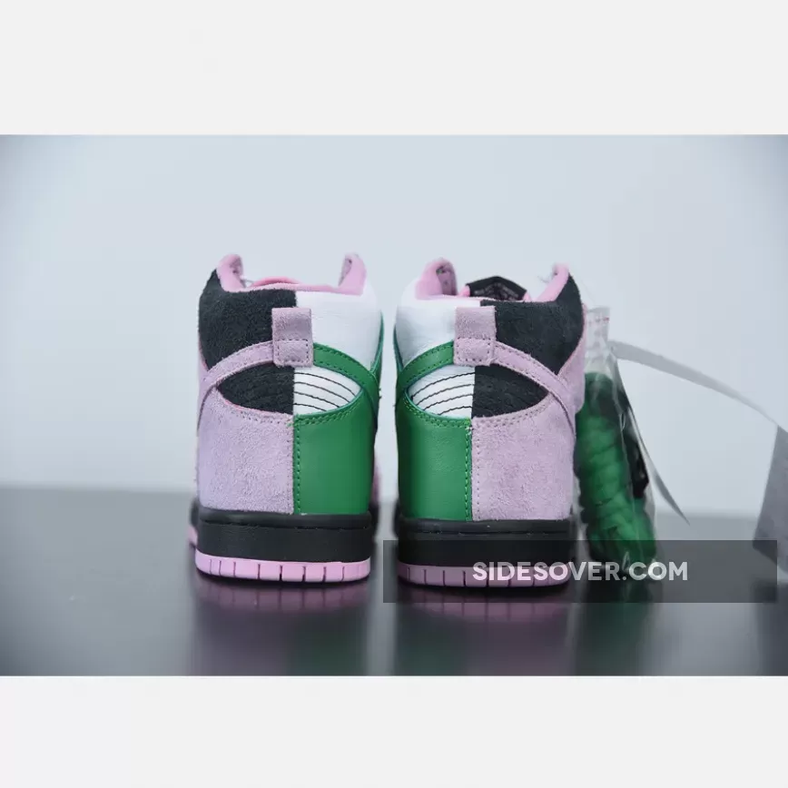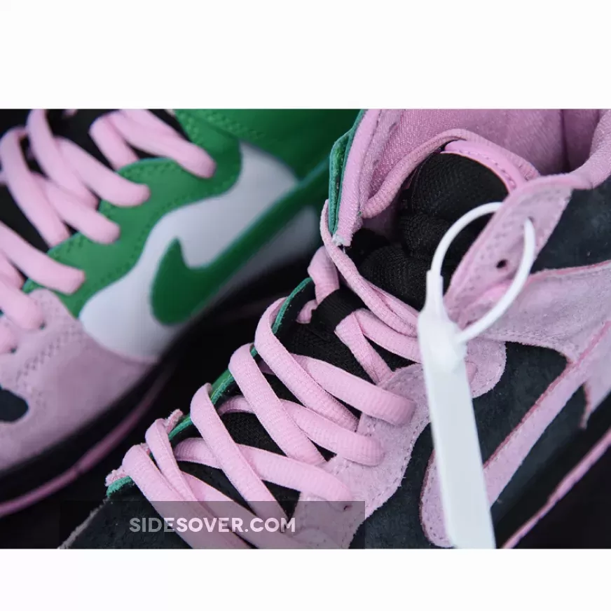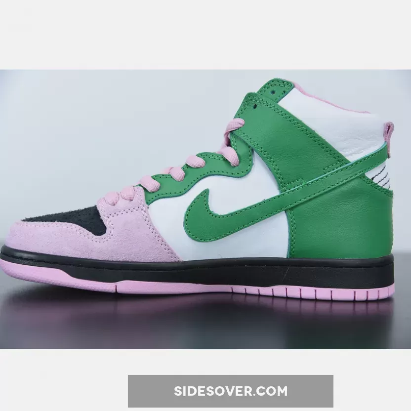 this Nike SB Dunk High comes dressed in a Black, Pink Rise and Lucky Green color combination. Pink and Black suede lands on the lateral side and toe box while Celtics’ Green and White leather lands on the medial side. When you take a picture with your camera or phone and invert the colors, you will see the colors flipped.