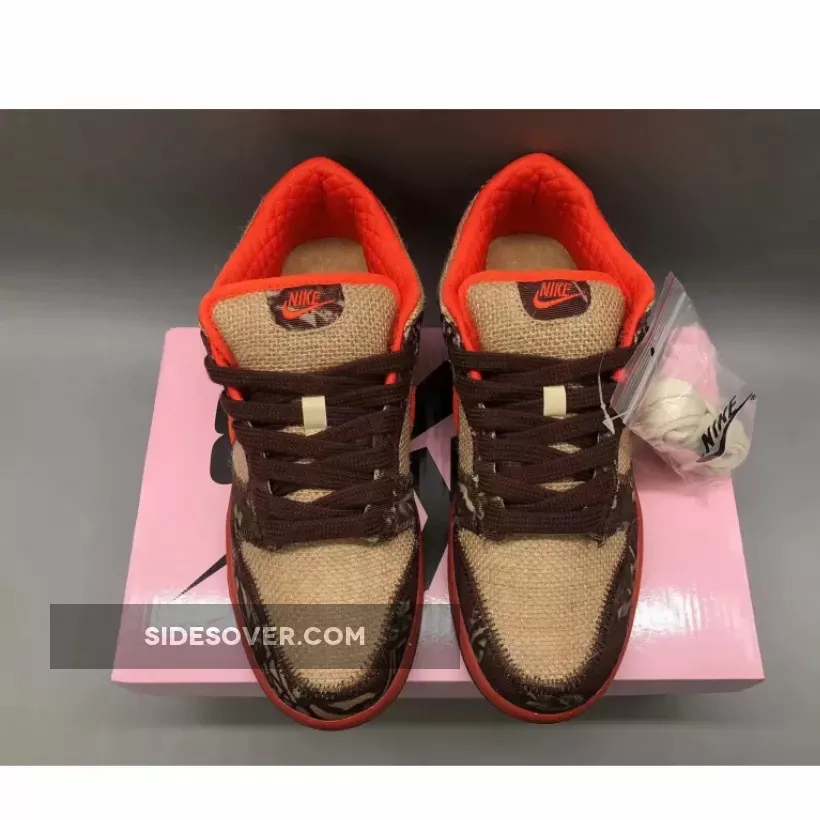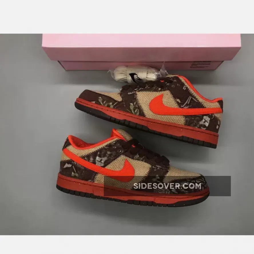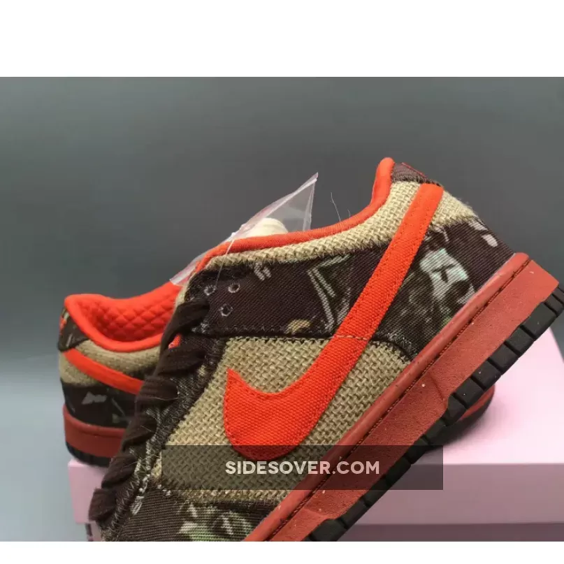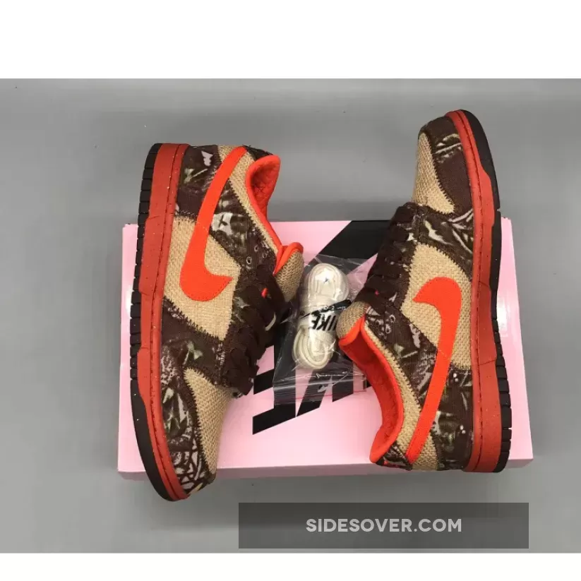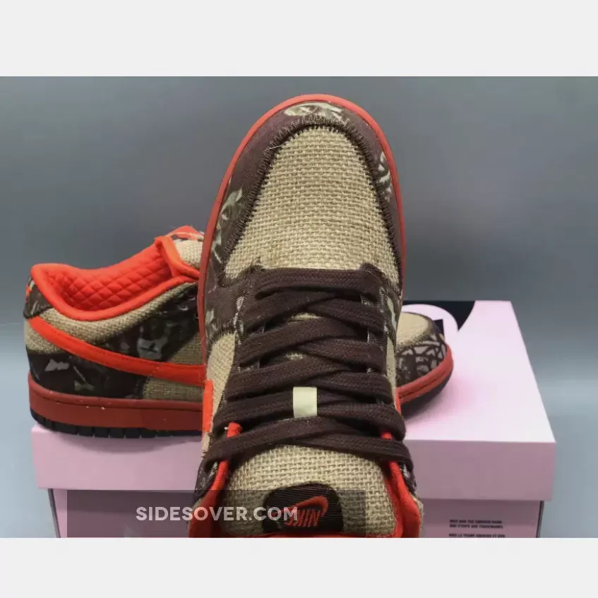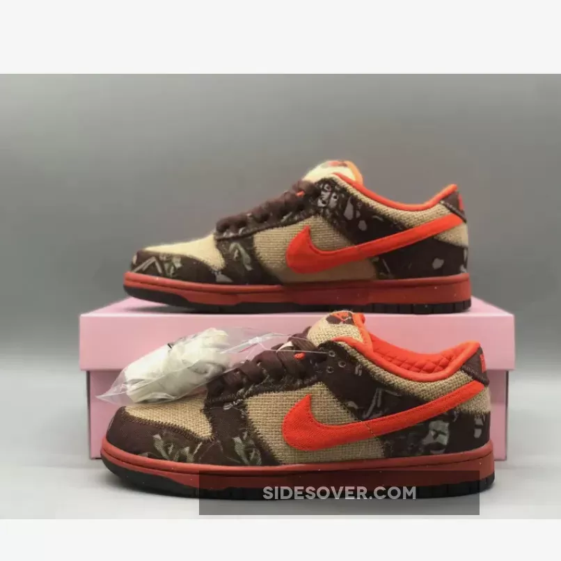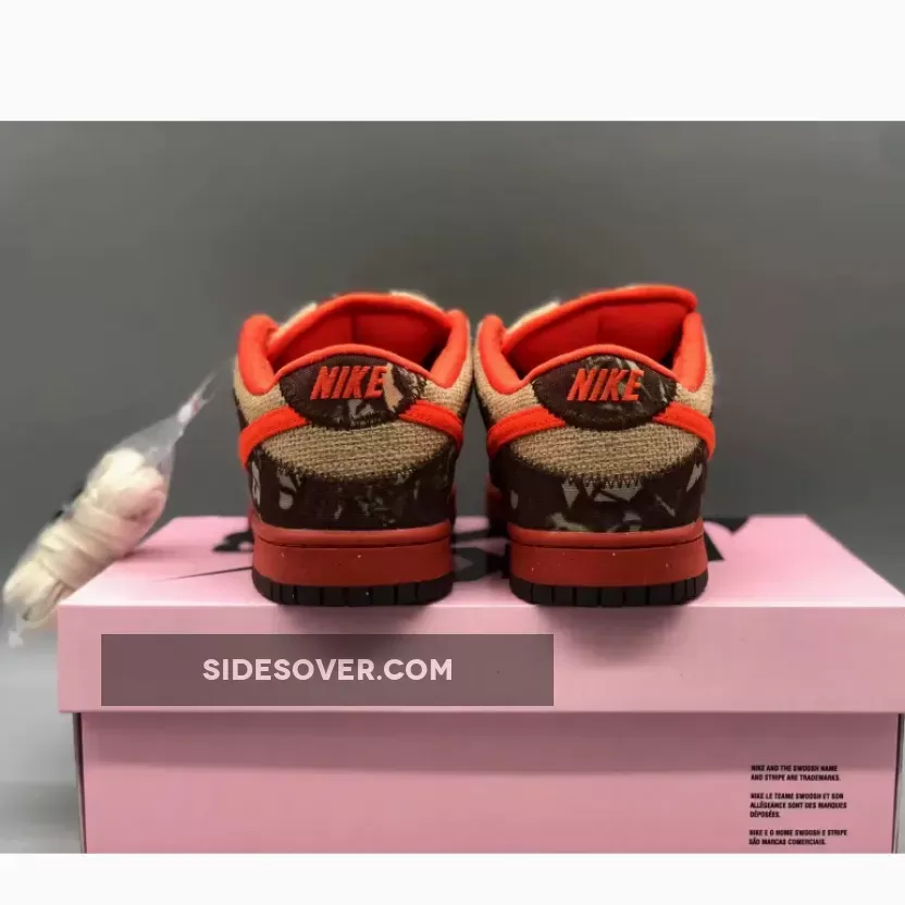 Hailing from the Nike SB Dunk’s beloved “Pink Box” era, the “Hunter” edition showcases a unique approach to Forbes’s skate shoe vision. It boasts a sturdy burlap base adorned with brown-and-white camouflage overlays. Adding a pop of color, an Orange Blaze canvas Swoosh graces both sides of the shoe, complemented by an orange quilted nylon interior lining. The design is punctuated with tonal zig-zag stitching on the overlays, amplifying its rugged charm.