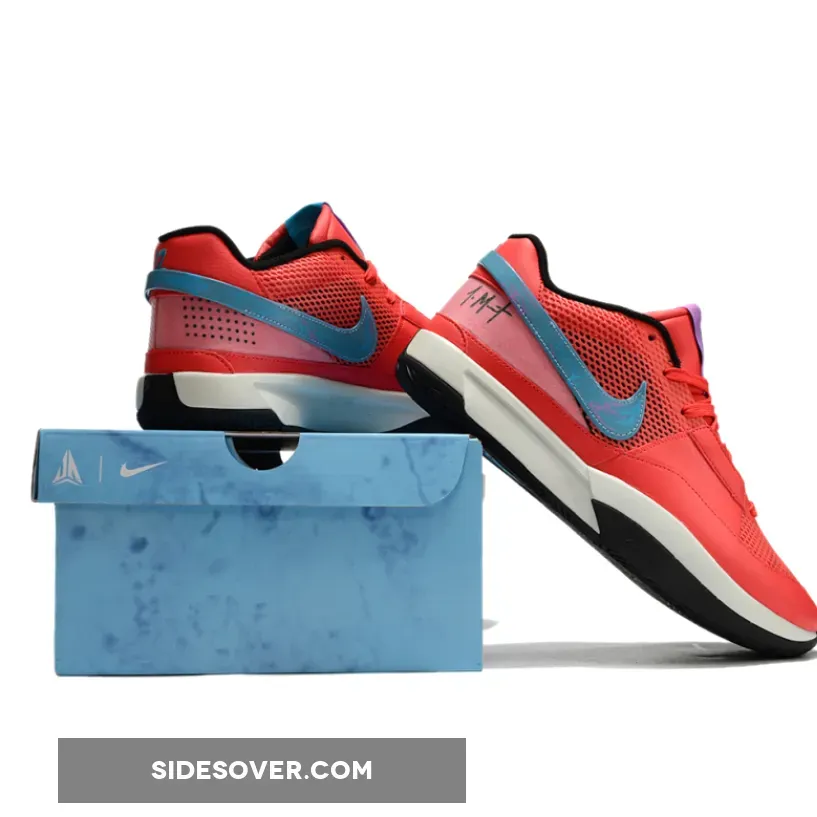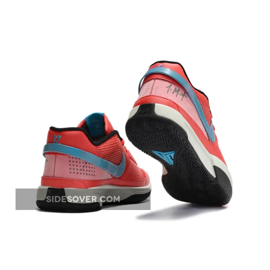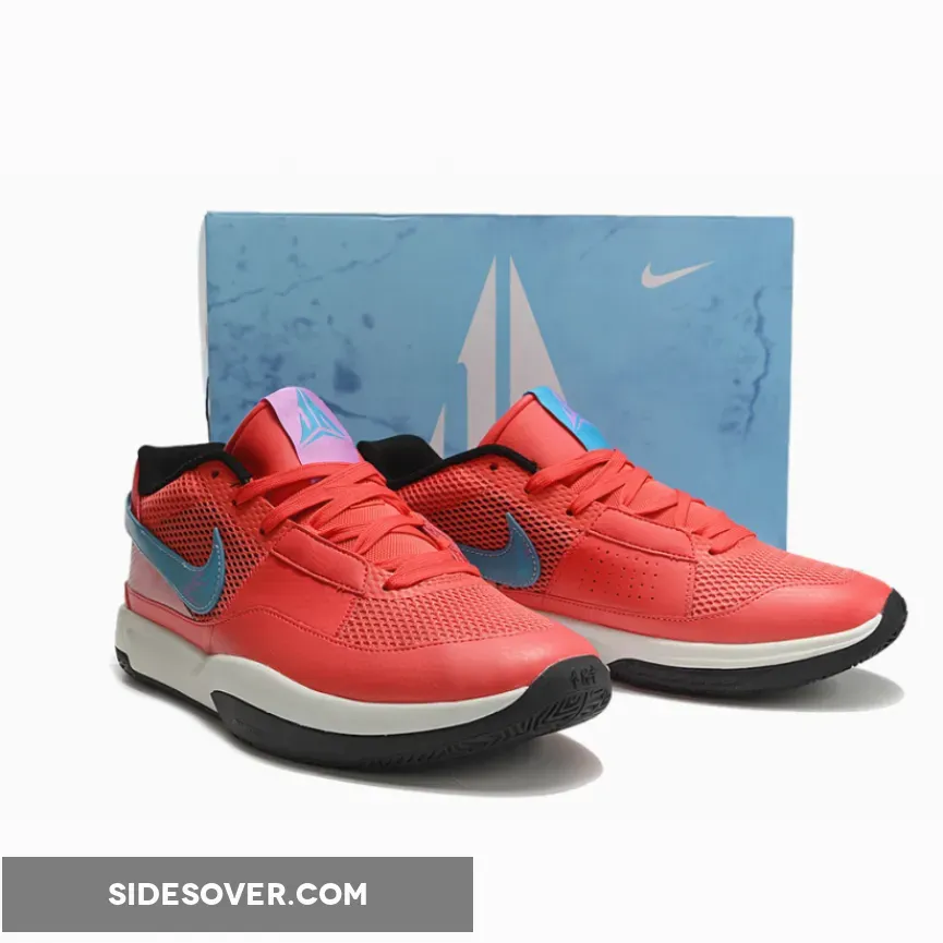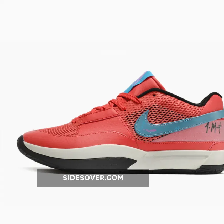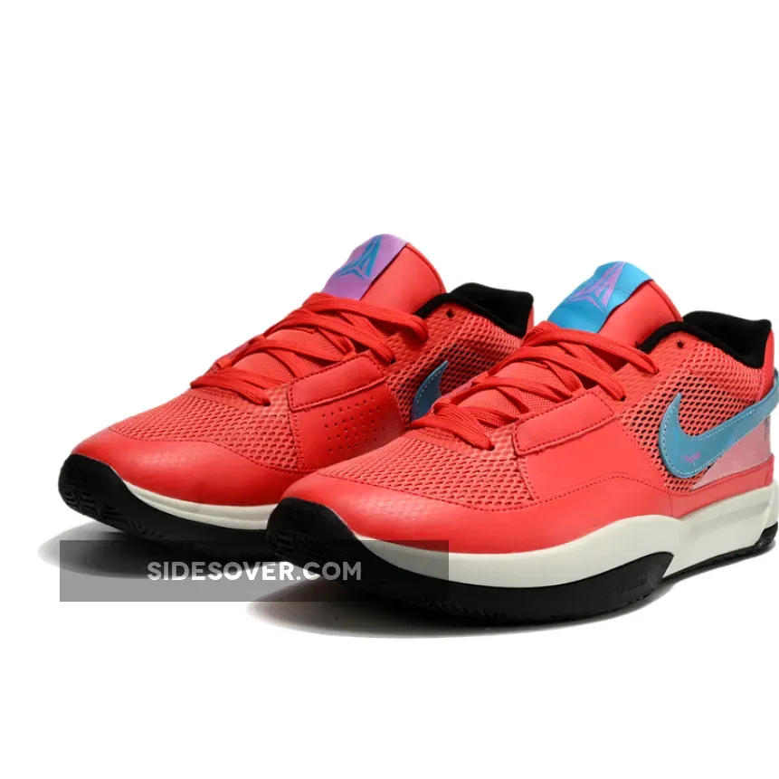 Continuing to harken to the ear-marked page in the titular section of the color wheel, the Nike Ja 1 now dresses in an overtly vibrant scheme with “Infrared” hues enveloping the mesh body, leather quarter panel, tongue construction and laces. Contrasted immediately at the jet-black nylon sock liner and tread, a supple Off-White treatment set across the midsole interrupts with neutrality. Elsewhere, bright sky blue and lilac shades pair off to anchor the tongue tabs and heel’s embroidered #12’s in a mismatched association while both the left and right foot’s full-length Swooshes come dipped in the presiding blue finish.