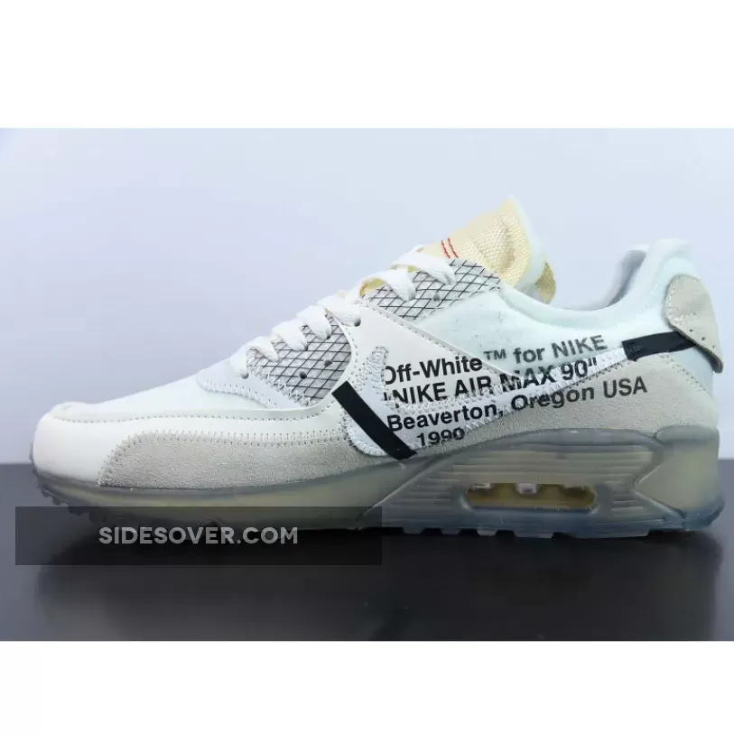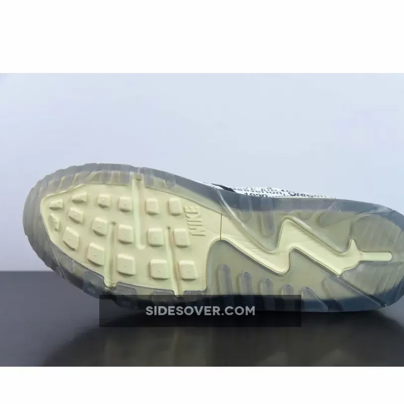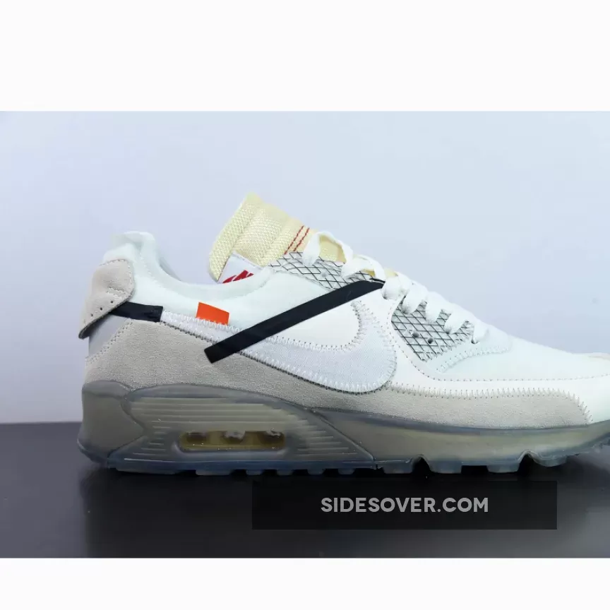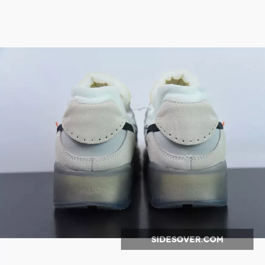 The OFF-WHITE x Nike Air Max 90 ICE features a variety of materials on the upper that include leather and suede.