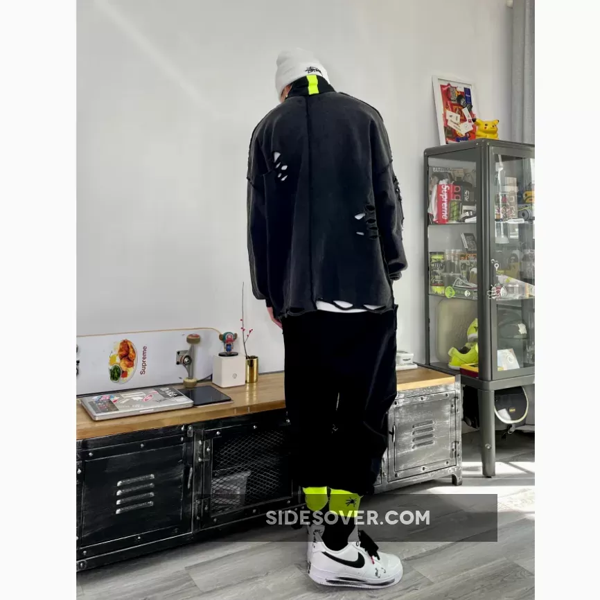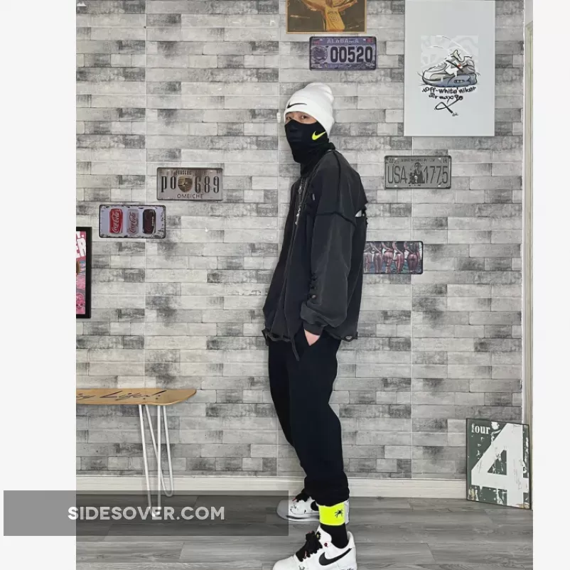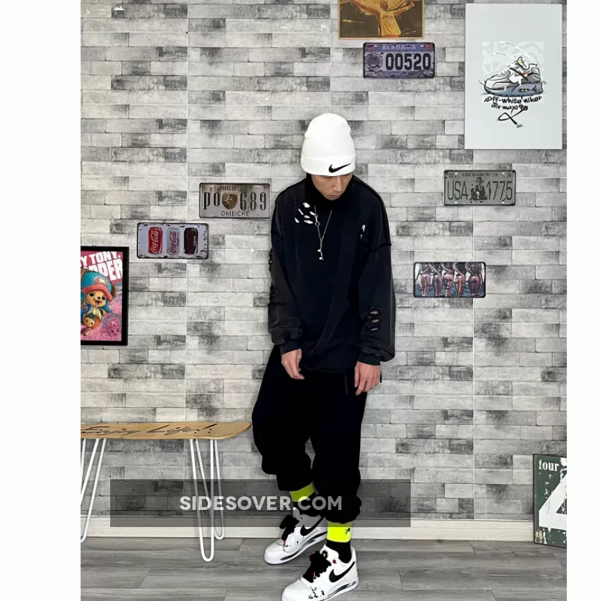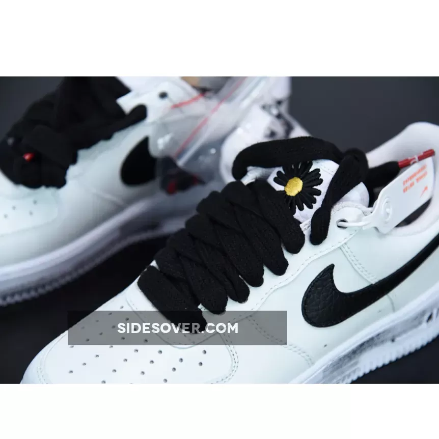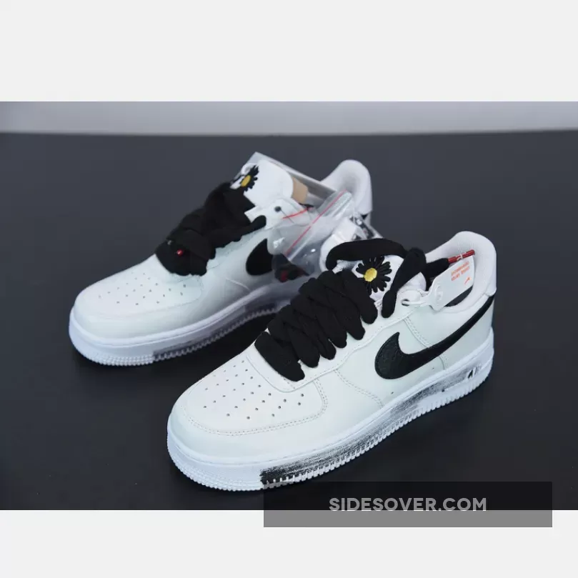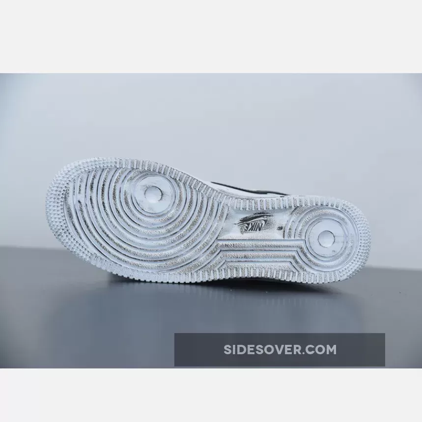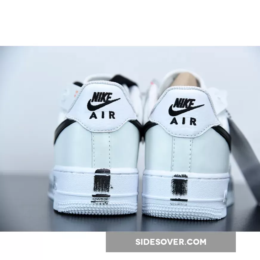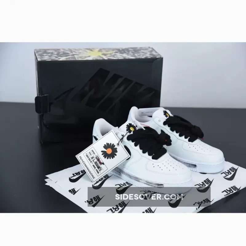 Released by Nike in Fall 2020, the white “Para Noise” colorway is the second Air Force 1 created under G-Dragon’s Peaceminusone fashion label featuring a tear-away design. A cut of white-painted tumbled leather comprises the upper of the shoe, including the perforated toe, mid-panel, and heel. A contrasting black tumbled leather Swoosh appears on either side. Thick black shoe laces and an embroidered floral motif appear on the white leather tongue. Classic “Nike Air” branding is stitched onto the back of the shoe. When the white paint is worn away, it reveals the artist’s artwork underneath. The look is pulled together by black paint brush strokes on the white midsole.