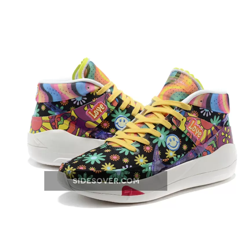 This Nike KD 13 pays homage to the laid-back vibes of 60’s rock music and the effortlessness of KD’s ability to take over a game. This far out colorway features a cream-colored midsole, groovy art graphics on the upper, and a psychedelic pattern on the tongue.