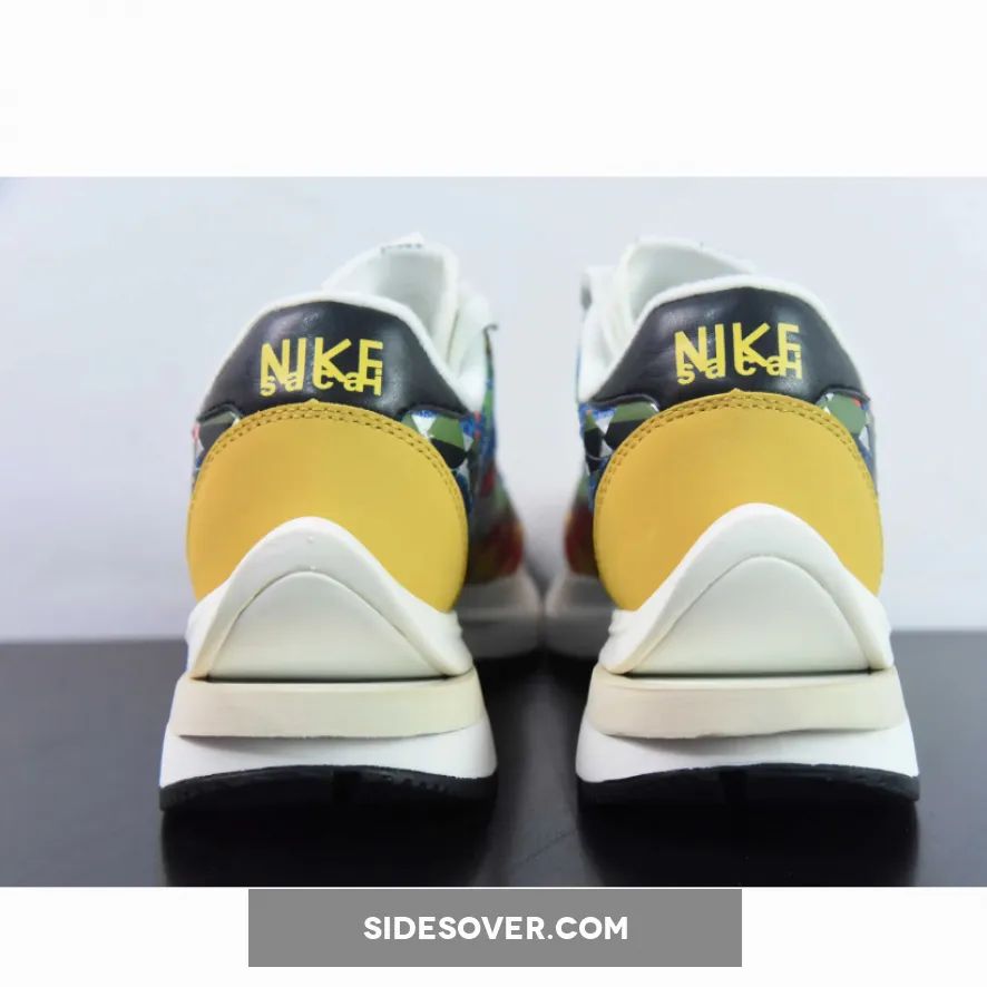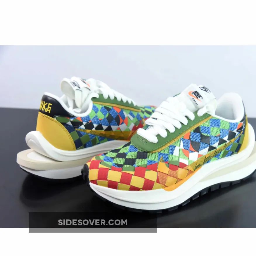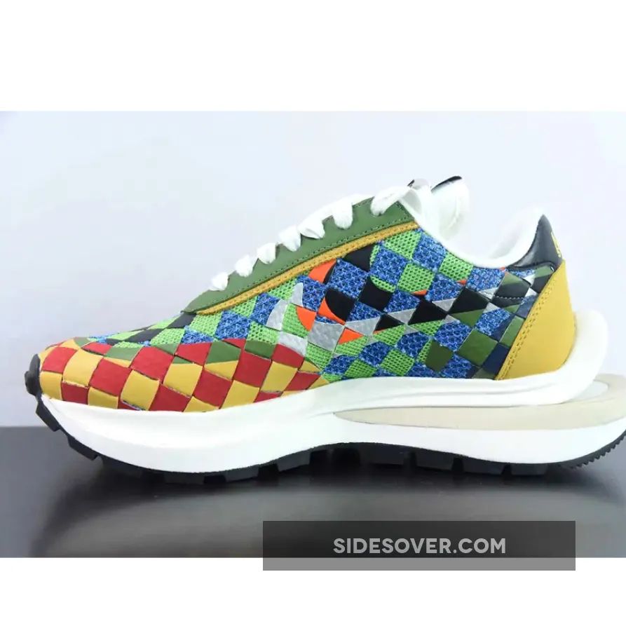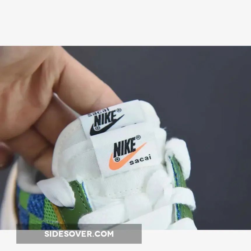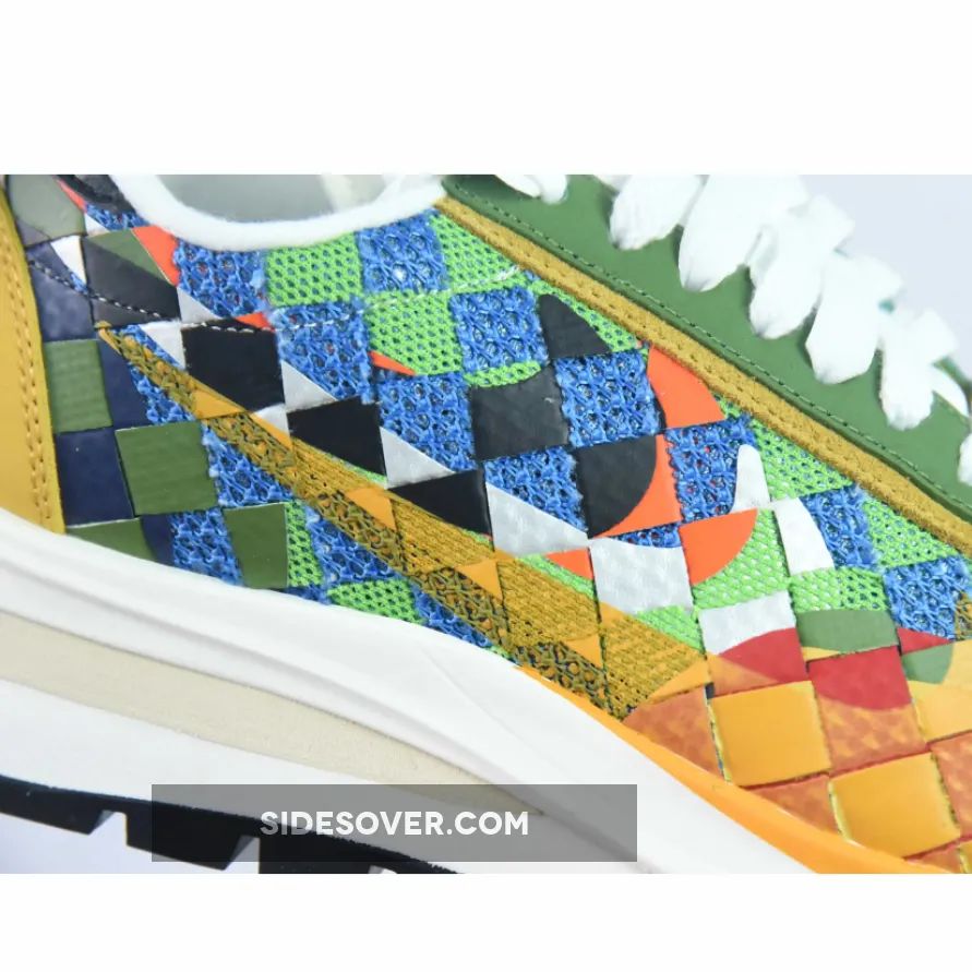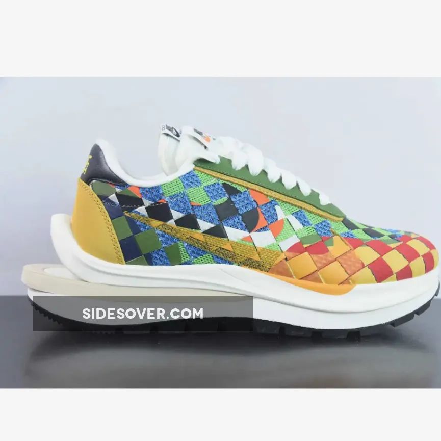 Leather and mesh are woven in a combo of green, red, yellow, and brown near the mudguard and between the upper and sole unit while the base layer features a green mesh spotted throughout the checkerboard design. Suede eyestays host a set of white rope laces that sit atop the doubled tongue which features two hits of sacai x Nike branding.