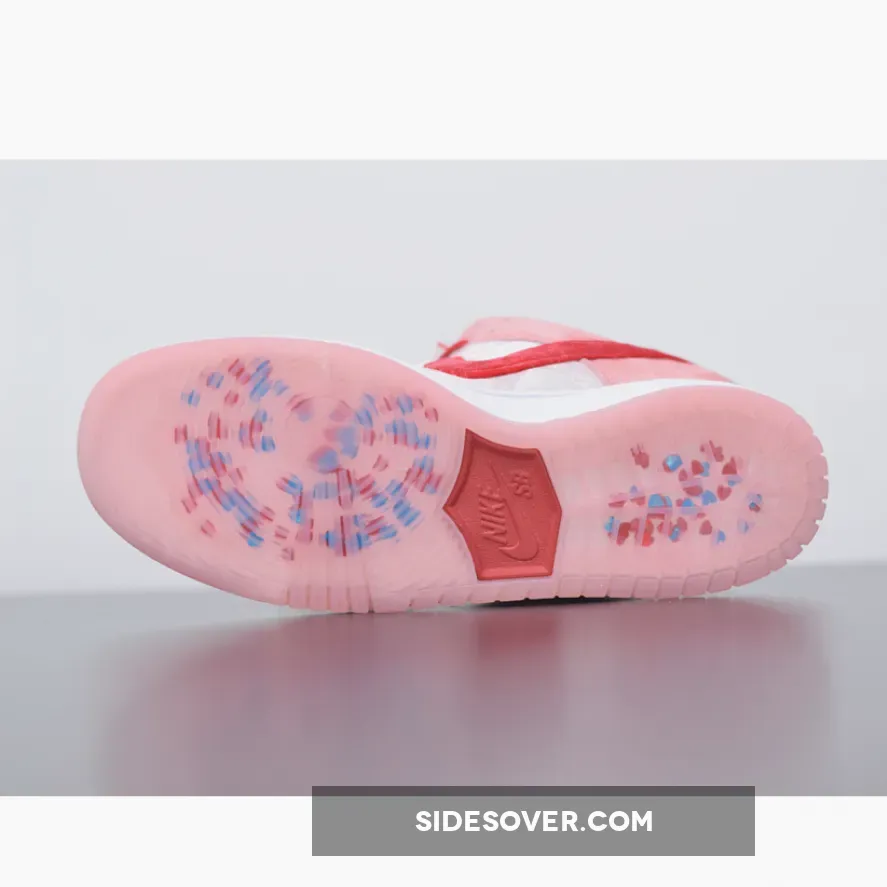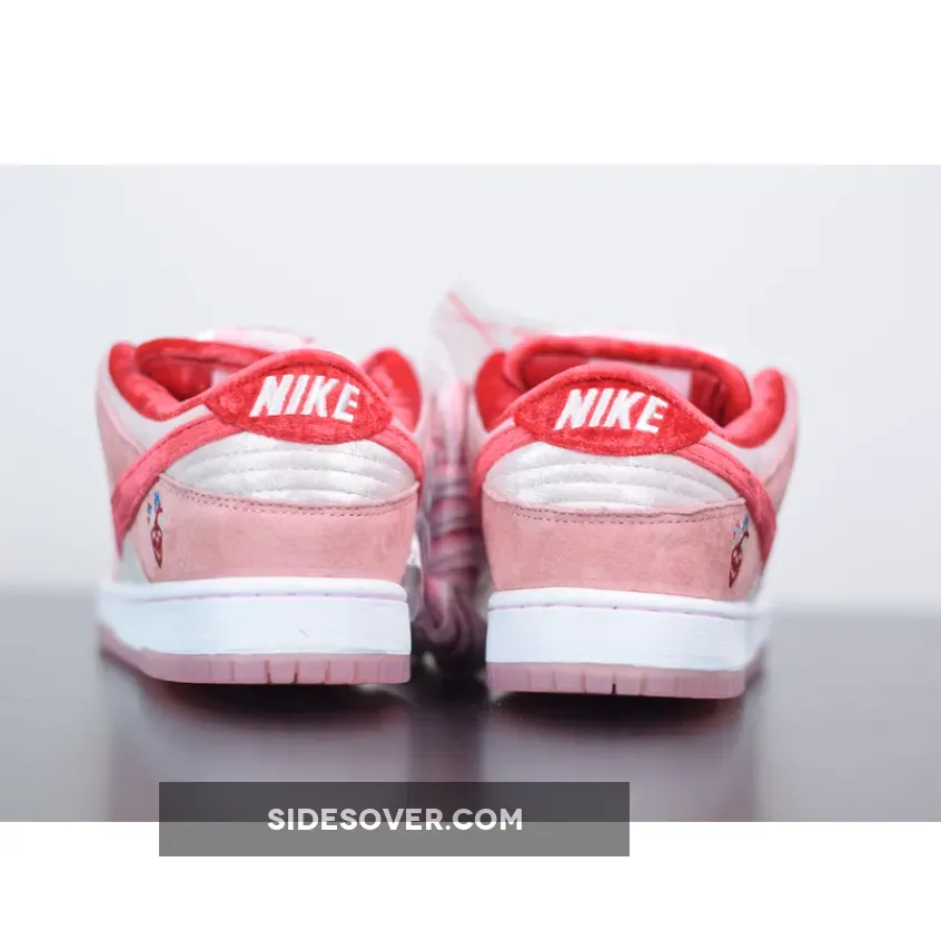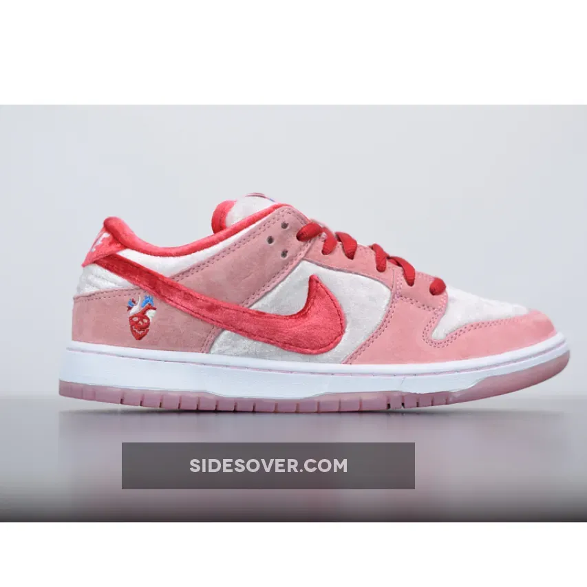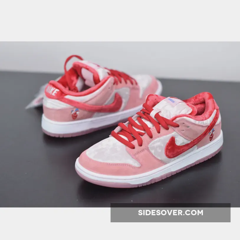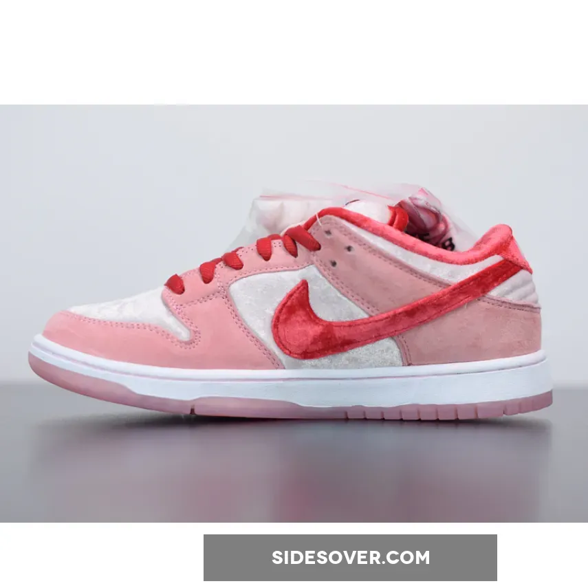 This offering of the Nike SB Dunk Low was designed by legendary artist Sean Cliver and Todd Bratrud. It features Pink suede and velvet panels with contrasting Red accents on the Swooshes, lining, and laces. Other details includes StrangeLove branding on the tongue and graphic printed insoles. A Pink translucent outsole completes the design.