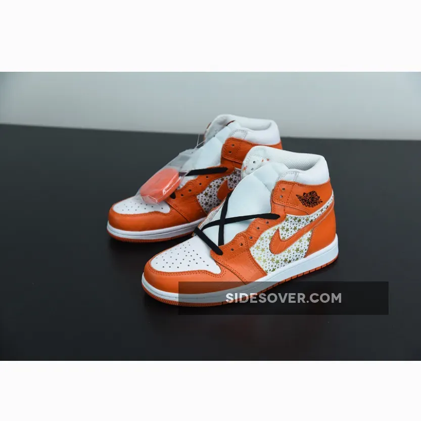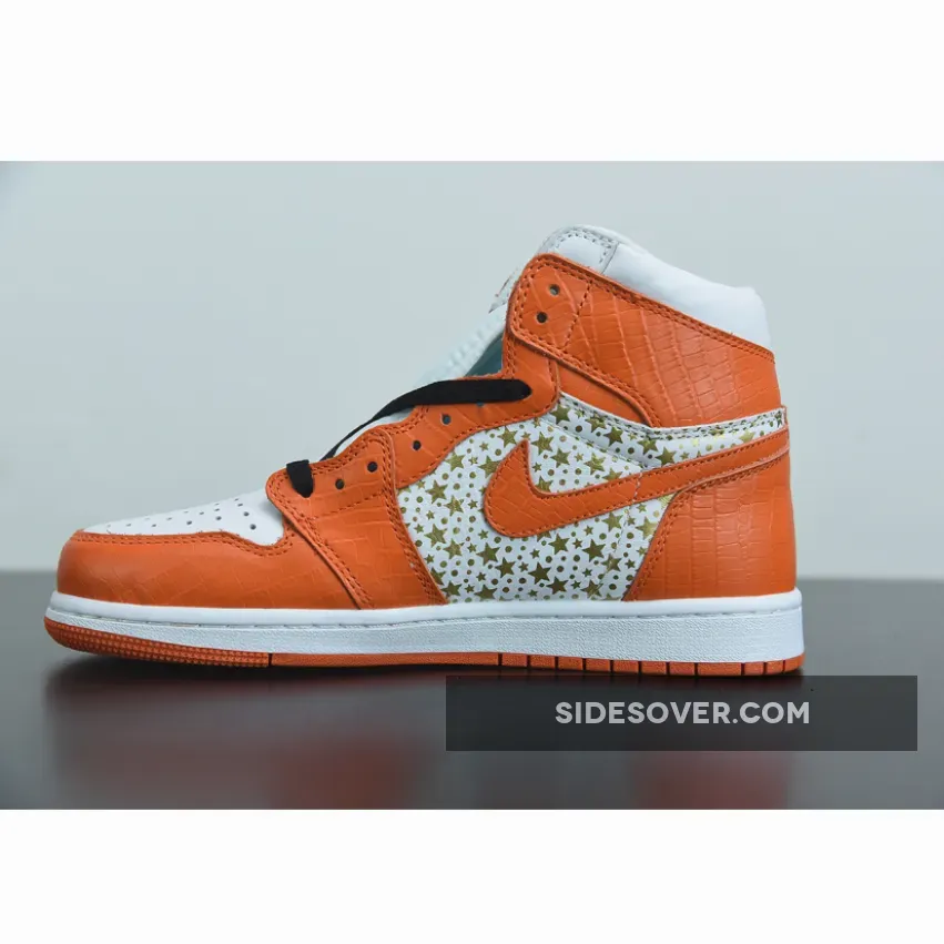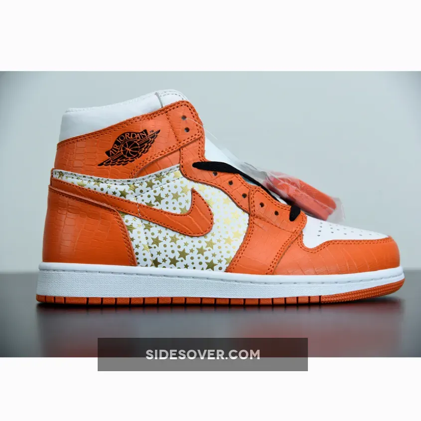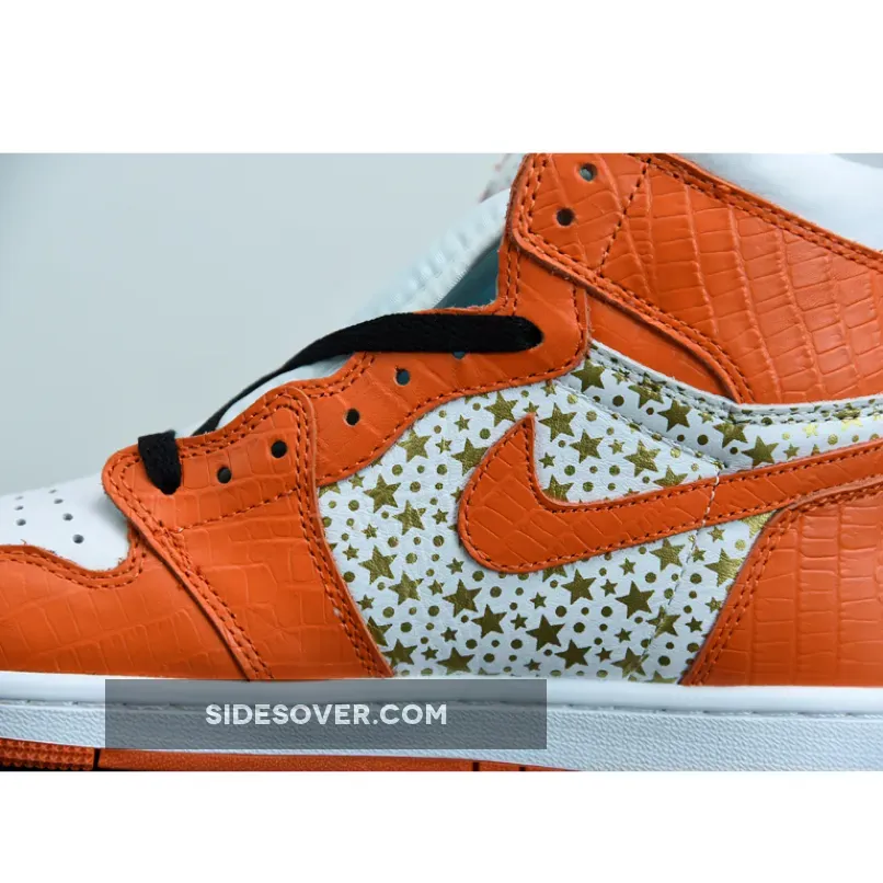 Supreme x Air Jordan 1 High Stars College Orange are ?! Leather upper feels luxurious ?. Gold-tone stars & croc-embossed overlays are trendy