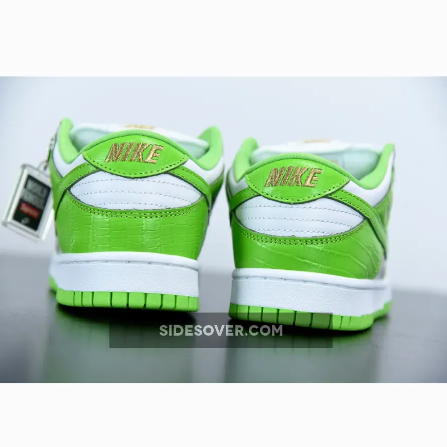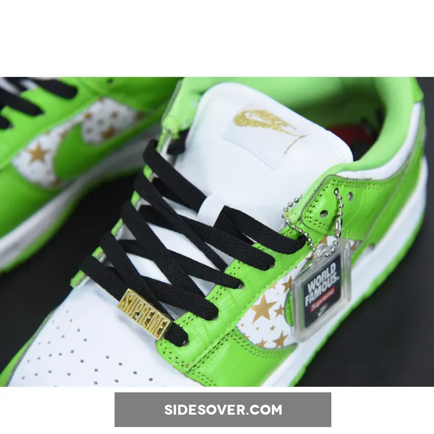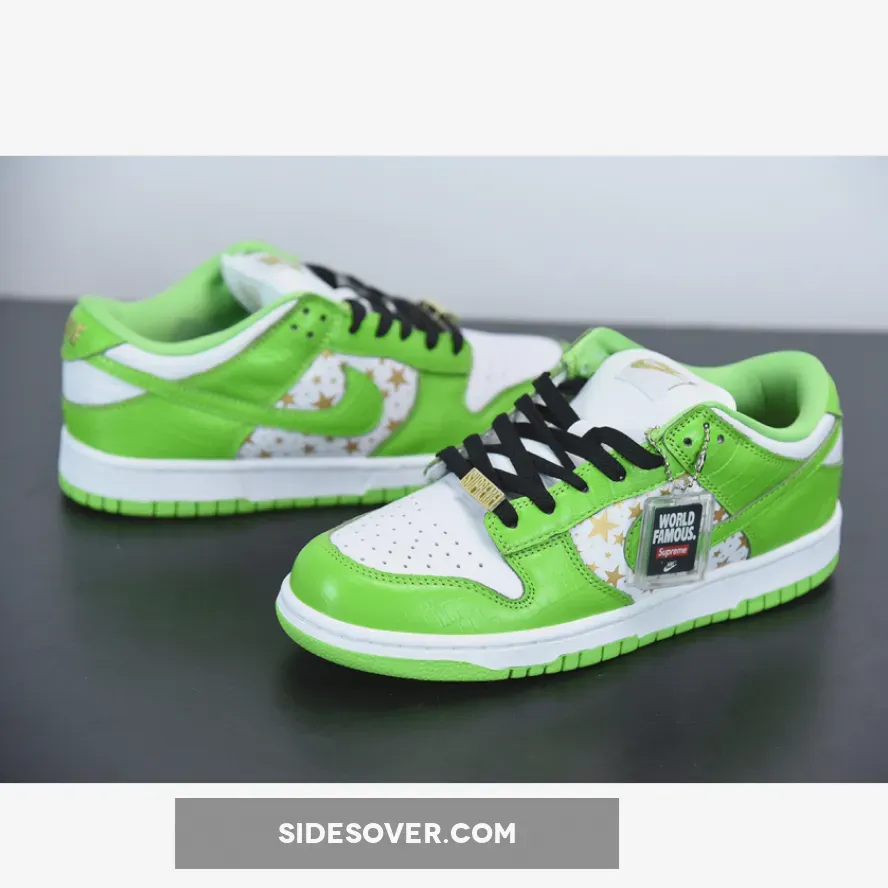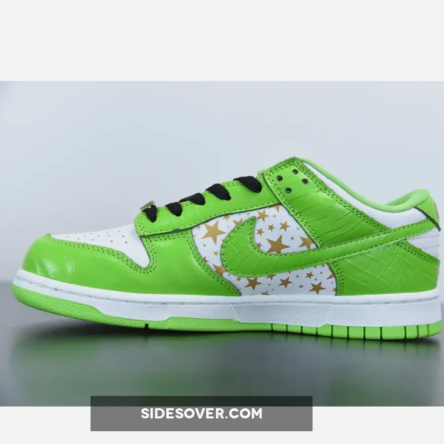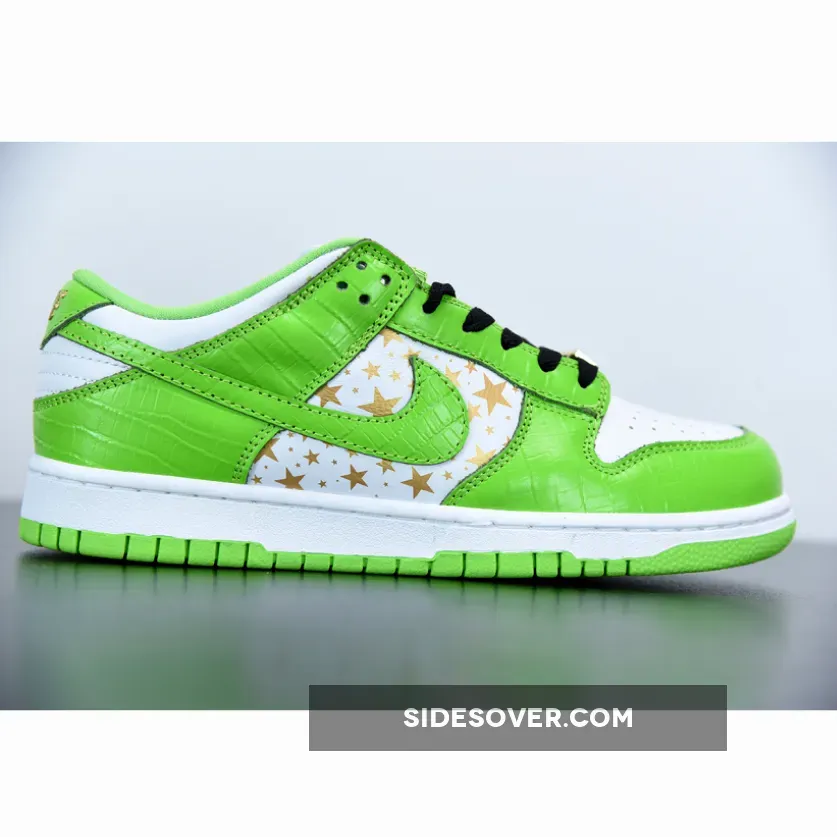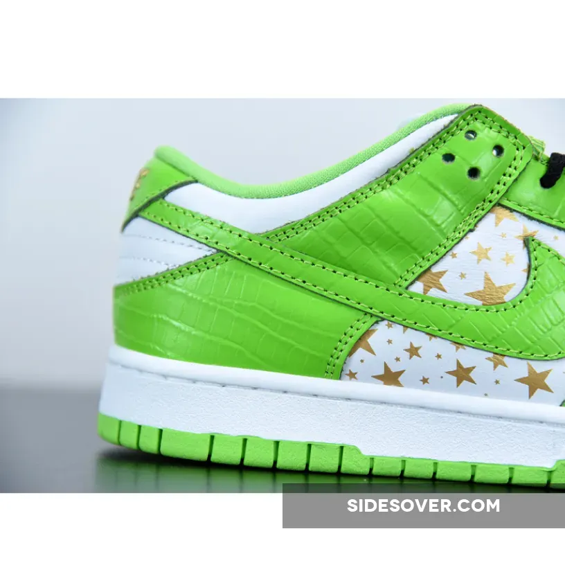 It has been a while since we saw the Swoosh team and New York City-based skate shop Supreme get together to release a pair of Nike Dunks, but the good news is that the Supreme x Nike SB Dunk Low Stars Mean Green is arriving very soon. If you are an avid Supreme collector or simply looking for a new pair of kicks to skate in while still looking stylish on your board, the Supreme x Nike SB Dunk Low Stars Mean Green raffles list is now live for your best chance to cop.Releasing as part of the aforementioned duo’s upcoming SB Dunk Low collaboration this season, official images of the pair boasts a clean combination of white, green, and gold hues throughout. Crafted with a smooth leather upper, a plethora of metallic gold stars we know and love from their initial Dunk High collaboration appears here on the quarter panels. A bold green hue adorns the panels from heel to toe constructed with faux crocodile leather textiles for a luxurious rugged look.While the upper is complete with typical Nike branding details, such as Swoosh logos on the side panels and labelled tongue tags, a blanched-out midsole lined with a durable rubber outsole sits beneath the feet to offer the user comfort that you’ll seek daily.This shoe will undeniably elevate your sneaker collection so if you are planning to cop the Supreme Nike SB Dunk Low Mean Green, stay up to date with us here at Our Store Supplier for the latest information as they are expected to drop next week on the 4th of March.